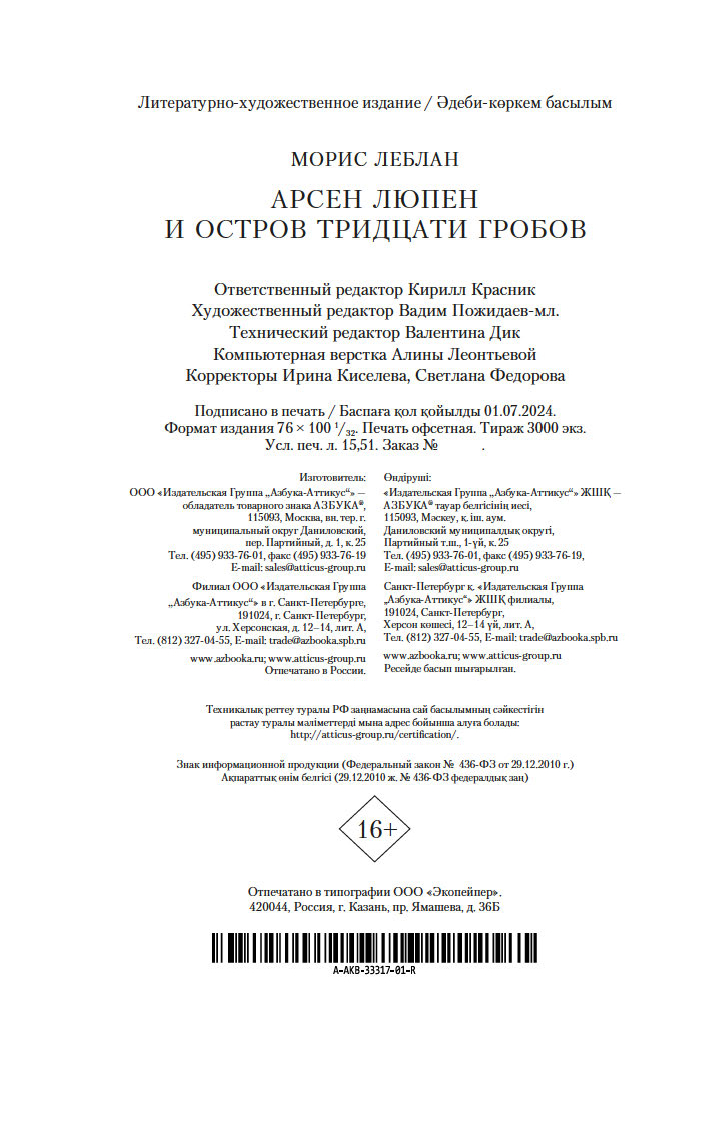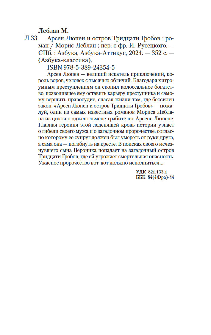 Арсен Люпен – великий искатель приключений, король воров, человек с тысячью обличий. Благодаря хитроумным преступлениям он скопил колоссальное богатство, позволившее ему оставить карьеру преступника и самому вершить правосудие, спасая жизни там, где бессилен закон. "Арсен Люпен и остров Тридцати Гробов" – пожалуй, один из самых известных романов Мориса Леблана из цикла о "джентльмене-грабителе" Арсене Люпене. Главная героиня этой леденящей кровь истории узнает о гибели своего мужа и о загадочном пророчестве, согласно которому ее супруг должен был умереть от руки друга, а сама она – погибнуть на кресте. В поисках своего исчезнувшего сына Вероника попадает на загадочный остров Тридцати Гробов, где ей угрожает смертельная опасность. Ужасное пророчество вот-вот должно исполниться...