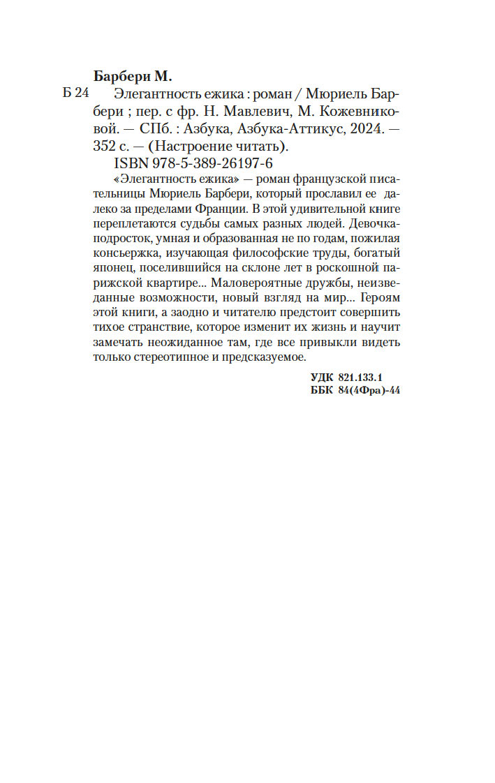 "Элегантность ежика" – роман французской писательницы Мюриель Барбери, который прославил ее далеко за пределами Франции. В этой удивительной книге переплетаются судьбы самых разных людей. Девочка-подросток, умная и образованная не по годам, пожилая консьержка, изучающая философские труды, богатый японец, поселившийся на склоне лет в роскошной парижской квартире... Маловероятные дружбы, неизведанные возможности, новый взгляд на мир... Героям этой книги, а заодно и читателю предстоит совершить тихое странствие, которое изменит их жизнь и научит замечать неожиданное там, где все привыкли видеть только стереотипное и предсказуемое.