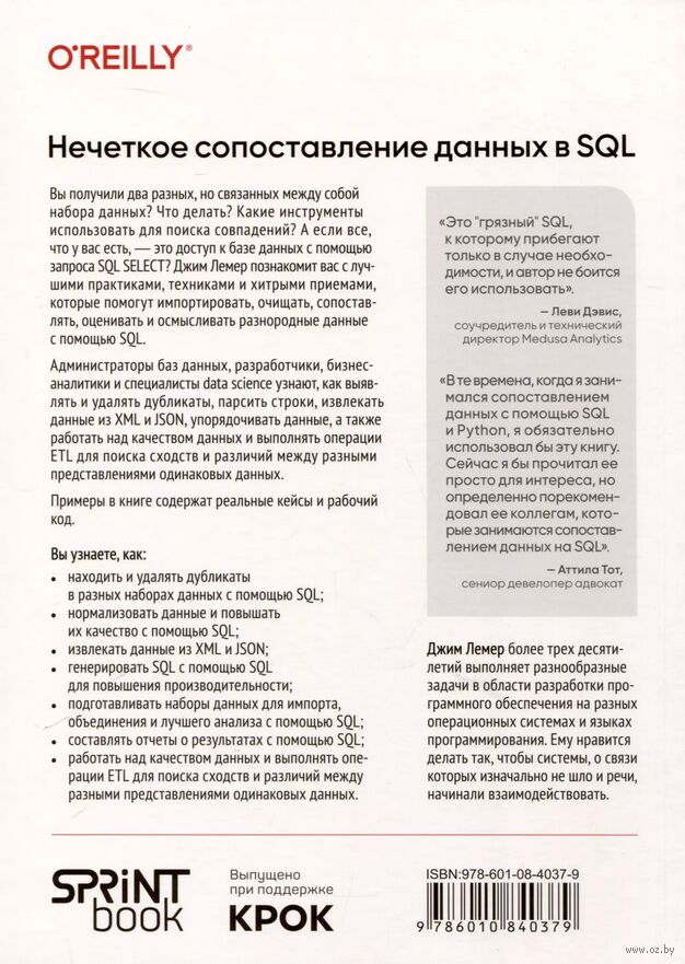 Вы получили два разных, но связанных между собой набора данных? Что делать? Какие инструменты использовать для поиска совпадений? А если все, что у вас есть, – это доступ к базе данных с помощью запроса SQL SELECT? Джим Лемер познакомит вас с лучшими практиками, техниками и хитрыми приемами, которые помогут импортировать, очищать, сопоставлять, оценивать и осмысливать разнородные данные с помощью SQL.