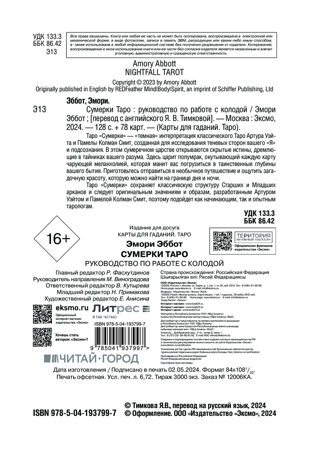 В Таро "Сумерки" Эмори Эббота царит полумрак, окутывающий каждую карту чарующей меланхолией. Эта колода была создана для исследования теневых сторон вашего "Я" и глубин подсознания. Здесь открываются скрытые истины, дремлющие в тайниках вашего разума. Приготовьтесь отправиться в необычное путешествие и ощутить загадочную красоту, которую можно найти на границе дня и ночи.