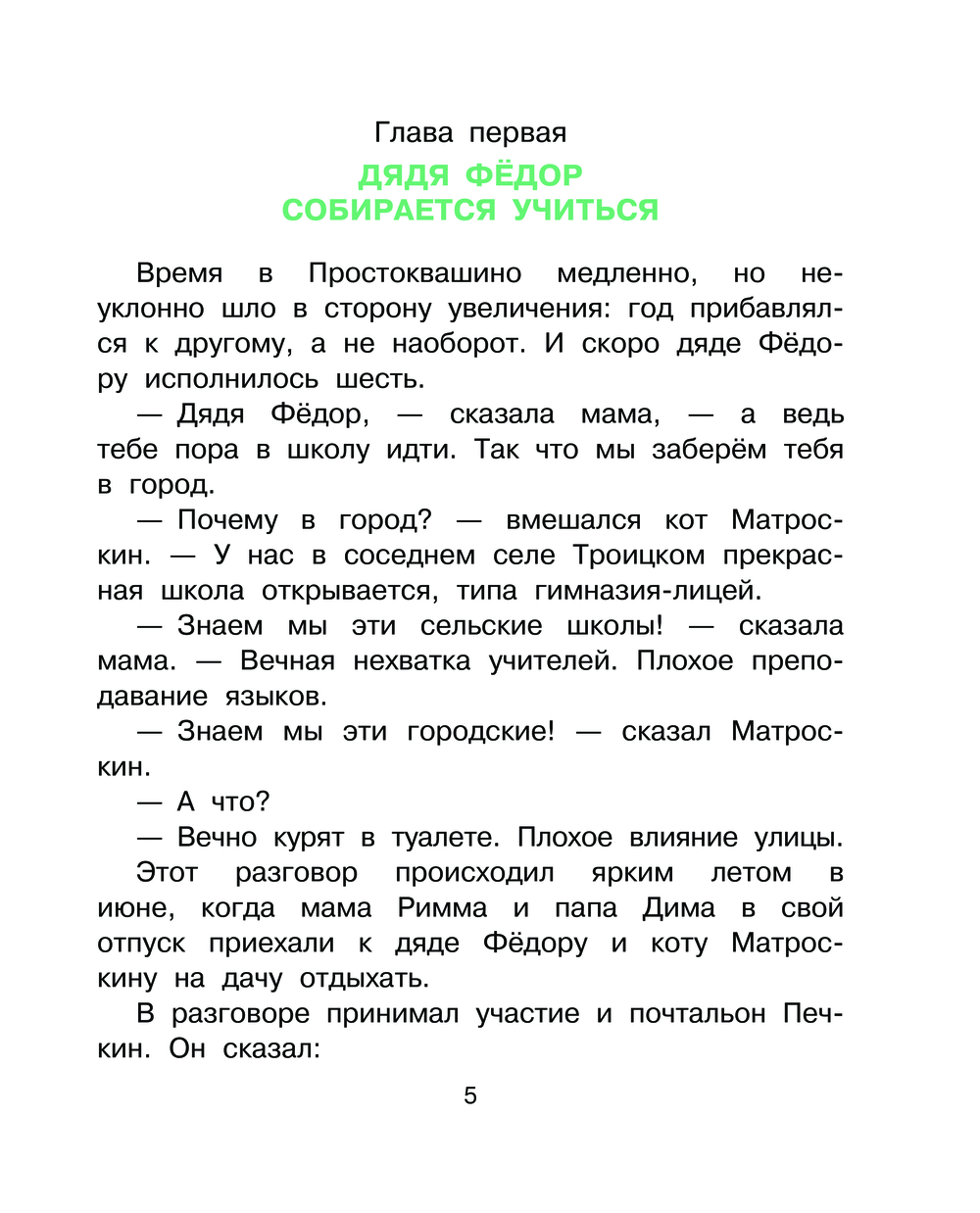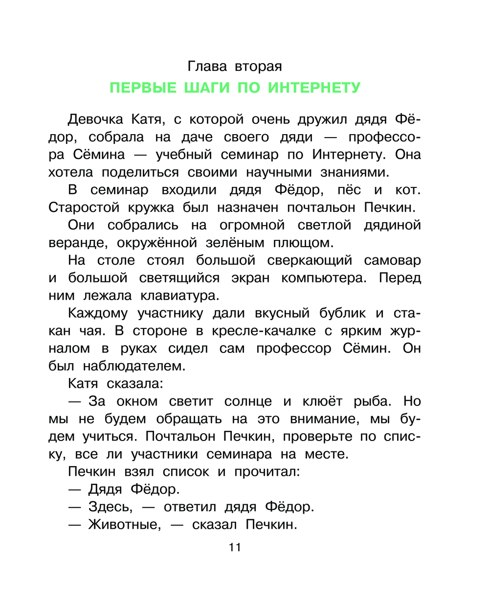 "Дядя Фёдор идёт в школу, или Нэт из Интернет" – ещё одна знаменитая повесть-сказка из цикла повестей о Простоквашино. Дядя Фёдор вырос, ему пора в школу. Вместе с ним на подготовительные занятия даже почтальон Печкин собрался, а Шарик и Матроскин дома готовились к школе. Но тут их общая подруга Катя решила всем простоквашинцам показать, что такое Интернет. Тоже полезный навык при подготовке к школе. Что из этого вышло, и как Интернет повлиял на сельскую жизнь неразлучных друзей читайте в этой книге.