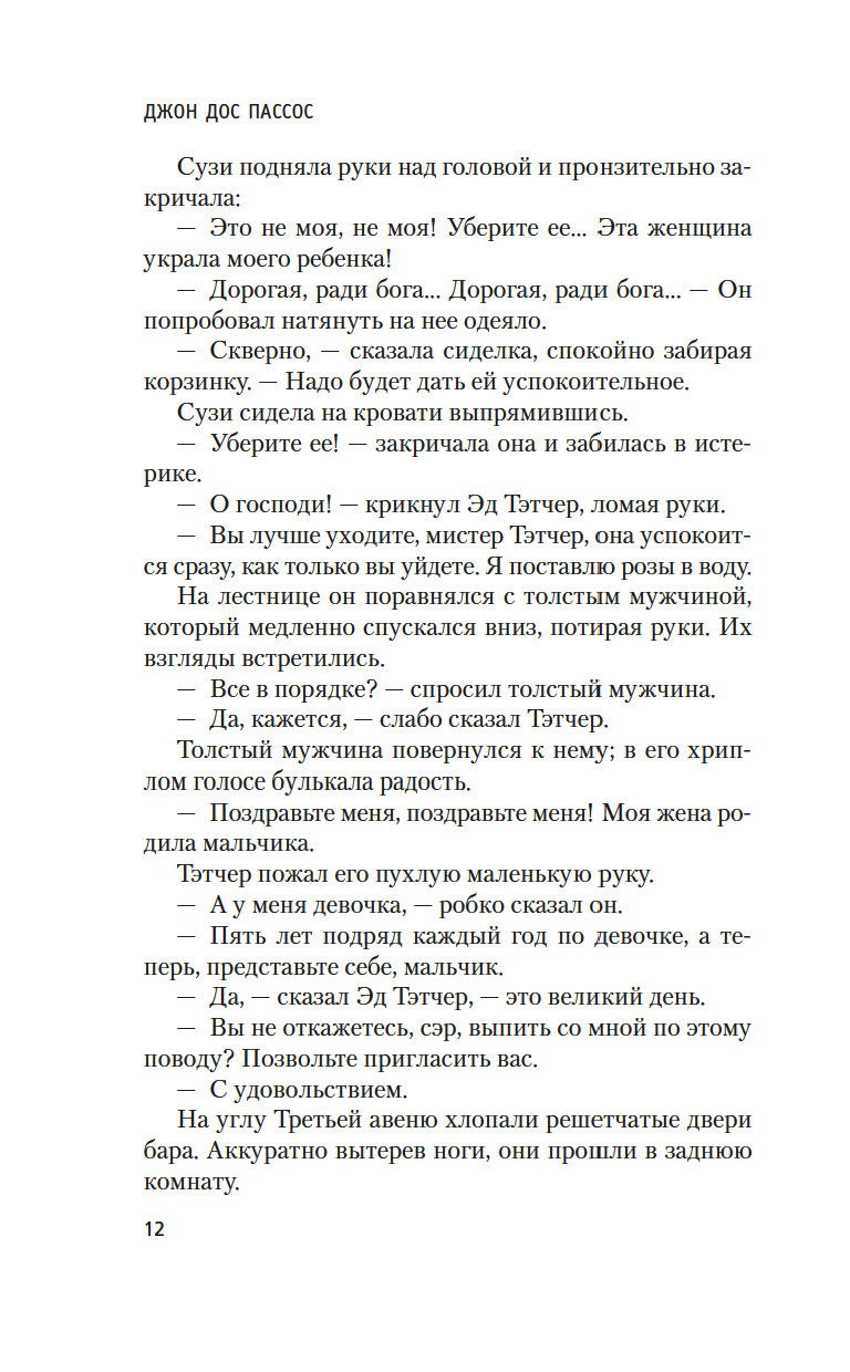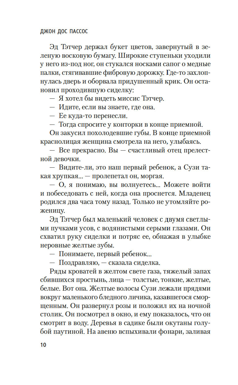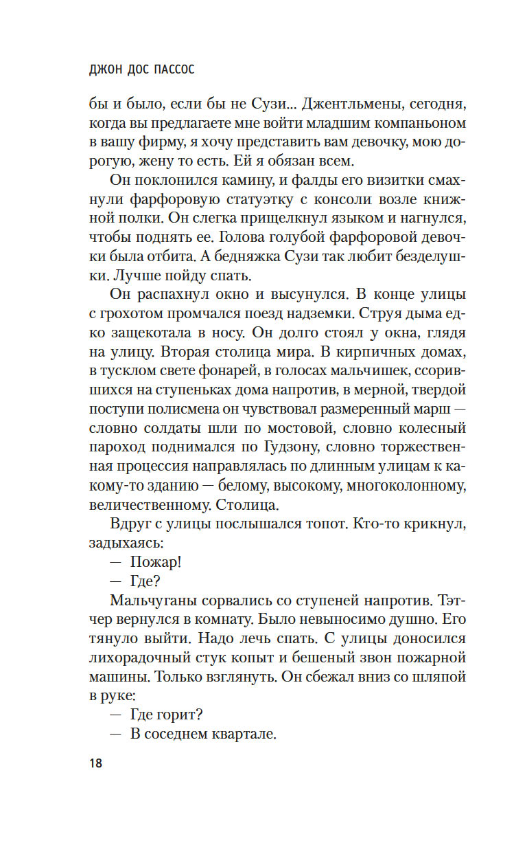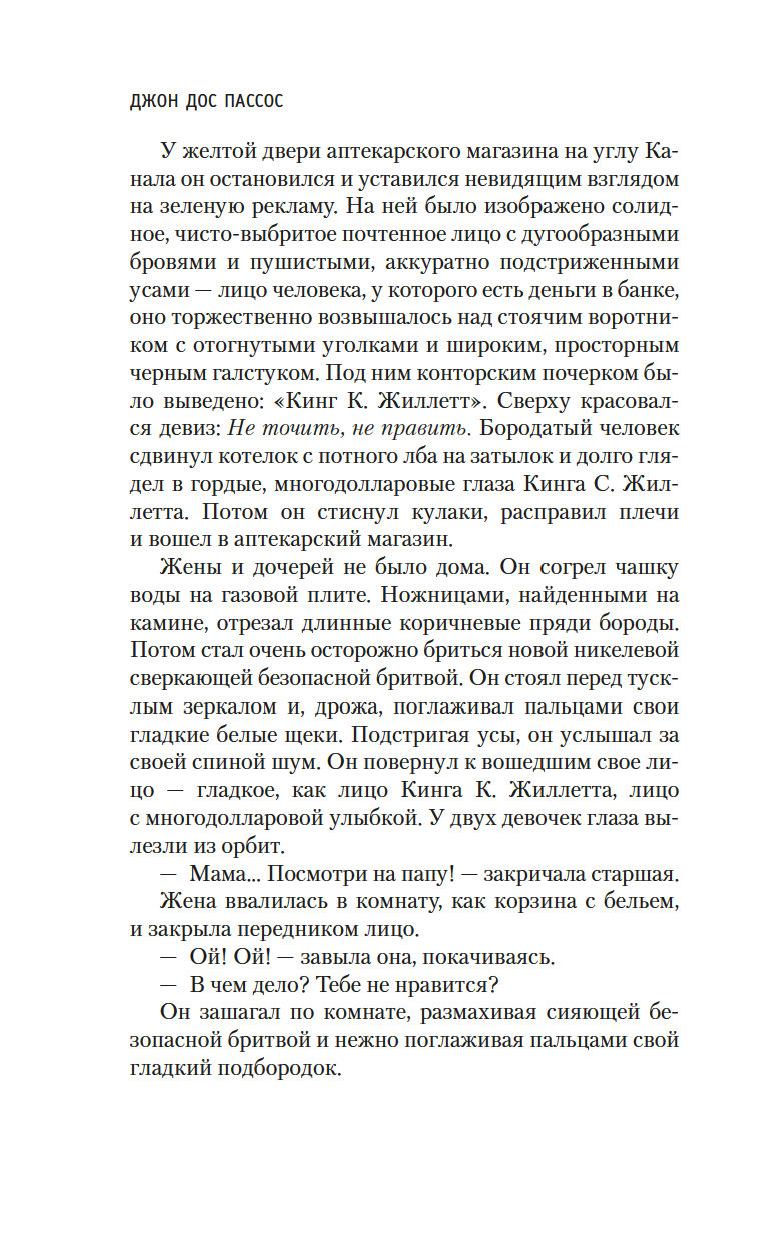 Джон Дос Пассос (1896-1970) – американский писатель португальского происхождения, прозаик, драматург и эссеист, при жизни ставший классиком литературы США. Неповторимый творческий почерк и смелость в поисках новых форм снискали ему славу художника-экспериментатора, а созданные им произведения представляют собой уникальную по широте охвата панораму жизни Америки на заре XX века. Главный труд и вершина творчества Дос Пассоса – монументальная эпопея "США".