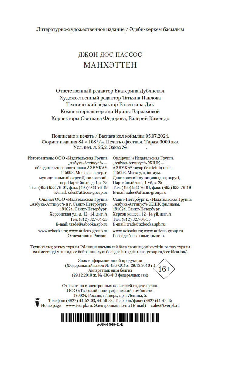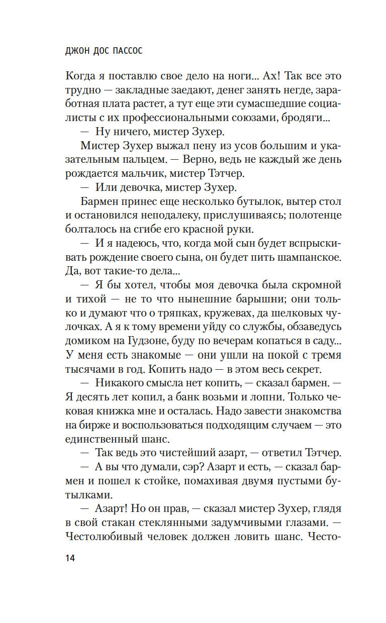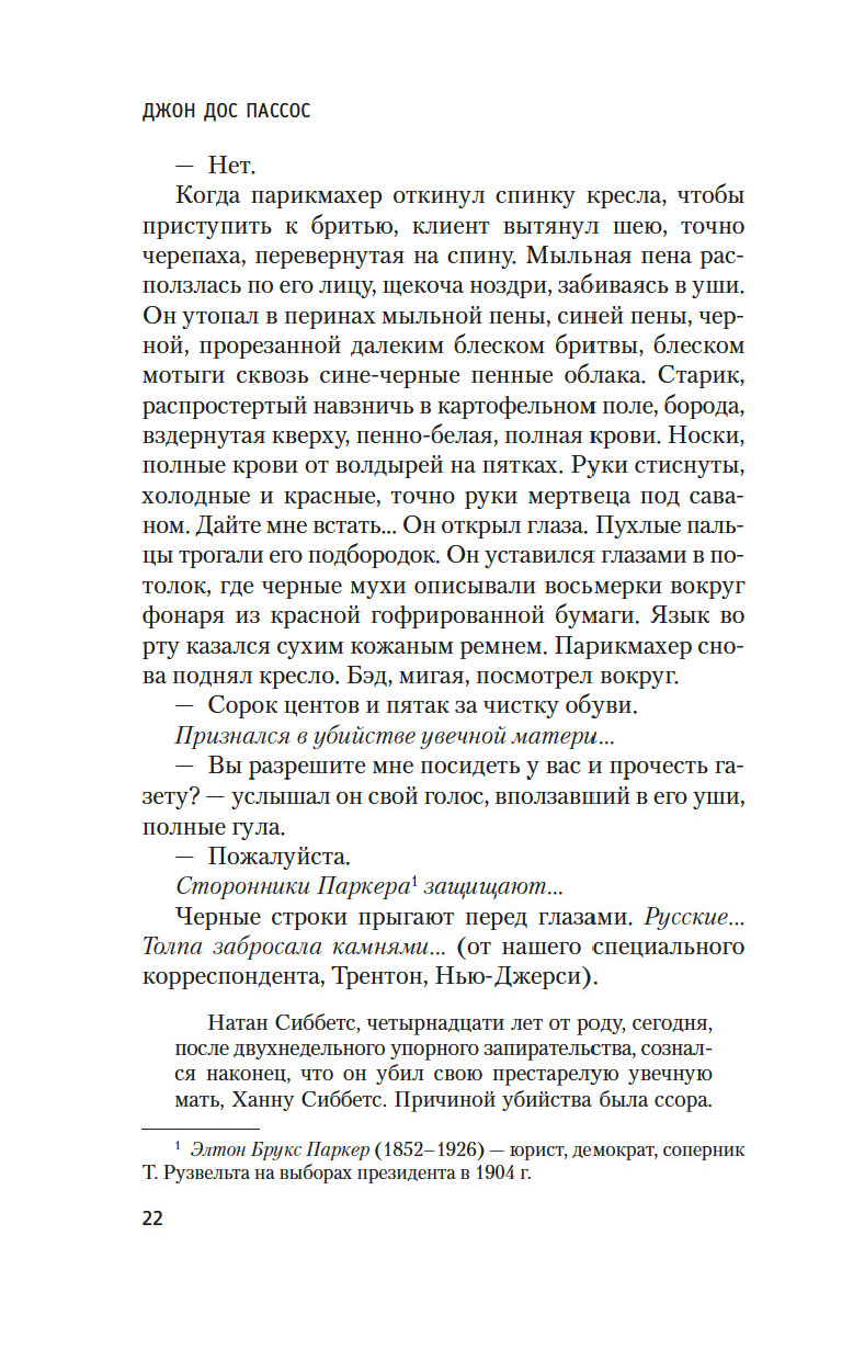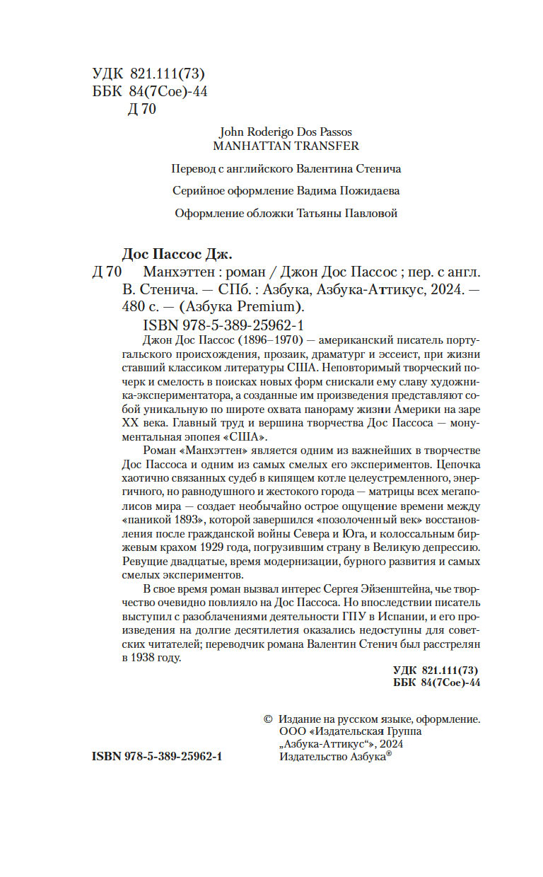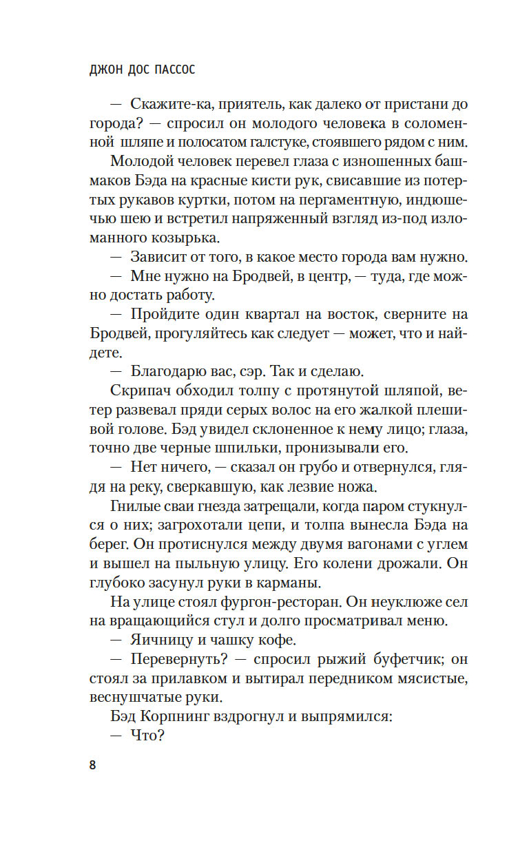 Джон Дос Пассос (1896-1970) – американский писатель португальского происхождения, прозаик, драматург и эссеист, при жизни ставший классиком литературы США. Неповторимый творческий почерк и смелость в поисках новых форм снискали ему славу художника-экспериментатора, а созданные им произведения представляют собой уникальную по широте охвата панораму жизни Америки на заре XX века. Главный труд и вершина творчества Дос Пассоса – монументальная эпопея "США".