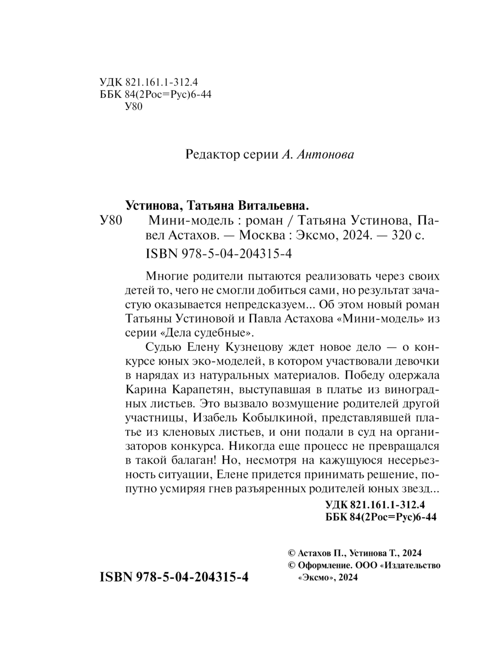 Многие родители пытаются реализовать через своих детей то, чего не смогли добиться сами, но результат зачастую оказывается непредсказуем... Об этом новый роман Татьяны Устиновой и Павла Астахова "Мини-модель" из серии "Дела судебные".