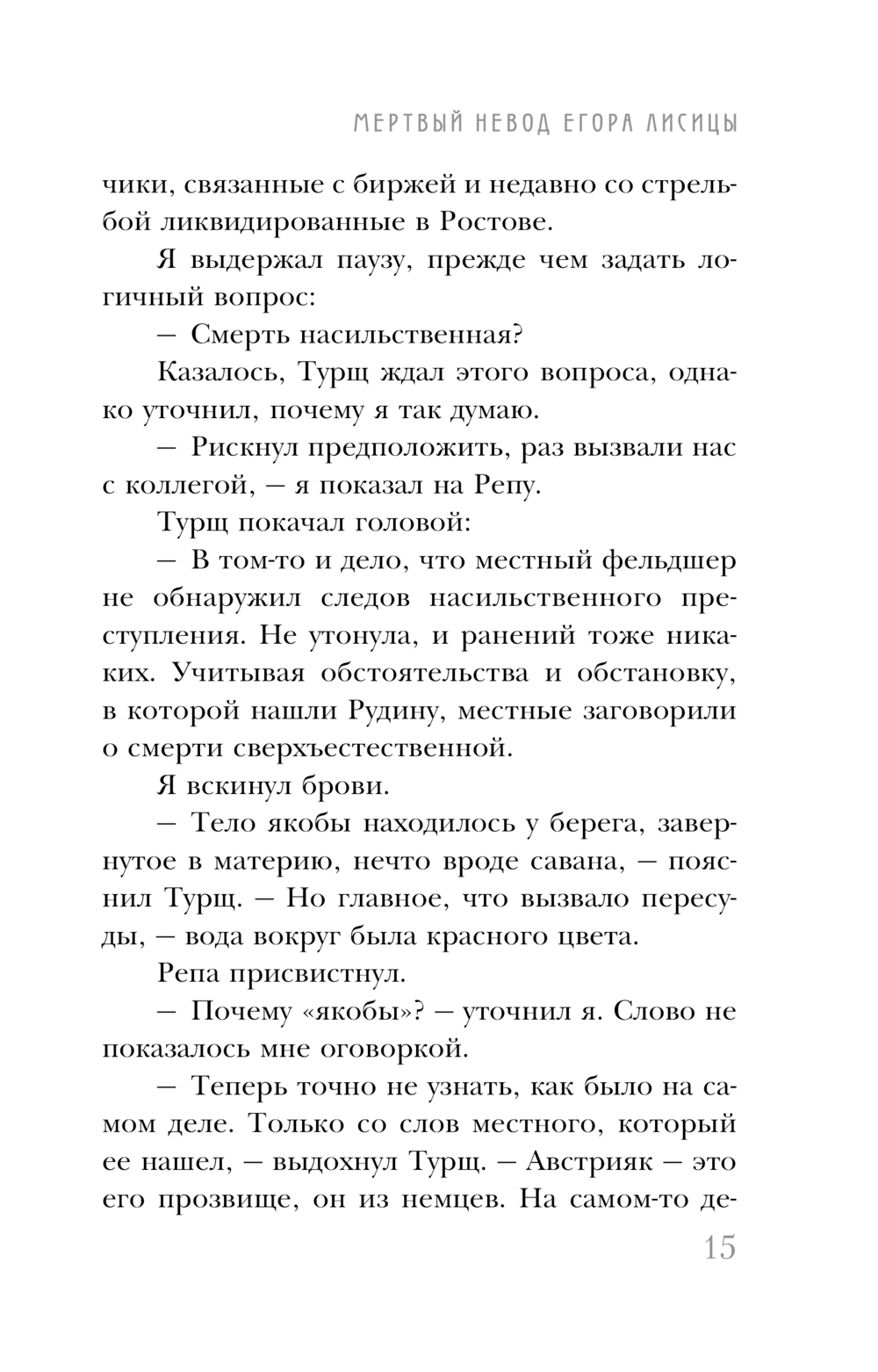 Чтобы разобраться в причинах ее смерти и развеять слухи, в поселок приезжает сотрудник областного УГРО, врач-криминалист Егор Лисица. Он сталкивается с тем, что в прибрежных селах творится форменная чертовщина: местных жителей терроризирует... нечистая сила! Сложно поверить, но в этом сходятся все свидетели...