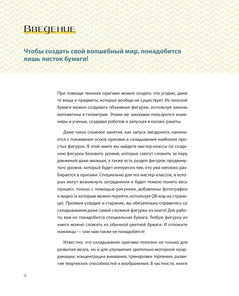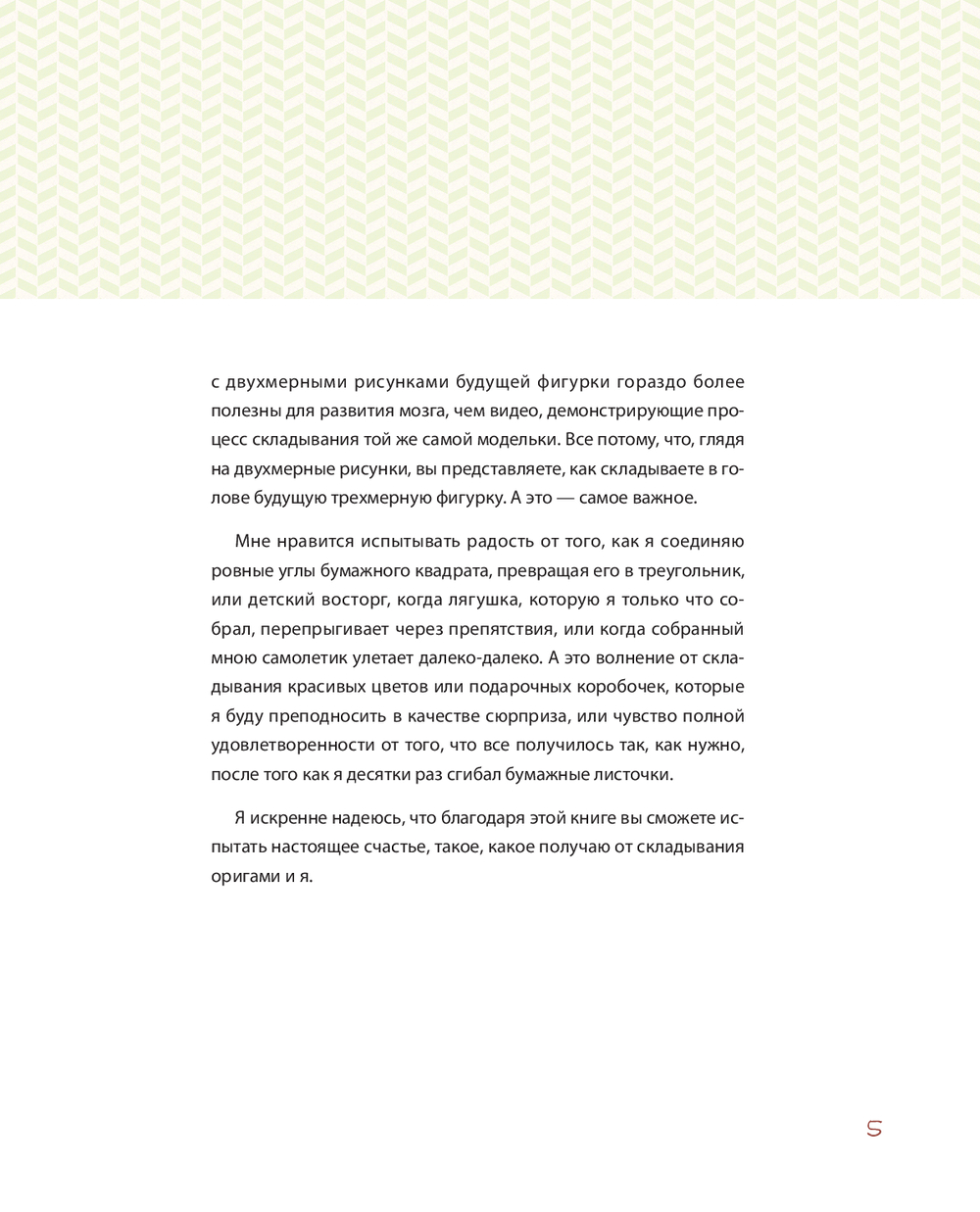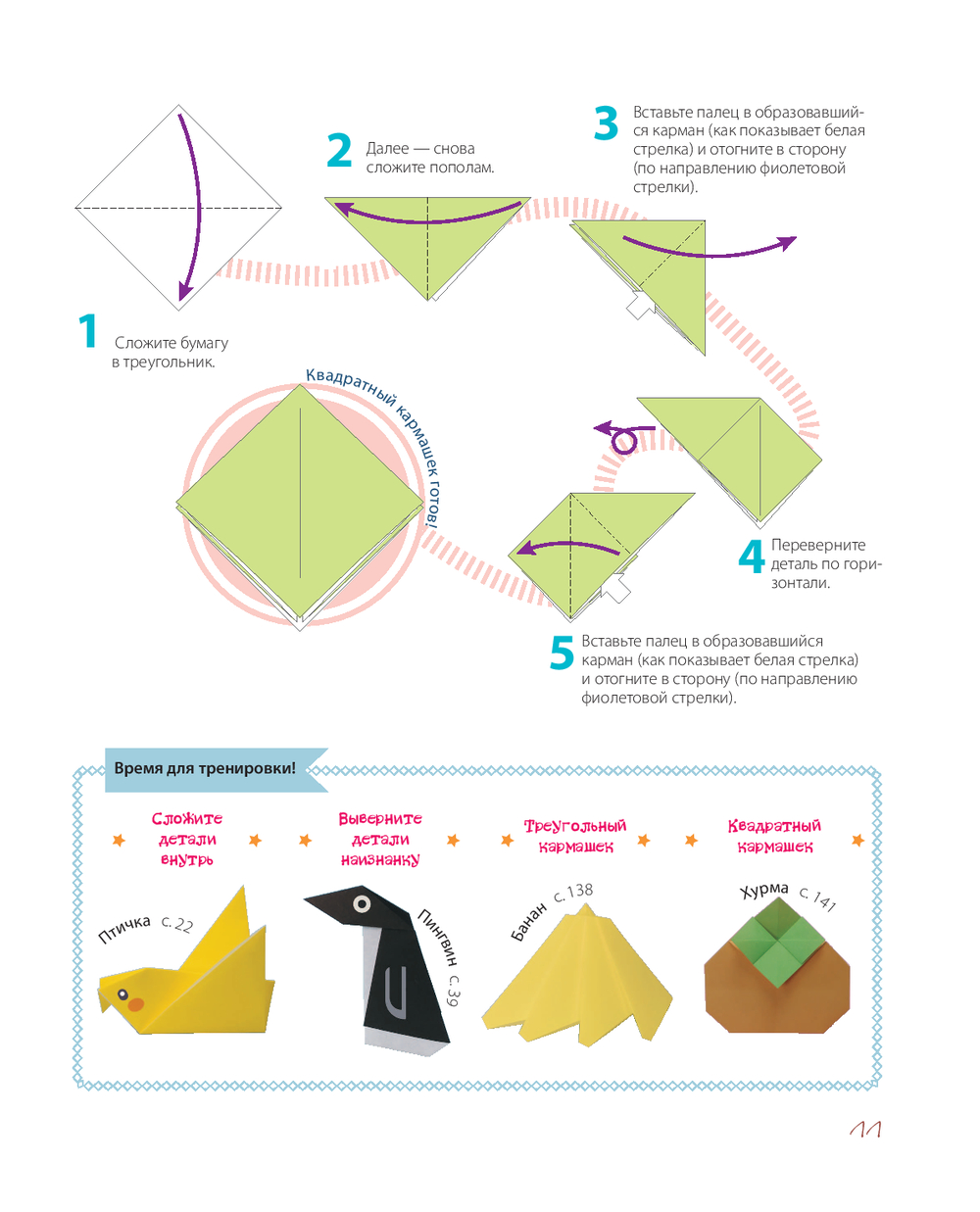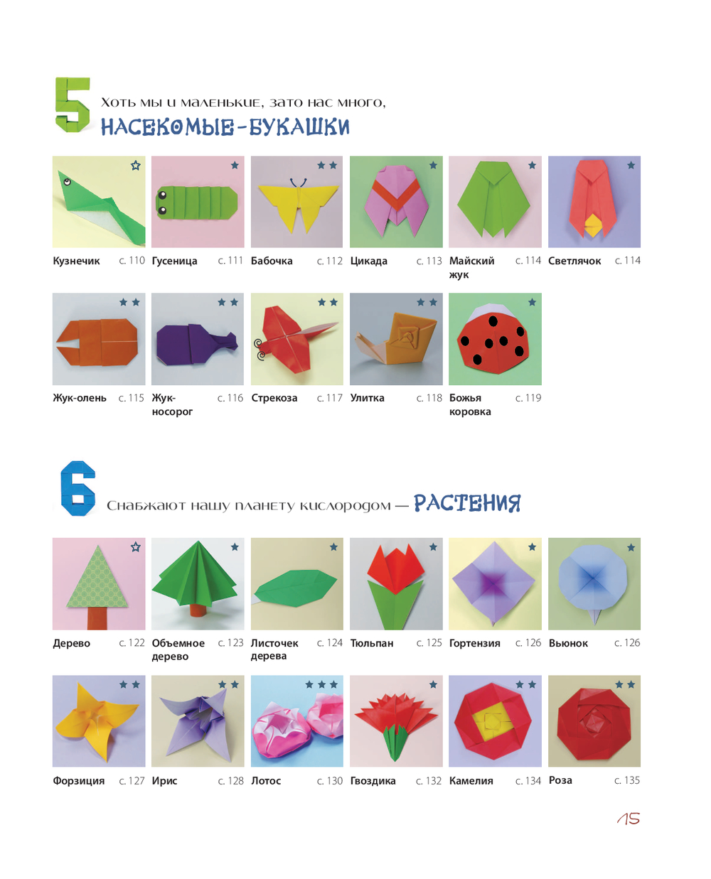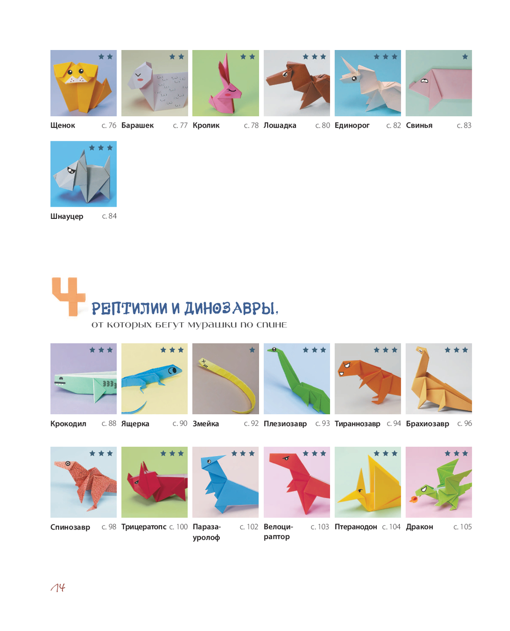 Забудьте о наскучивших бумажных лягушках и журавликах: в книге вас ждут 10 тематических разделов и с огромным разнообразием моделей на любой вкус и цвет! Флора, фауна, техника, транспорт и даже предметы гардероба – каждый найдет для себя фигурку по душе. А сложить понравившуюся модельку не составит никаких усилий, ведь для их создания не нужны ни клей, ни ножницы – достаточно нескольких листов цветной бумаги!