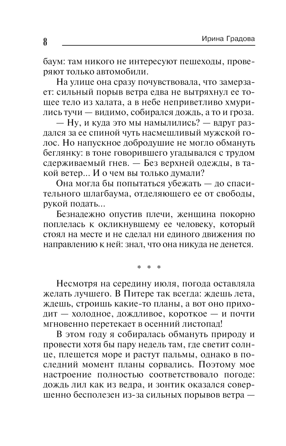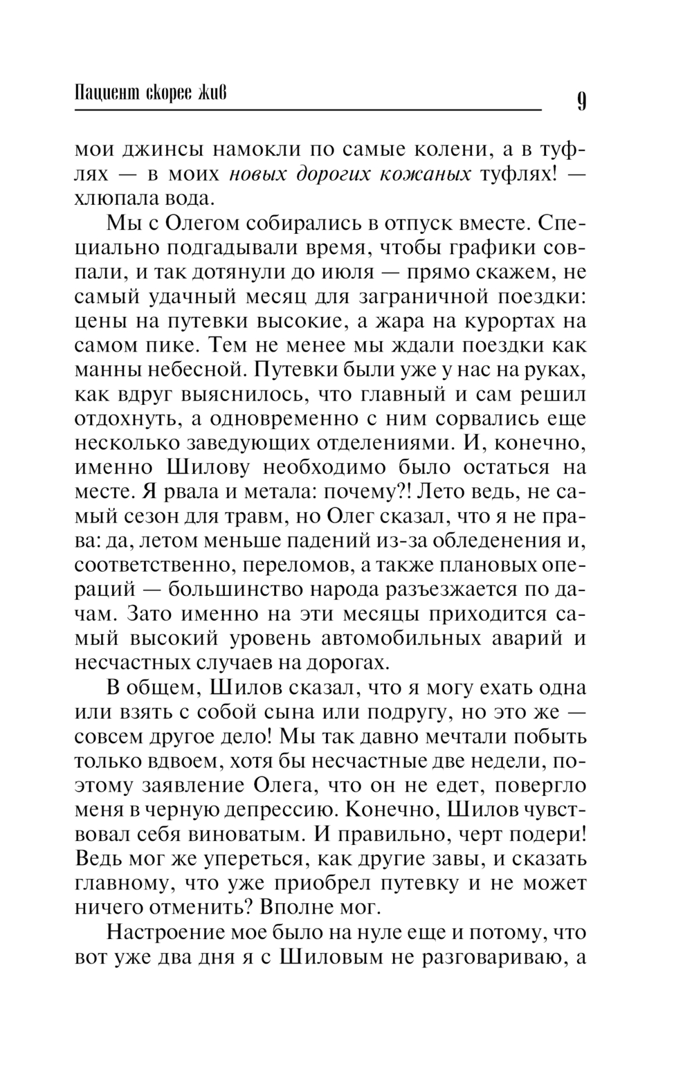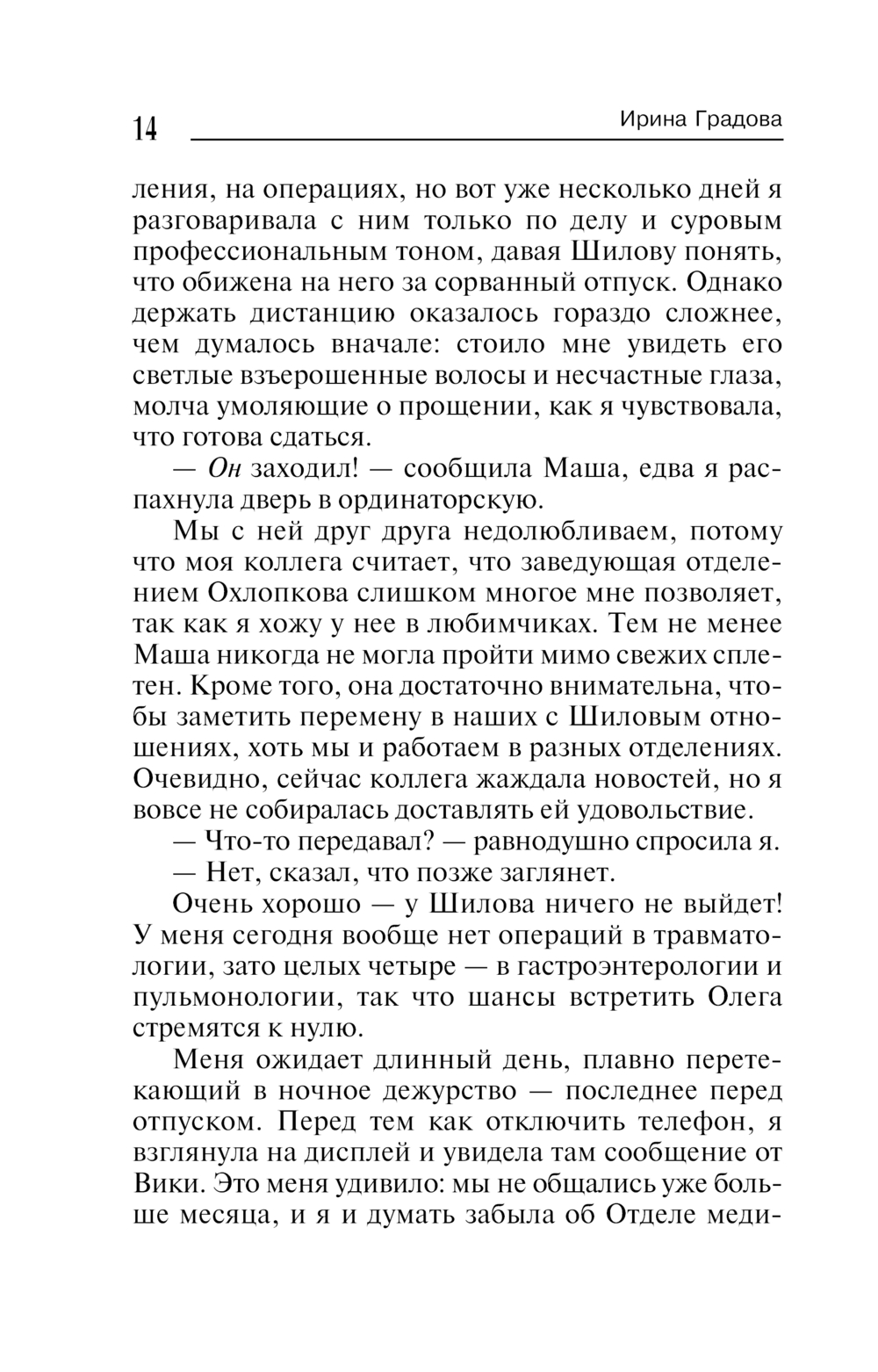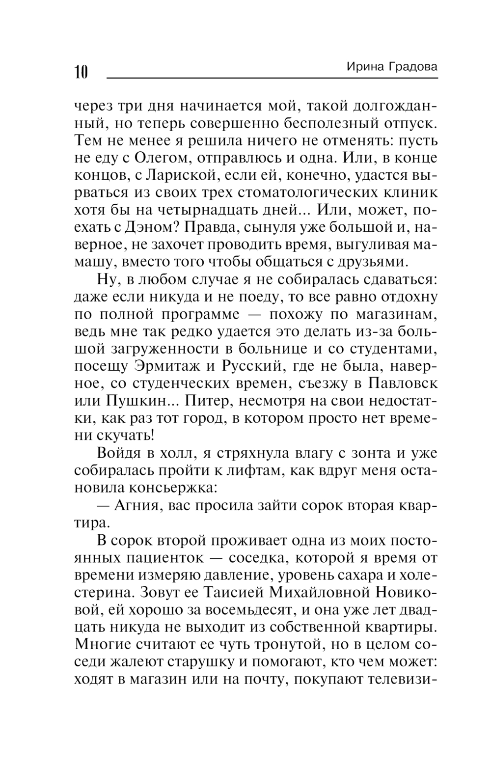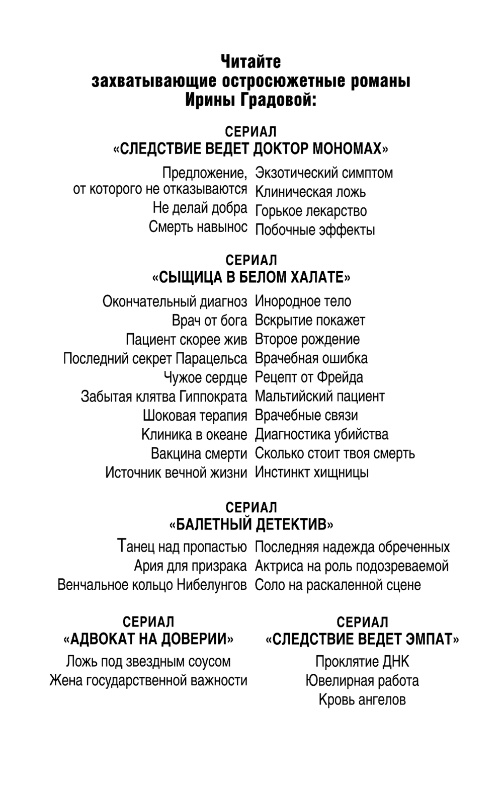 Врач Агния Смольская предвкушала долгожданный отдых на Средиземном море в обществе любимого мужчины. Но главврач не отпустил Олега в отпуск! Что же делать: поехать одной или отказаться от путевки? Агния выбрала третий вариант и согласилась на предложение руководителя отдела медицинских расследований. Так вместо отеля на побережье она оказалась в Светлогорской больнице, за которой уже давно тянулась дурная слава: оттуда бесследно исчезали пациенты...