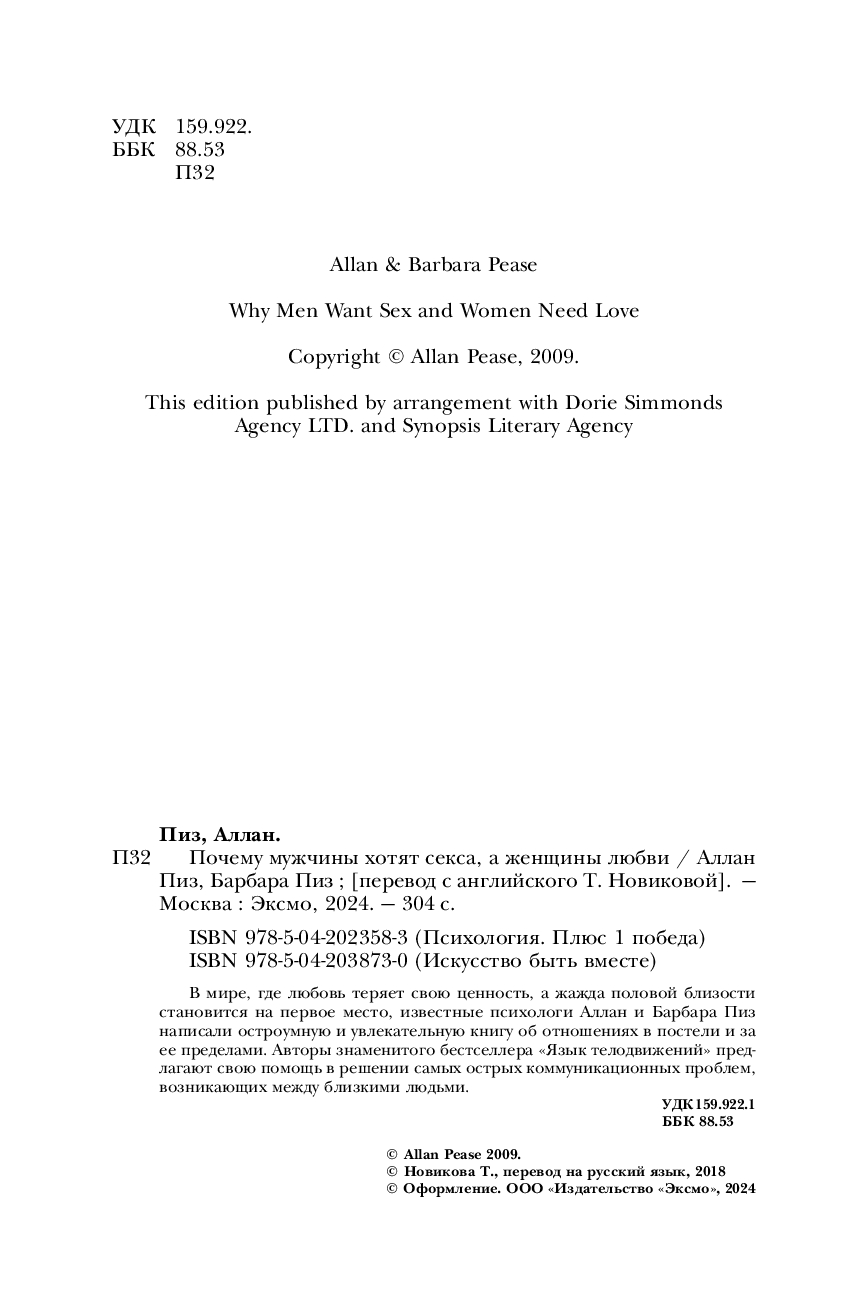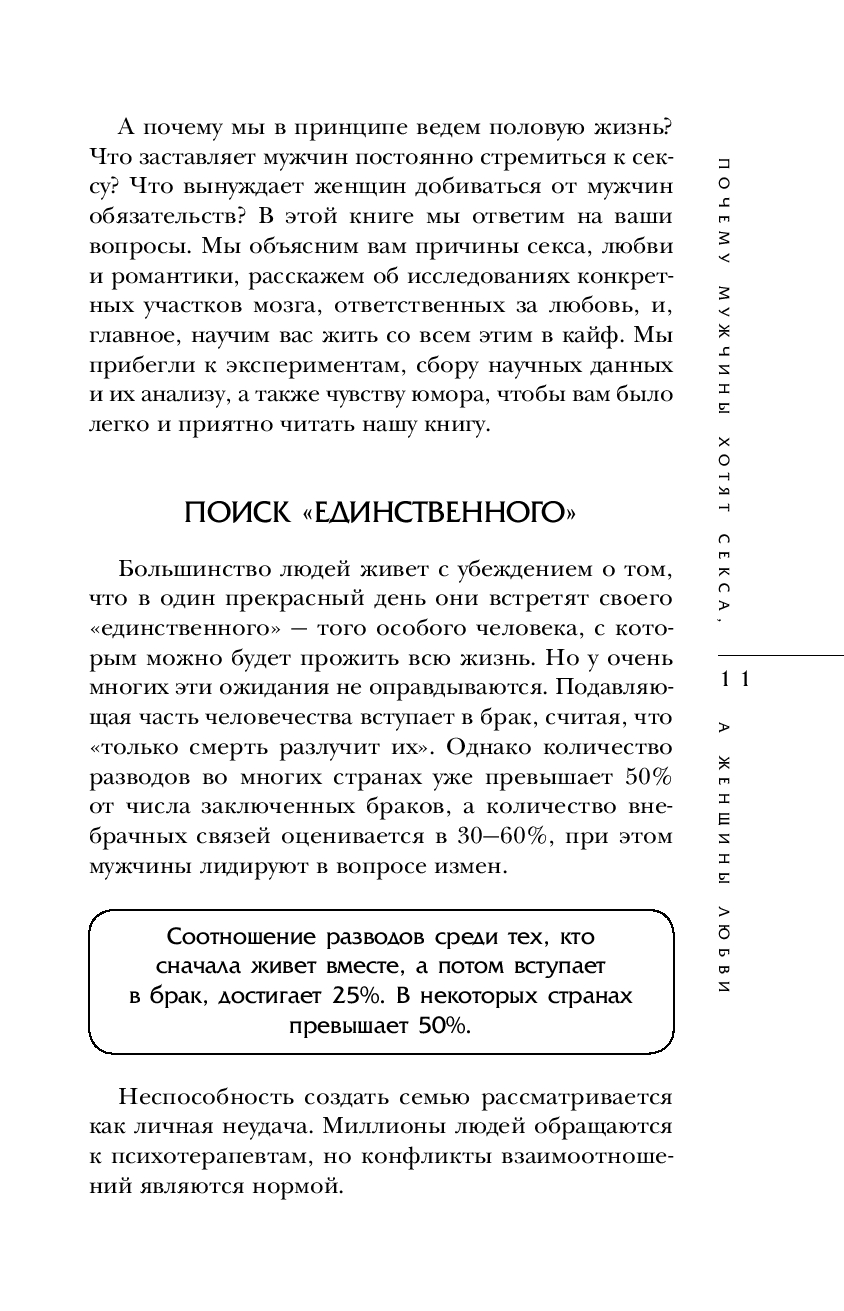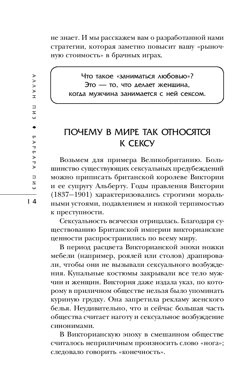 Внимание: секс! В мире, где любовь теряет свою ценность, а жажда половой близости становится на первое место, известные психологи Аллан и Барбара Пиз написали остроумную и увлекательную книгу об отношениях в постели и за ее пределами. Авторы знаменитого бестселлера "Язык телодвижений" предлагают свою помощь в решении самых острых коммуникационных проблем, возникающих между близкими людьми. А попутно отвечают на вопросы: почему мужчины и женщины воспринимают любовь по-разному? Чего на самом деле хотят мужчины? Что их больше всего возбуждает? Какие мужские качества ценятся женщинами? Почему у нас иногда бывает случайный секс? Как найти идеального партнера? Почему секс – отличное средство от головной боли? Как раз и навсегда улучшить свою личную жизнь?