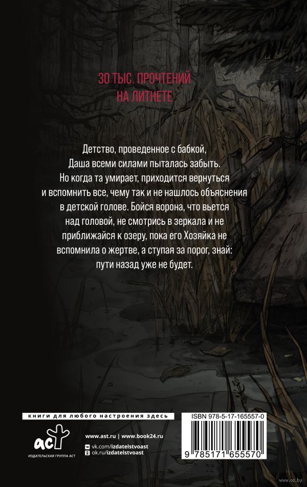 Детство, проведенное с бабкой, Даша всеми силами пыталась забыть. Но когда та умирает, приходится вернуться и вспомнить все, чему так и не нашлось объяснения в детской голове. Бойся ворона, что вьется над головой, не смотрись в зеркала и не приближайся к озеру, пока его Хозяйка не вспомнила о жертве, а ступая за порог, знай: пути назад уже не будет.