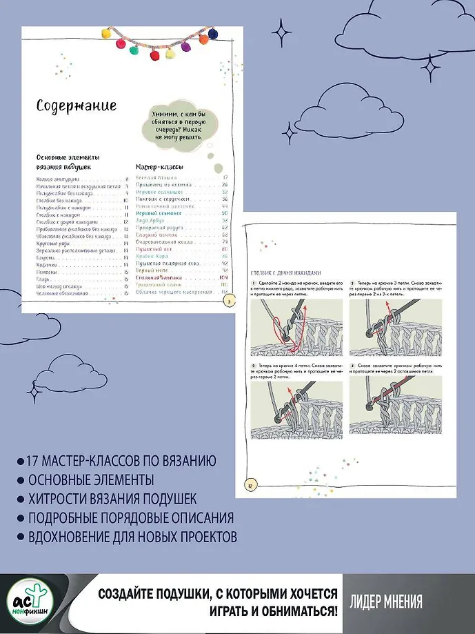 В этой книге собрано 17 мастер-классов по вязанию забавных подушек. С помощью подробных описаний по рядам вы сможете связать милого котика, веселое солнышко, прекрасную радугу, крутого осьминога и других персонажей.