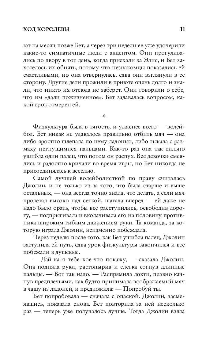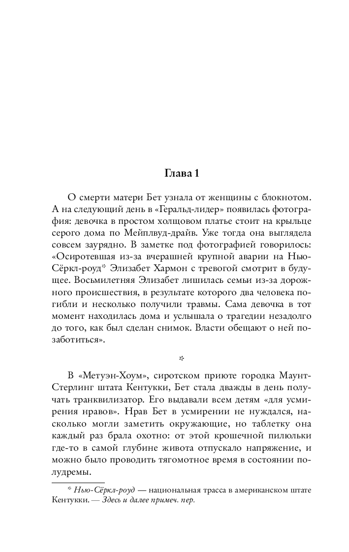 Бет Хармон – тихая, угрюмая и на первый взгляд ничем не примечательная восьмилетняя девочка, которую отправляют в приют после гибели матери. Она лишена любви и эмоциональной поддержки. Ее круг общения – еще одна сирота и сторож, он учит Бет играть в шахматы, которые постепенно становятся для нее смыслом жизни. По мере взросления юный гений начинает злоупотреблять транквилизаторами и алкоголем, сбегая тем самым от реальности.