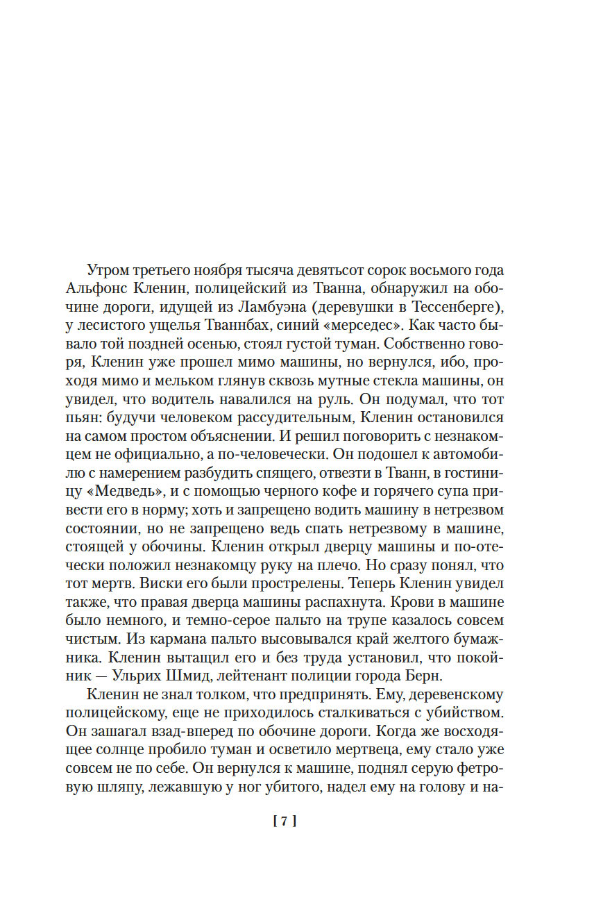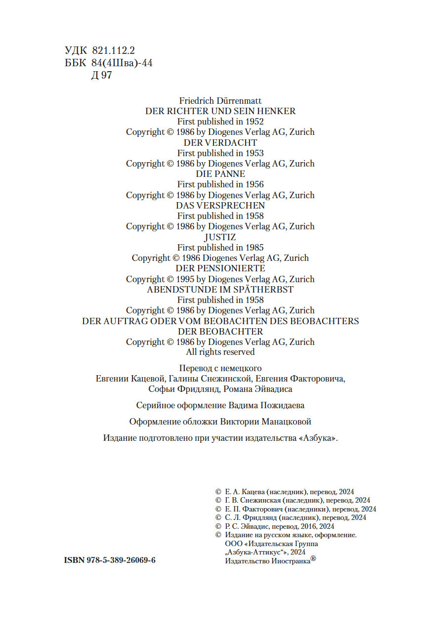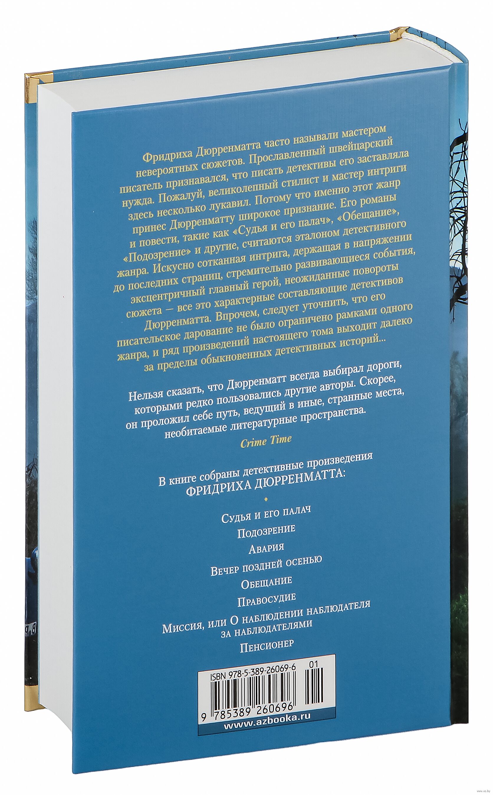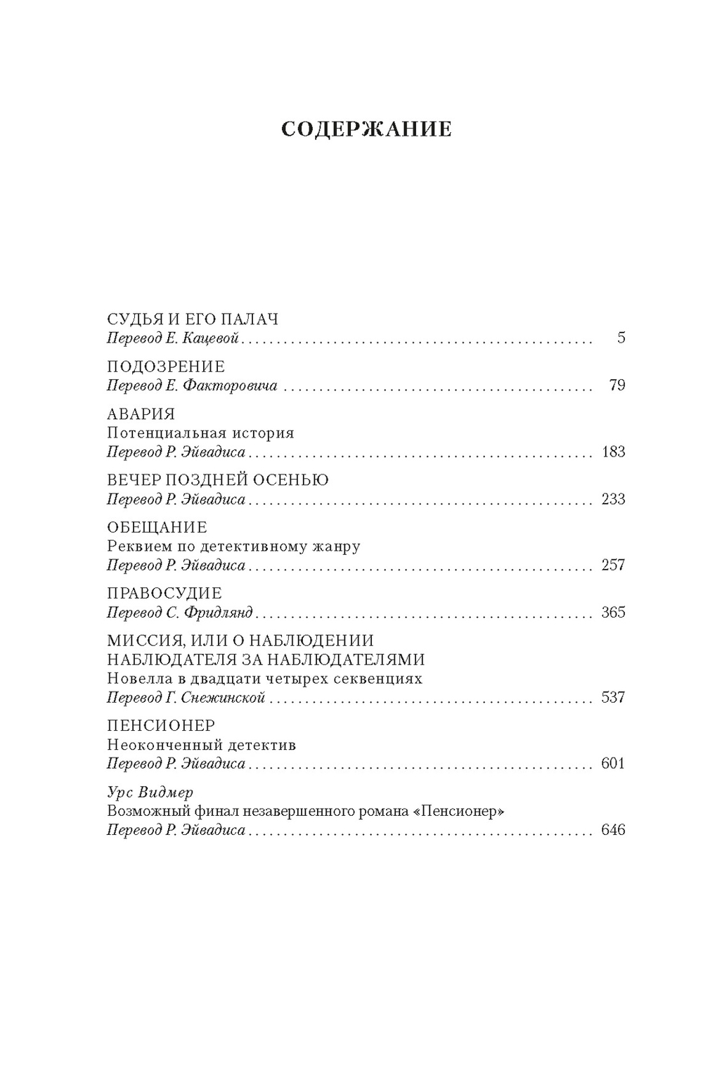 Фридриха Дюрренматта часто называли мастером невероятных сюжетов. Прославленный швейцарский писатель признавался, что писать детективы его заставляла нужда. Пожалуй, великолепный стилист и мастер интриги здесь несколько лукавил. Потому что именно этот жанр принес Дюрренматту широкое признание. Его романы и повести, такие как "Судья и его палач", "Обещание", "Подозрение" и другие, считаются эталоном детективного жанра. Искусно сотканная интрига, держащая в напряжении до последних страниц, стремительно развивающиеся события, эксцентричный главный герой, неожиданные повороты сюжета – все это характерные составляющие детективов Дюрренматта. Впрочем, следует уточнить, что его писательское дарование не было ограничено рамками одного жанра, и ряд произведений настоящего тома выходит далеко за пределы обыкновенных детективных историй...