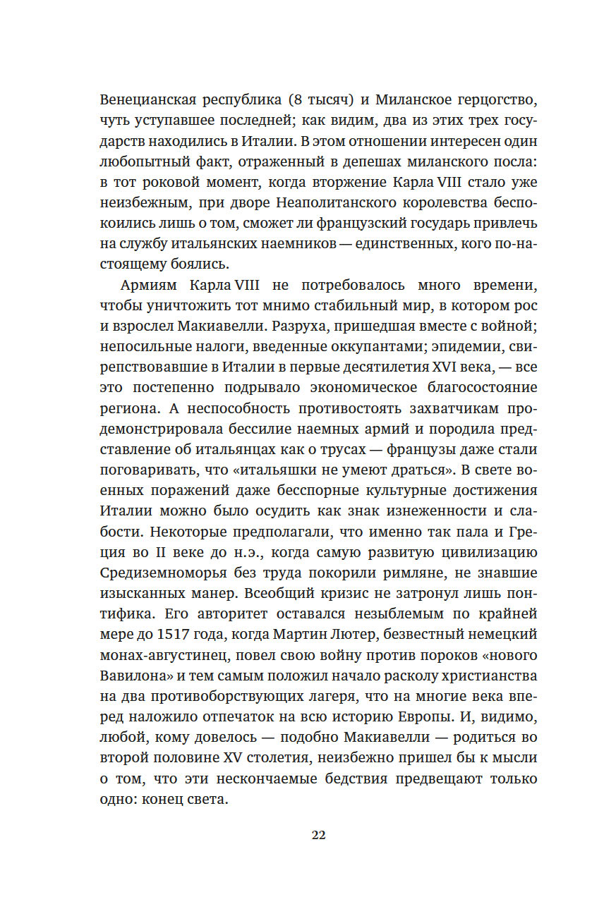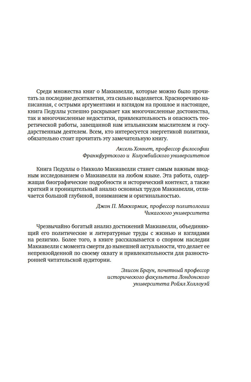 Профессор Габриэль Педулла не просто рассказывает о жизни Макиавелли, но и беспристрастно анализирует его труды "Государь", "О военном искусстве" и "Рассуждения о первой декаде Тита Ливия".