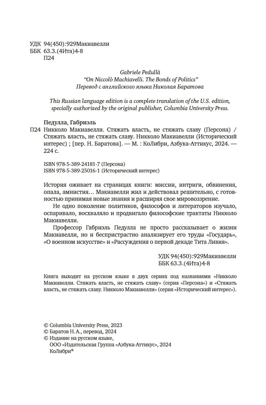 Книга выходит на русском языке в двух сериях под названиями "Никколо Макиавелли. Стяжать власть, не стяжать славу" (серия "Персона") и "Стяжать власть, не стяжать славу. Никколо Макиавелли" (серия "Исторический интерес").