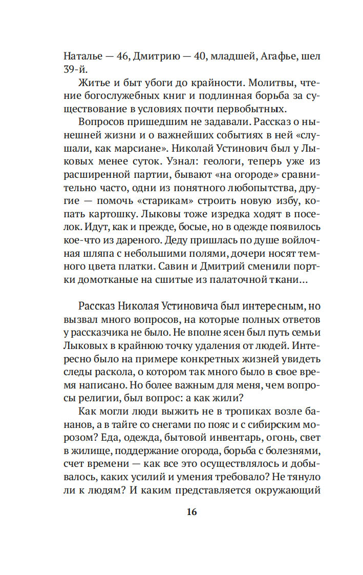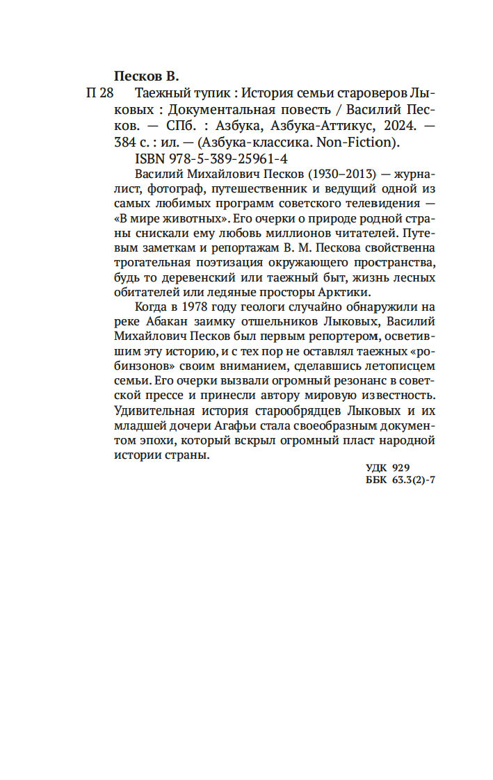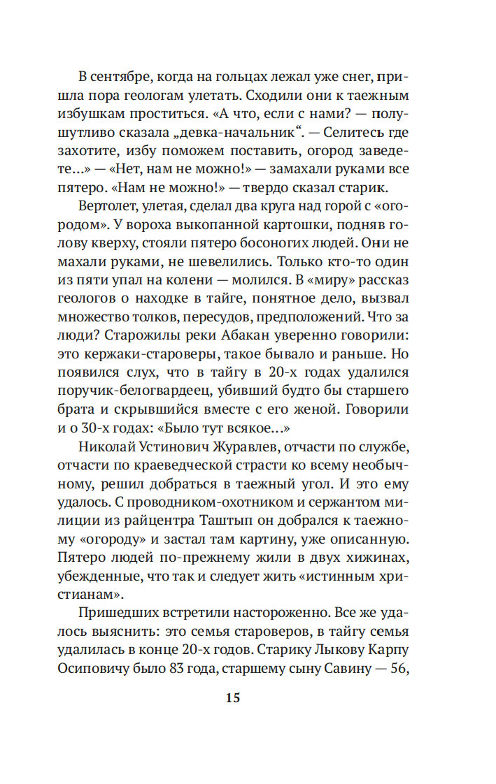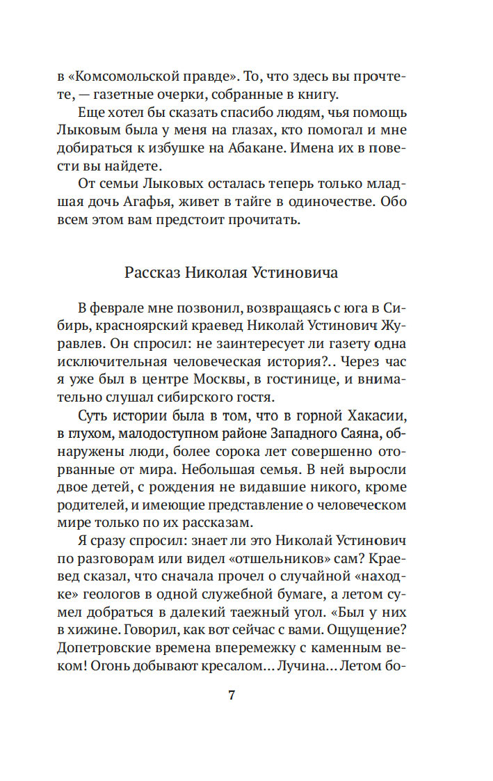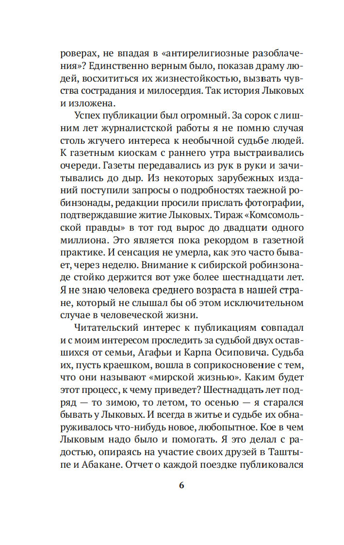 Когда в 1978 году геологи случайно обнаружили на реке Абакан заимку отшельников Лыковых, Василий Михайлович Песков был первым репортером, осветившим эту историю, и с тех пор не оставлял таежных "робинзонов" своим вниманием, сделавшись летописцем семьи. Его очерки вызвали огромный резонанс в советской прессе и принесли автору мировую известность. Удивительная история старообрядцев Лыковых и их младшей дочери Агафьи стала своеобразным документом эпохи, который вскрыл огромный пласт народной истории страны.
