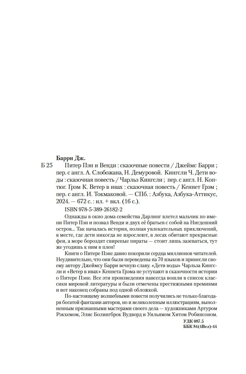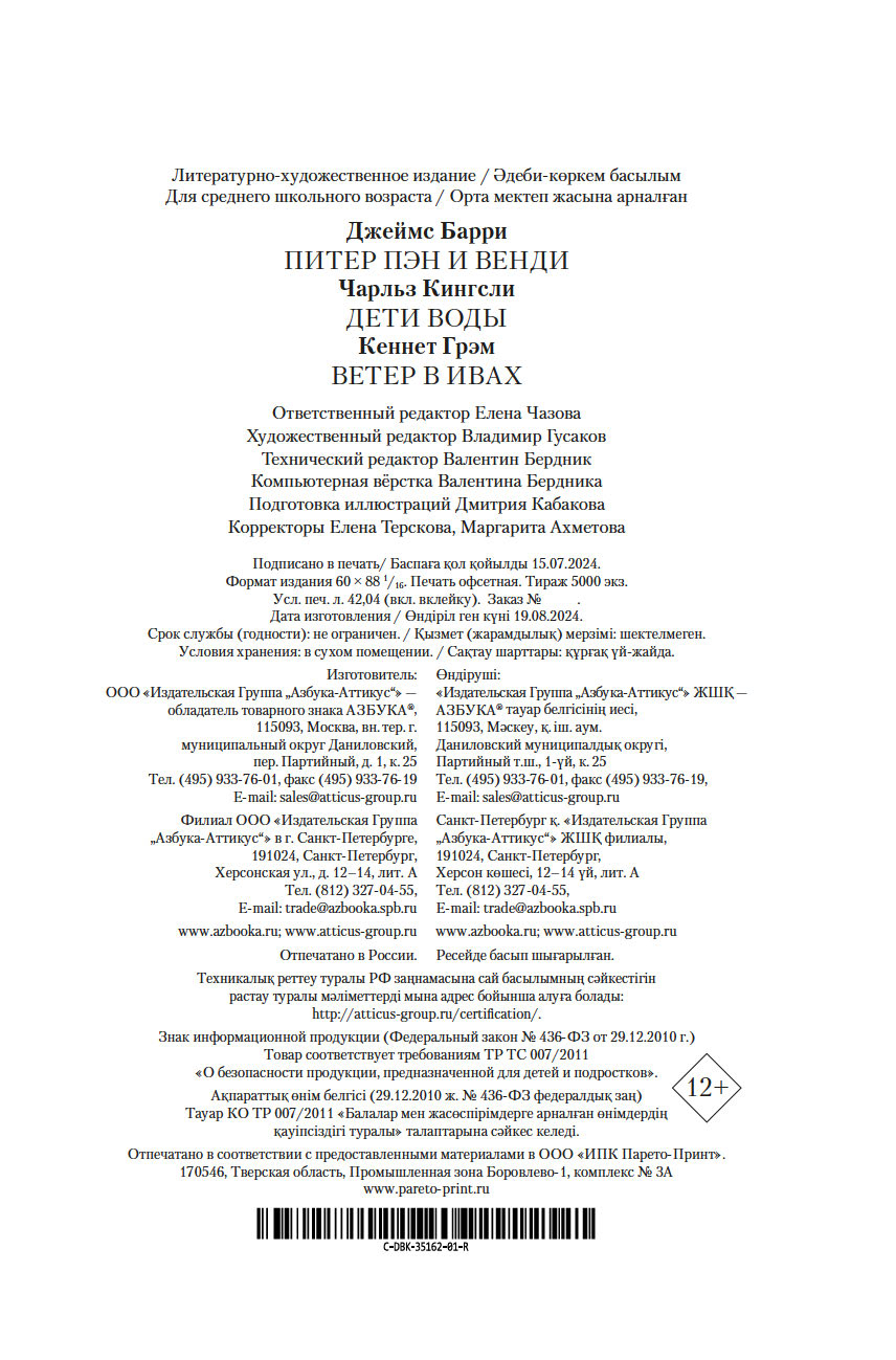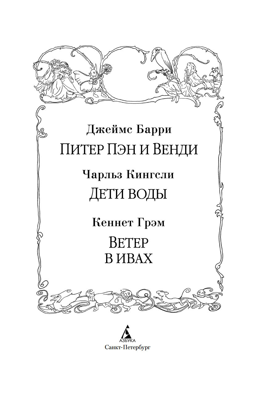 Книги о Питере Пэне давно покорили сердца миллионов читателей. Неудивительно, что они были переведены на 70 языков и принесли своему автору Джеймсу Барри вечную славу. "Дети воды" Чарльза Кингсли и "Ветер в ивах" Кеннета Грэма не уступают в сказочности истории о Питере Пэне. Все эти произведения навсегда вошли в список классики мировой литературы и были отмечены престижными премиями и вот наконец собраны под одной обложкой.