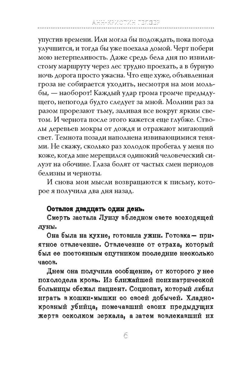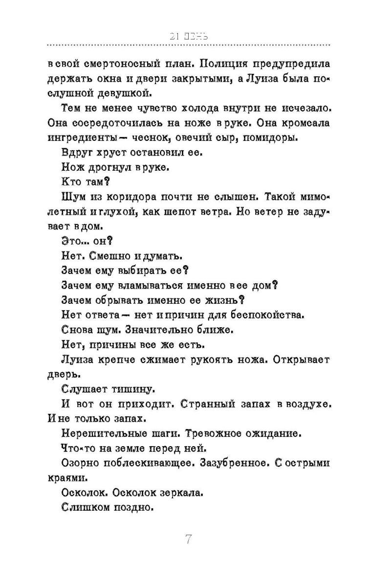 Луиза получает анонимное письмо, в котором написано, что через 21 день она умрет. Что это? Глупая шутка? Предупреждение от маньяка? Письма продолжают приходить, они наполнены подробностями жизни Луизы, девушка понимает, что за ней следят, возможно, отправитель был у нее дома. Не зная, что делать, она начинает выполнять условия, которые ставит ей преследователь – и боится каждого нового дня...