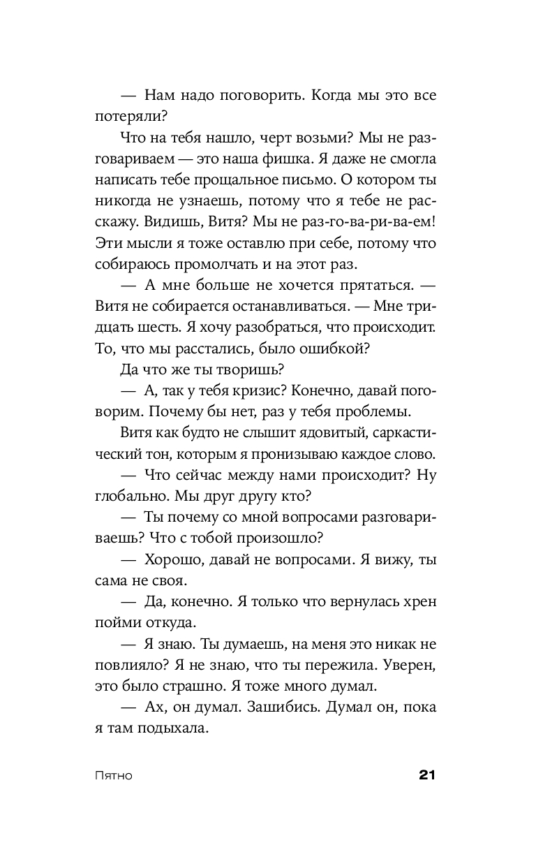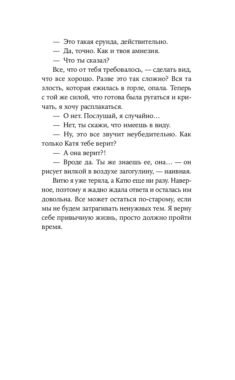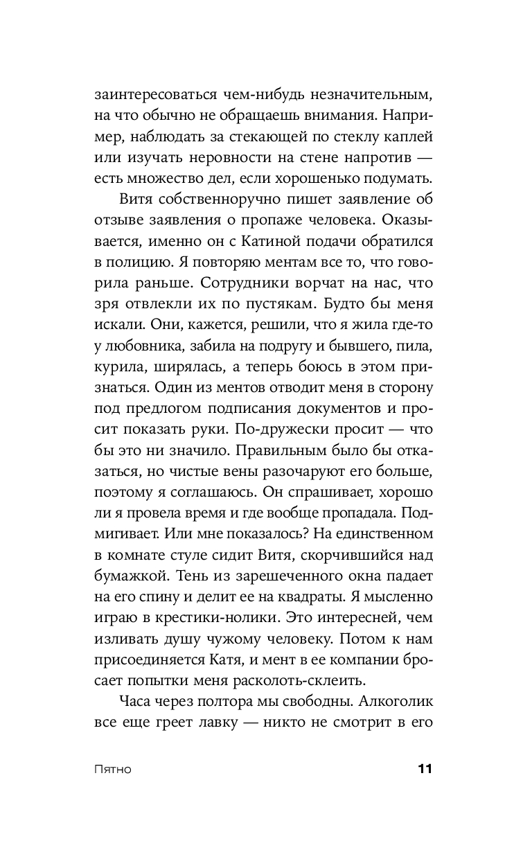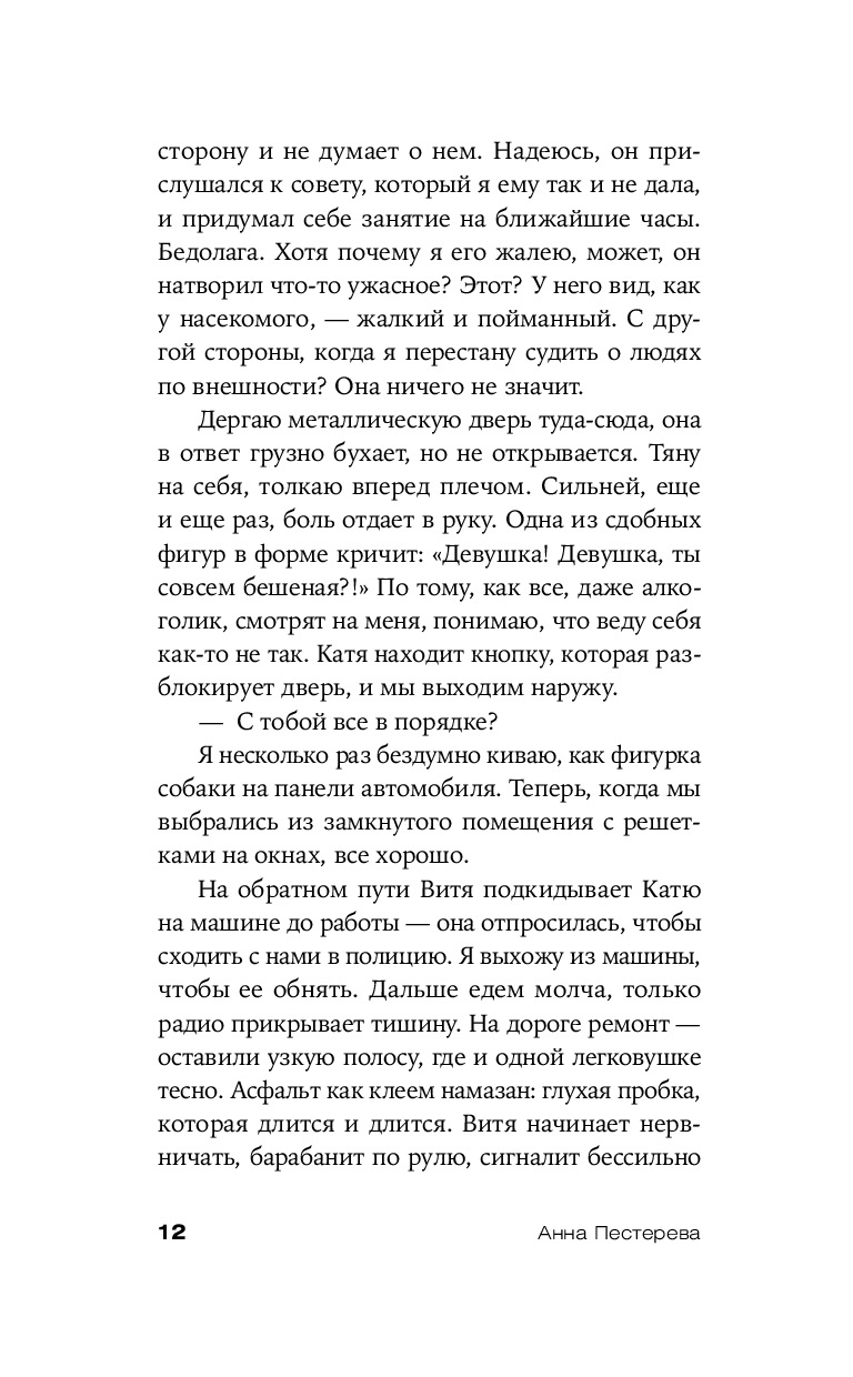 Настя живет в небольшом российском городе и мечтает найти удаленную высокооплачиваемую работу. У нее есть бывший муж, с которым удалось сохранить нормальные отношения, и подруга, которая в нее верит. Не так мало для нормальной жизни, но однажды зимним днем девушка пропадает на три с половиной недели, а вернувшись, никому не рассказывает, что именно с ней приключилось. Несмотря на то что она предпочла бы вычеркнуть этот период из своей жизни, забыть о нем не удастся. Более того, чтобы по‑настоящему отпустить эту историю, ей предстоит добровольно туда вернуться.