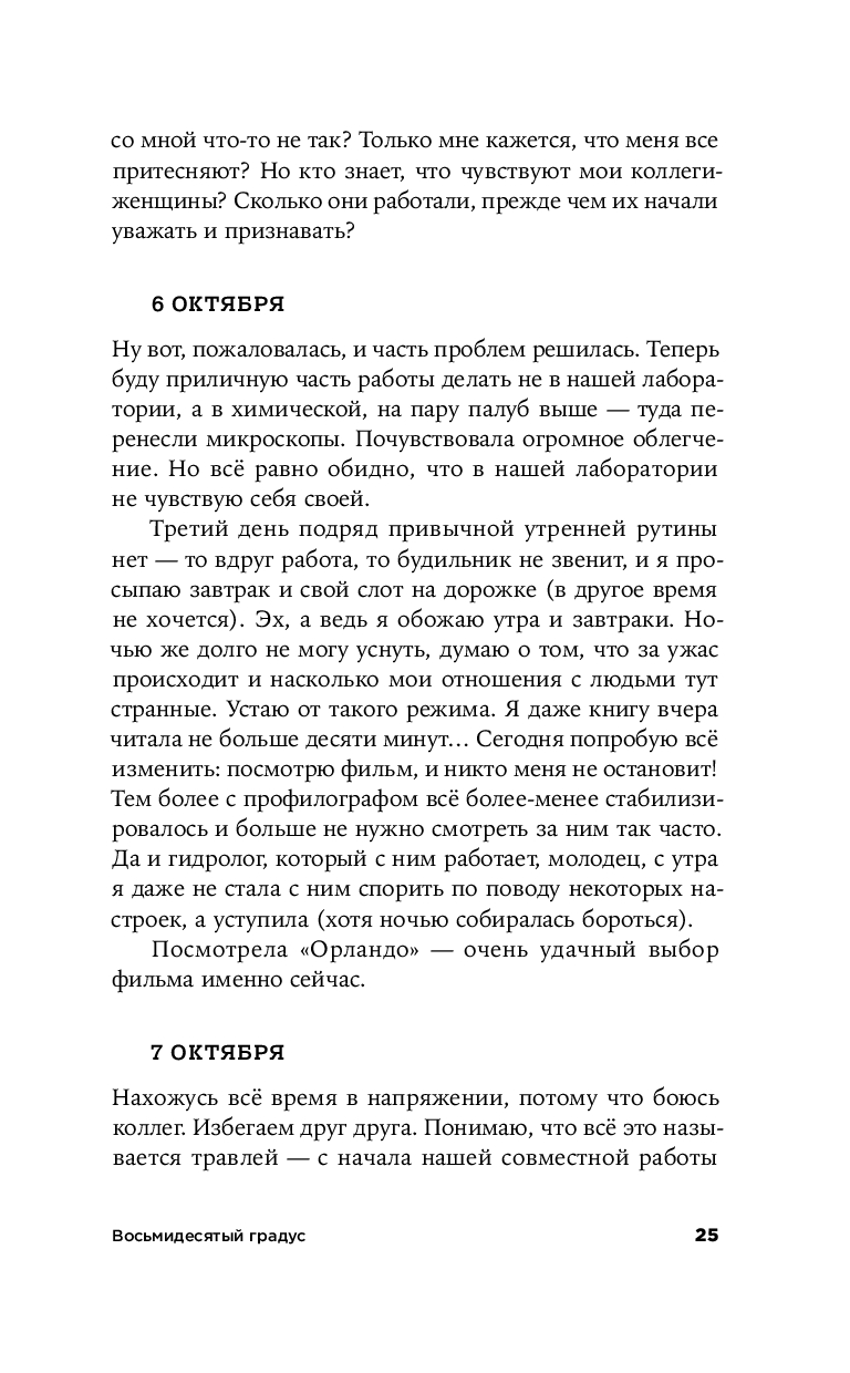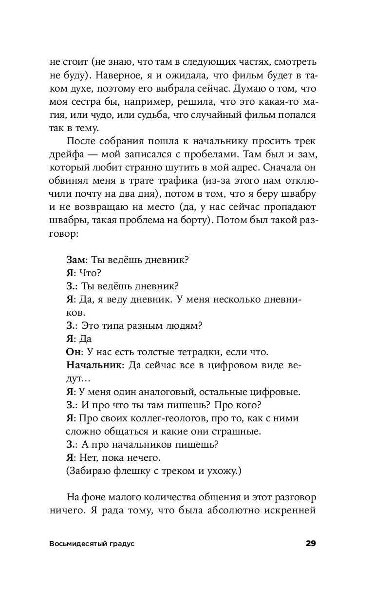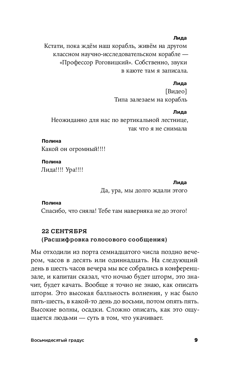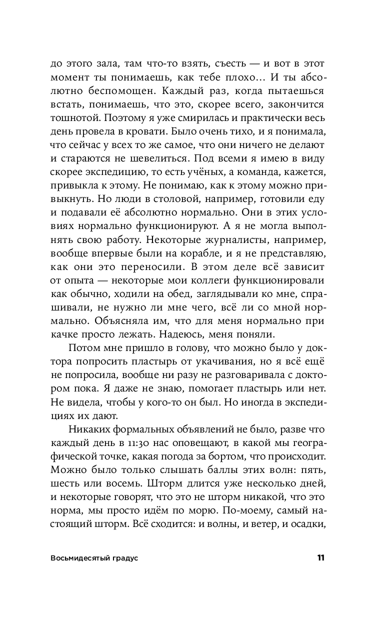 "Восьмидесятый градус" – история человеческих силы и слабости, умения оставаться собой и подстраиваться под обстоятельства: во время экспедиции читателю вместе с героиней предстоит осознать, что одно вовсе не исключает другого.