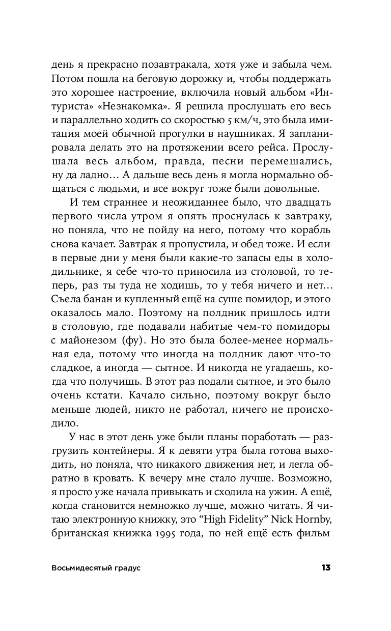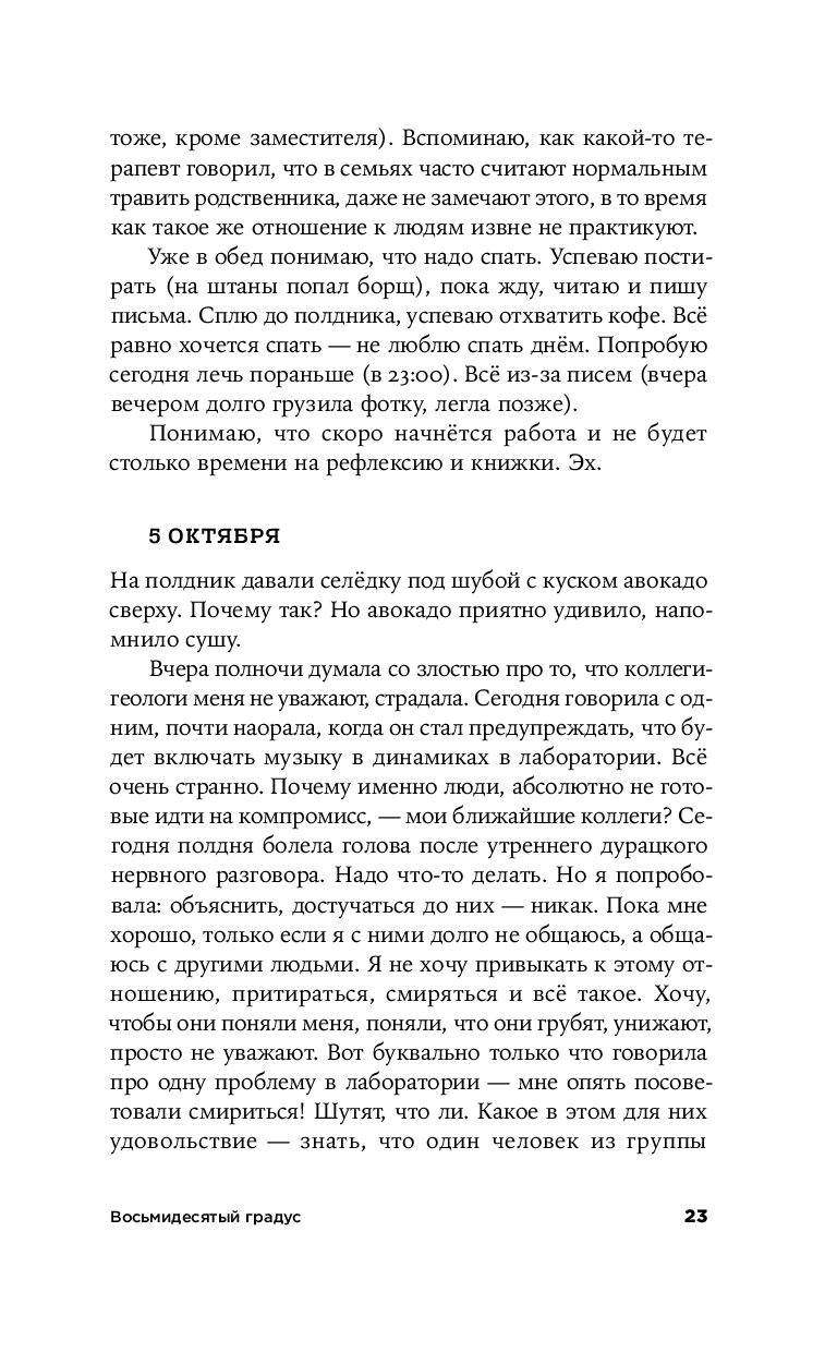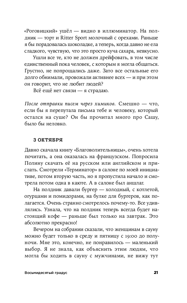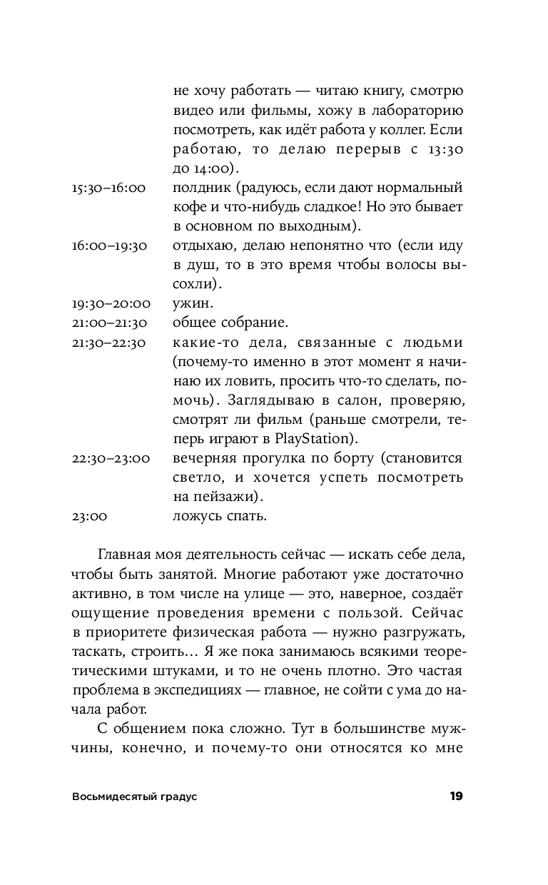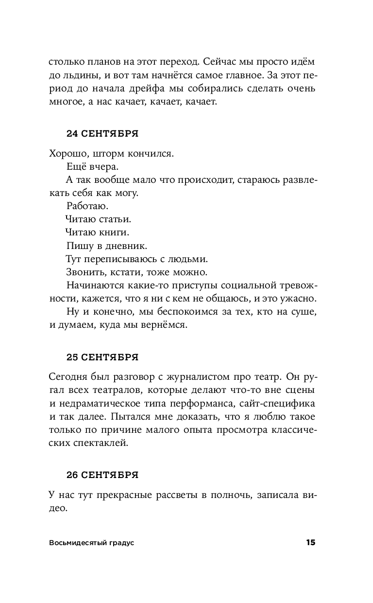 "Восьмидесятый градус" – история человеческих силы и слабости, умения оставаться собой и подстраиваться под обстоятельства: во время экспедиции читателю вместе с героиней предстоит осознать, что одно вовсе не исключает другого.