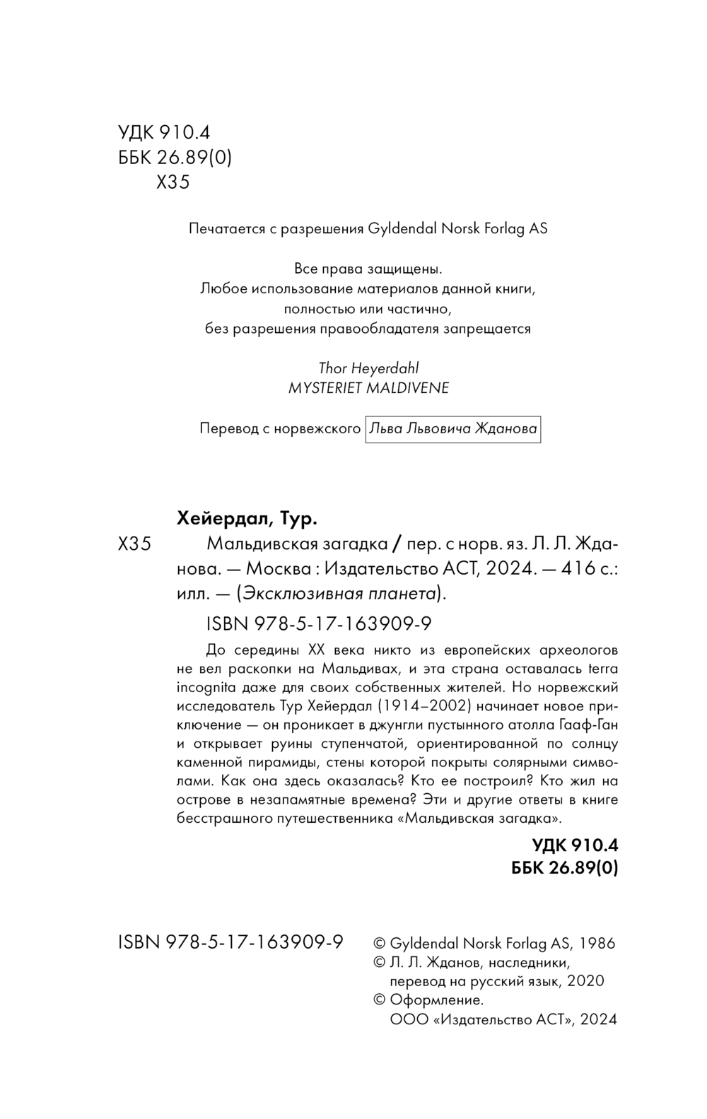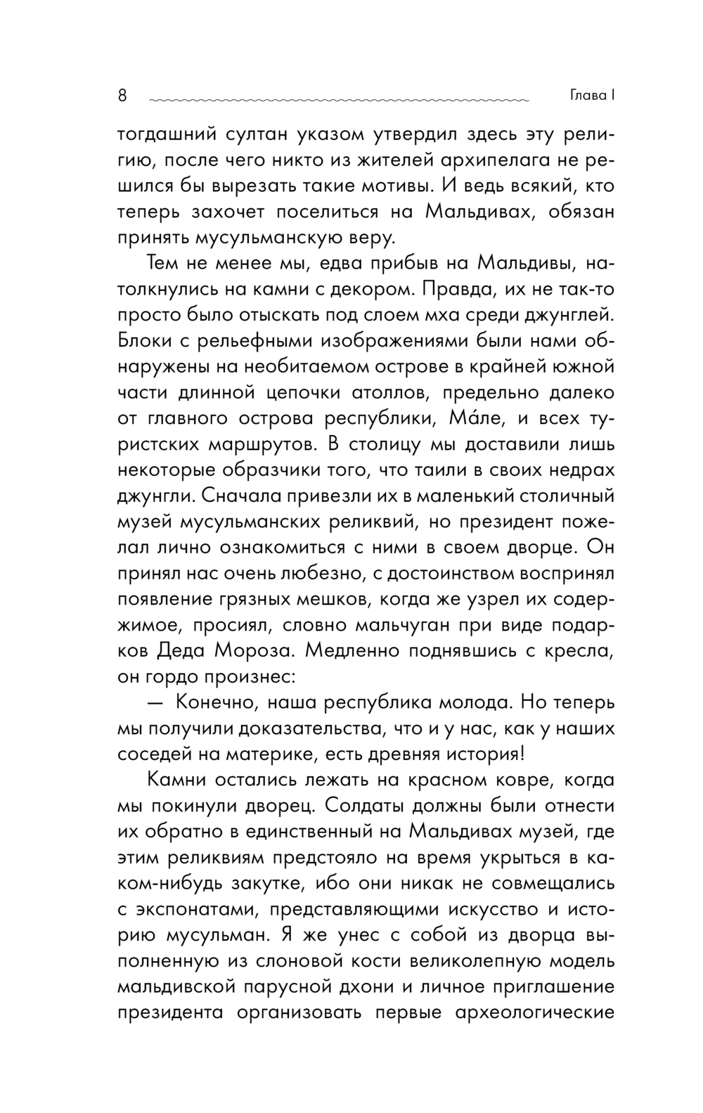 До середины ХХ века никто из европейских археологов не вел раскопки на Мальдивах, и эта страна оставалась terra incognita даже для своих собственных жителей. Но норвежский исследователь Тур Хейердал (1914-2002) начинает новое приключение – он проникает в джунгли пустынного атолла Гааф-Ган и открывает руины ступенчатой, ориентированной по солнцу каменной пирамиды, стены которой покрыты солярными символами. Как она здесь оказалась? Кто ее построил? Кто жил на острове в незапамятные времена? Эти и другие ответы в книге бесстрашного путешественника "Мальдивская загадка".