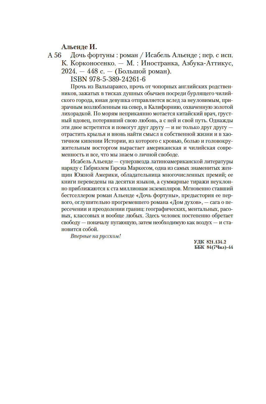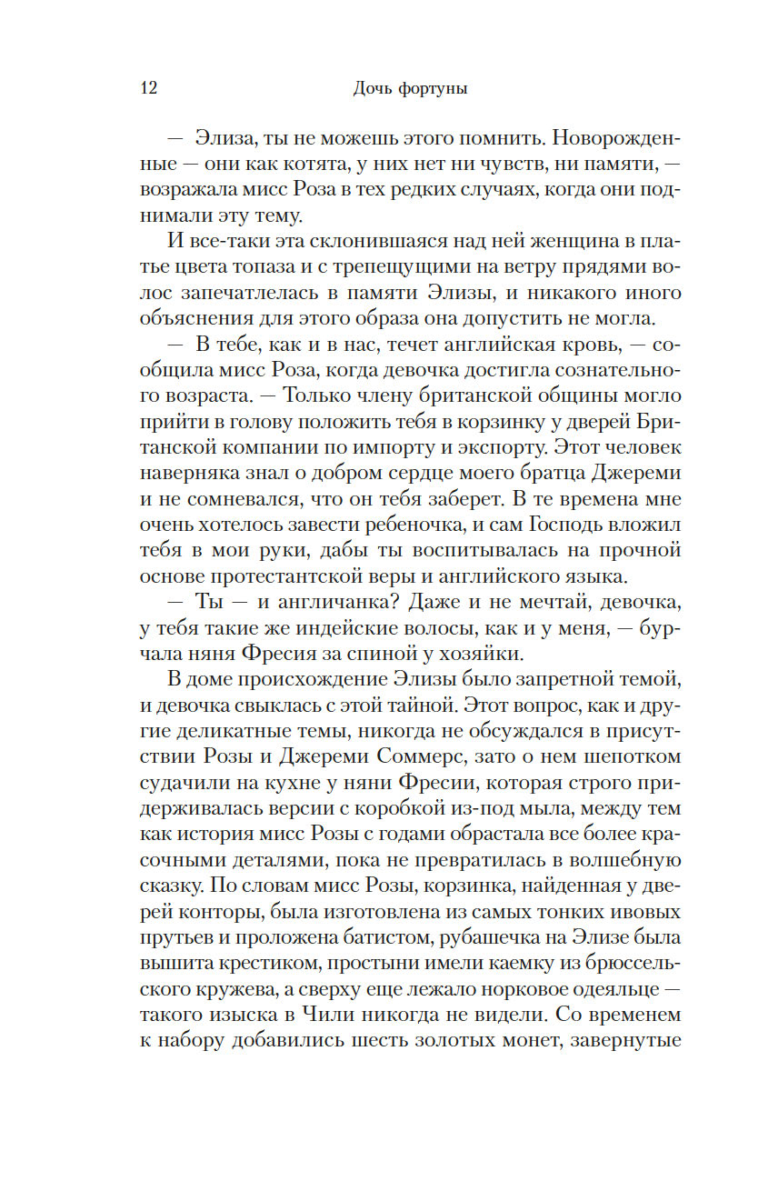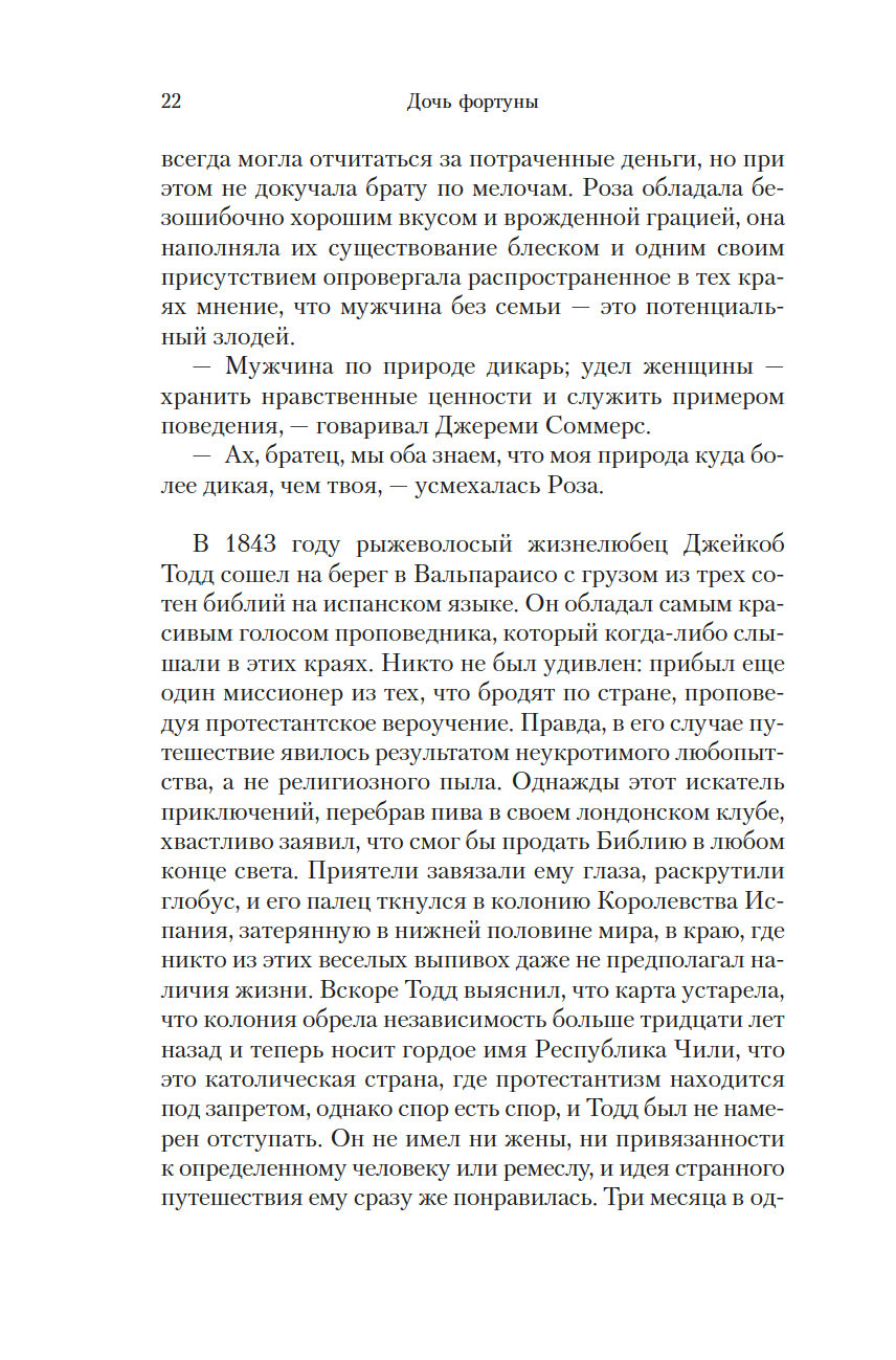 Исабель Альенде – суперзвезда латиноамериканской литературы наряду с Габриэлем Гарсиа Маркесом, одна из самых знаменитых женщин Южной Америки, обладательница многочисленных премий; ее книги переведены на десятки языков, а суммарные тиражи неуклонно приближаются к ста миллионам экземпляров. Мгновенно ставший бестселлером роман Альенде "Дочь фортуны", предыстория ее первого, оглушительно прогремевшего романа "Дом духов", – сага о пересечении и преодолении границ: географических, ментальных, расовых, классовых и вообще любых. Здесь человек постепенно обретает свободу – поначалу пугающую, затем необходимую как воздух – и становится собой.