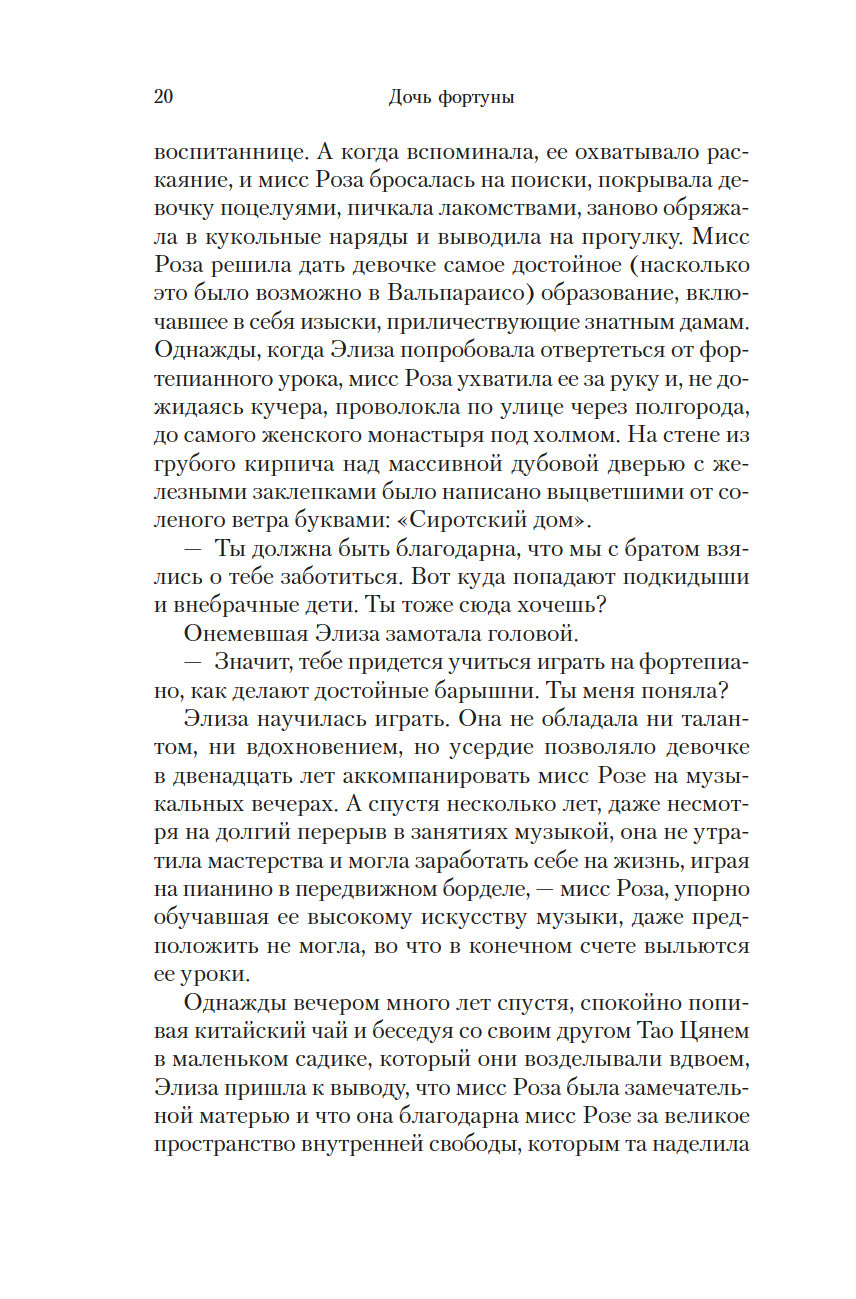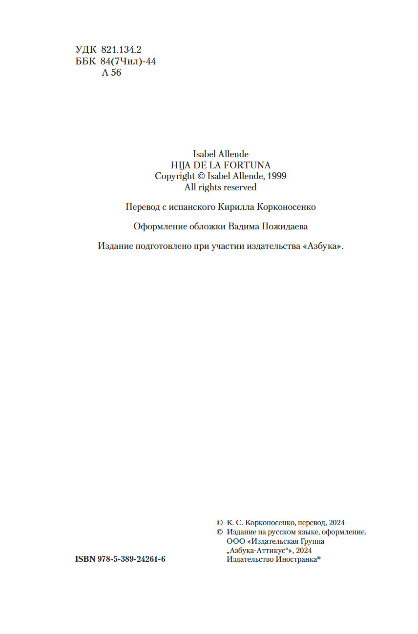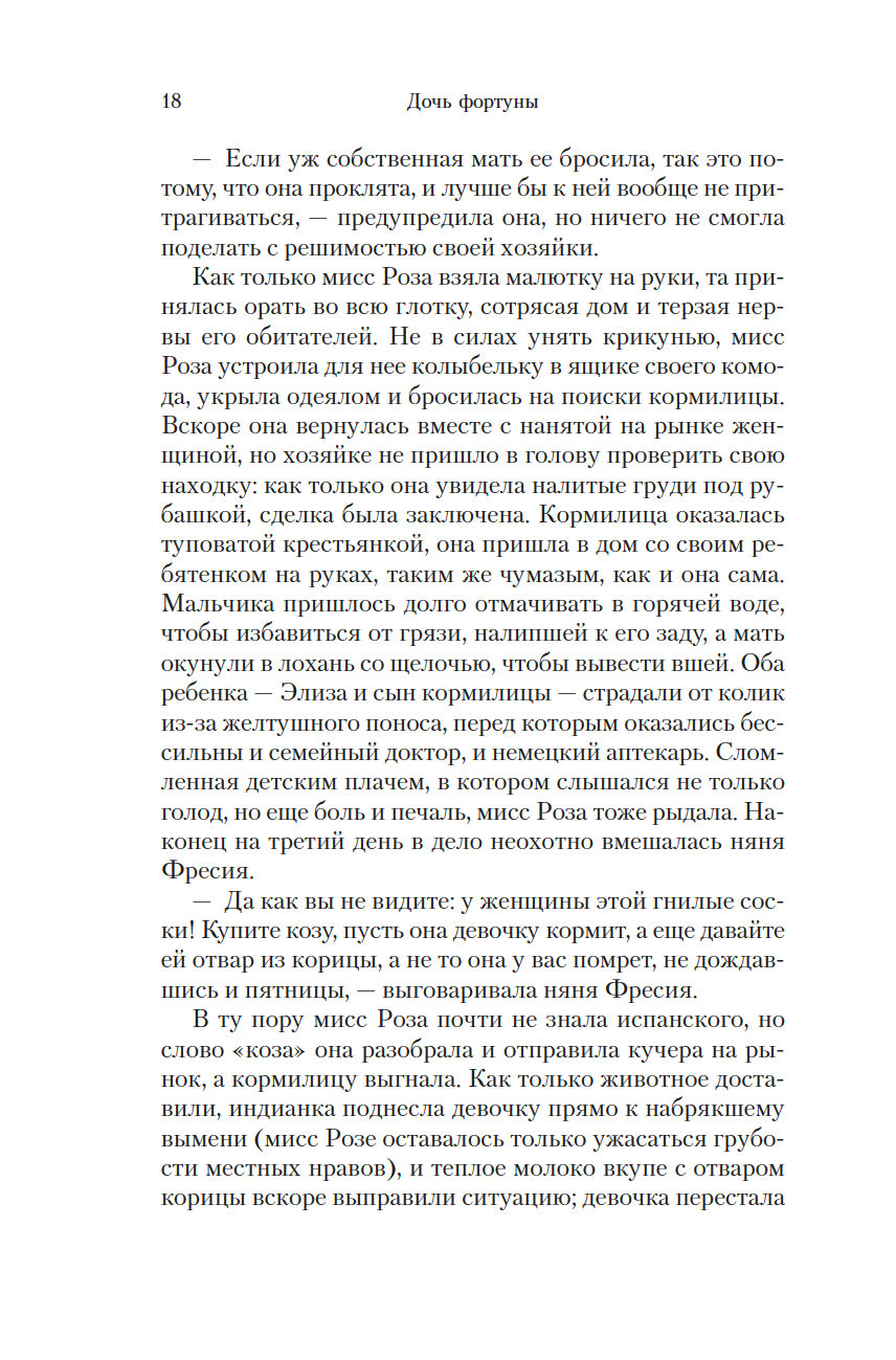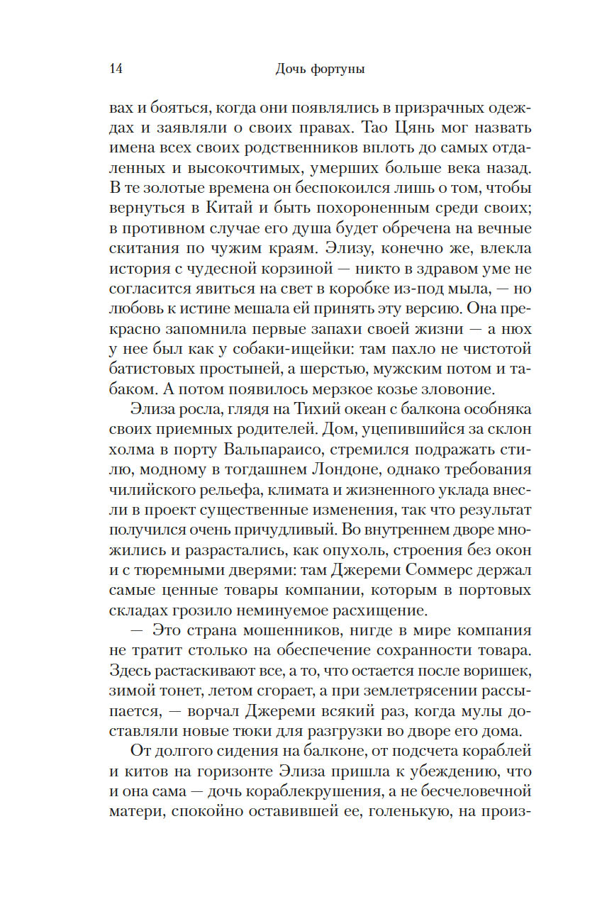 Исабель Альенде – суперзвезда латиноамериканской литературы наряду с Габриэлем Гарсиа Маркесом, одна из самых знаменитых женщин Южной Америки, обладательница многочисленных премий; ее книги переведены на десятки языков, а суммарные тиражи неуклонно приближаются к ста миллионам экземпляров. Мгновенно ставший бестселлером роман Альенде "Дочь фортуны", предыстория ее первого, оглушительно прогремевшего романа "Дом духов", – сага о пересечении и преодолении границ: географических, ментальных, расовых, классовых и вообще любых. Здесь человек постепенно обретает свободу – поначалу пугающую, затем необходимую как воздух – и становится собой.