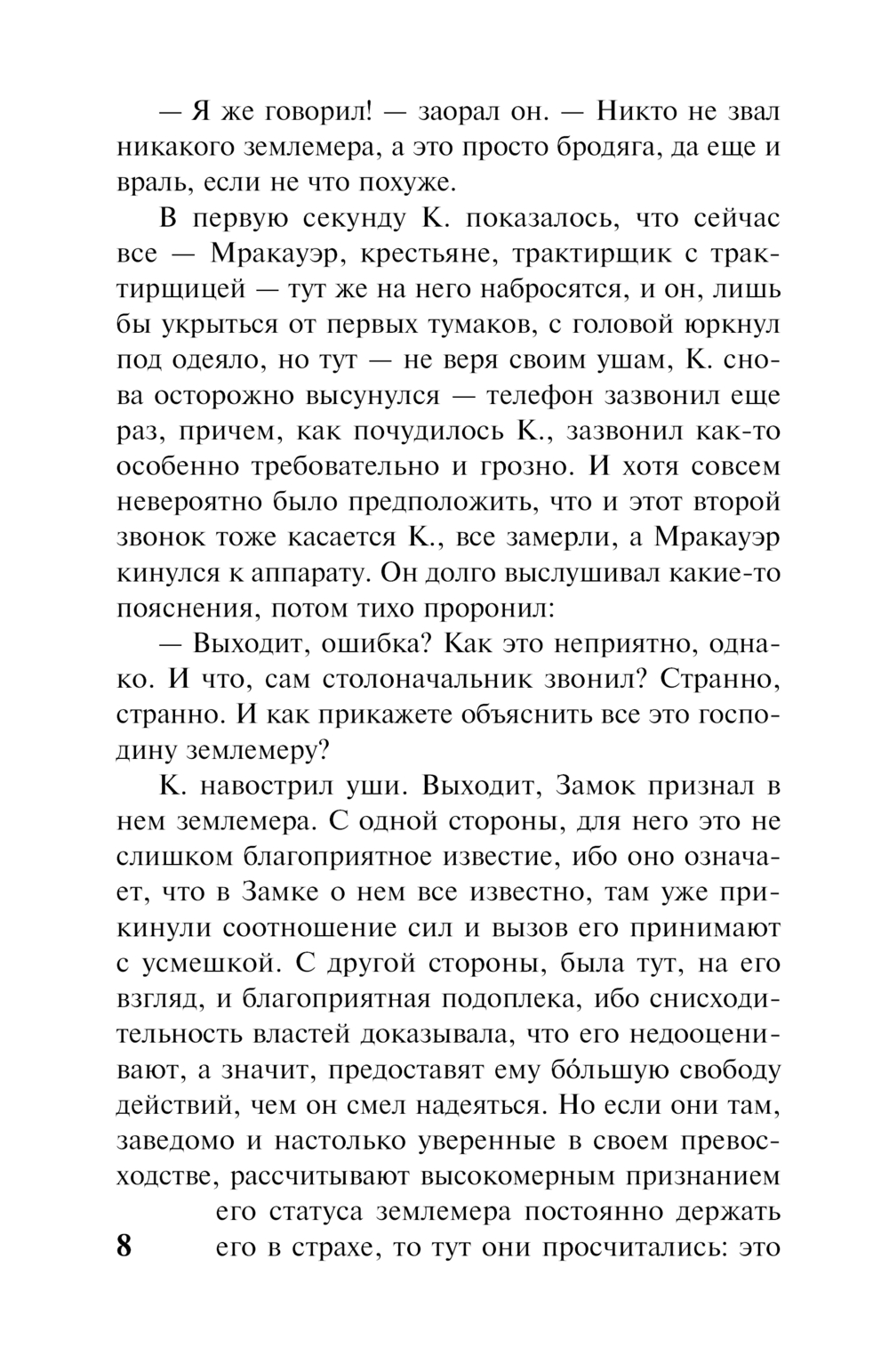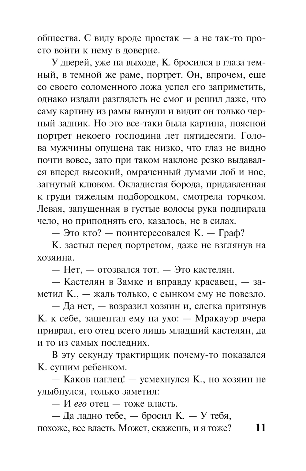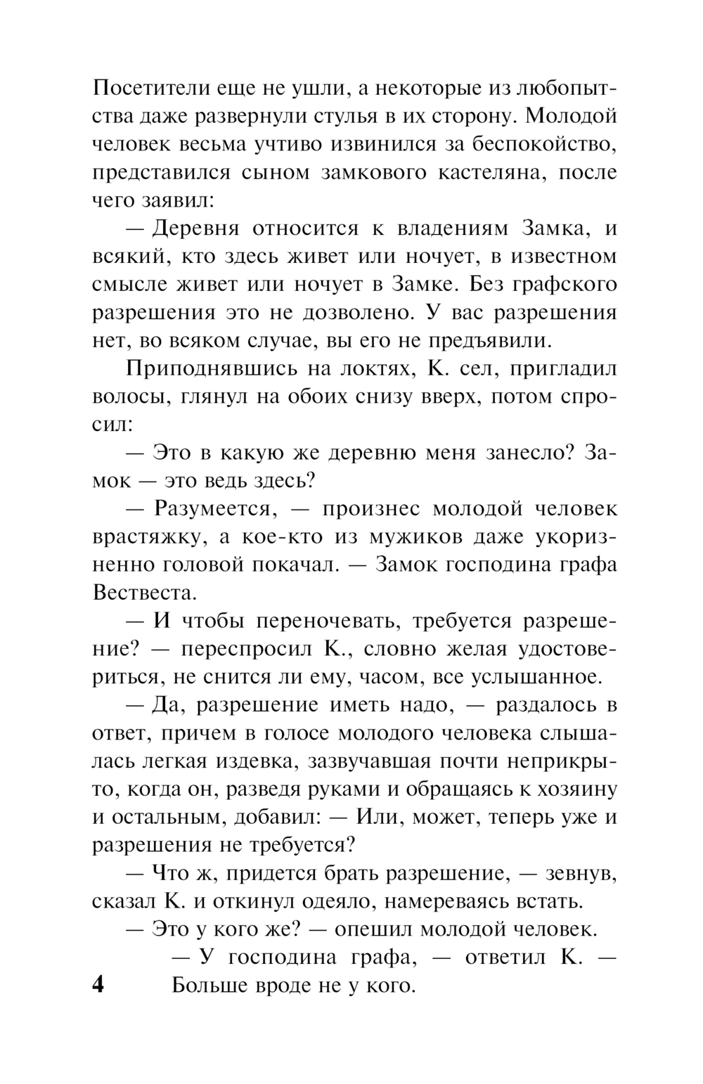 Он не был закончен писателем и впервые опубликован после его смерти в 1926 году его другом Максом Бродом. Сюжет "Замка" абсурден, но в то же время правдоподобен: в некую Деревню приезжает землемер К. и пытается попасть в Замок, куда его не пускают. Сложная система бюрократии запутывается в клубок, распутать который нет никакой возможности, а значит, нет возможности попасть в Замок, какими бы окольными путями ты ни шел. Но сатира на бюрократическую систему – лишь один из подтекстов романа.