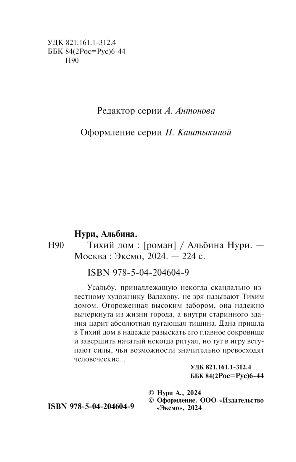 Усадьбу, принадлежащую некогда скандально известному художнику Валахову, не зря называют Тихим домом. Огороженная высоким забором, она надежно вычеркнута из жизни города, а внутри старинного здания царит абсолютная пугающая тишина. Дана пришла в Тихий дом в надежде разыскать его главное сокровище и завершить начатый некогда ритуал, но тут в игру вступают силы, чьи возможности значительно превосходят человеческие.