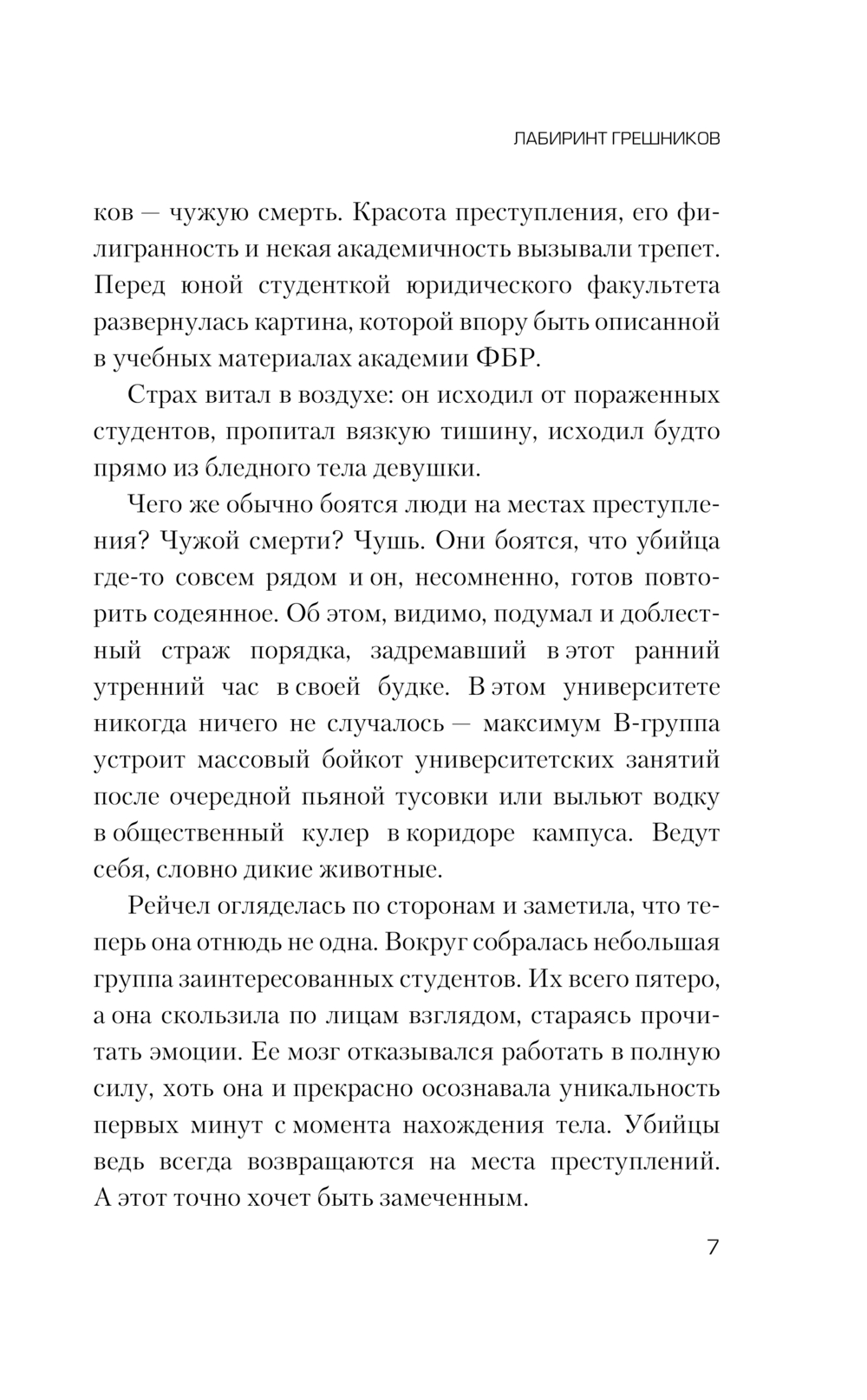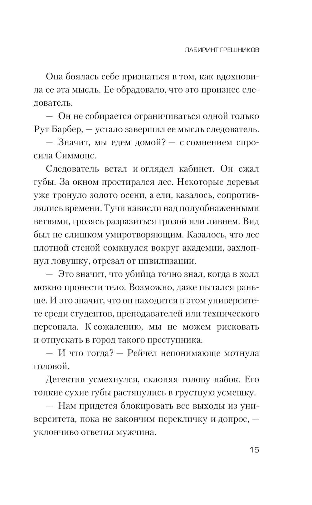 Рейчел Симмонс, студентке кафедры криминалистики, предстоит вычислить убийцу в закрытом кампусе посреди глухого леса, чтобы выйти живой из этого темного лабиринта страха и подозрений.