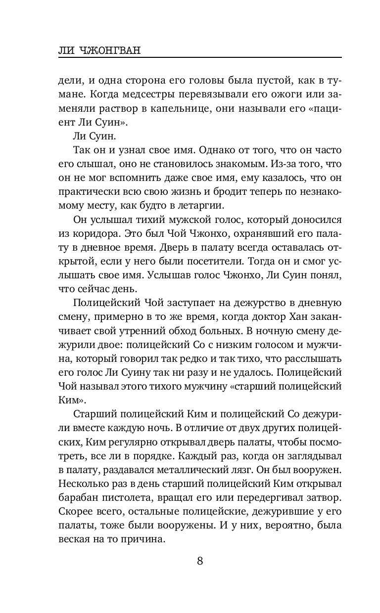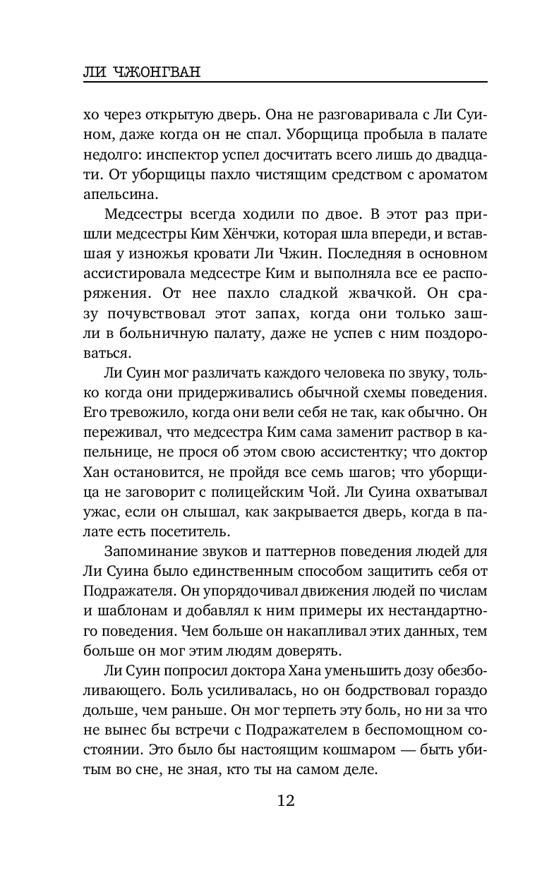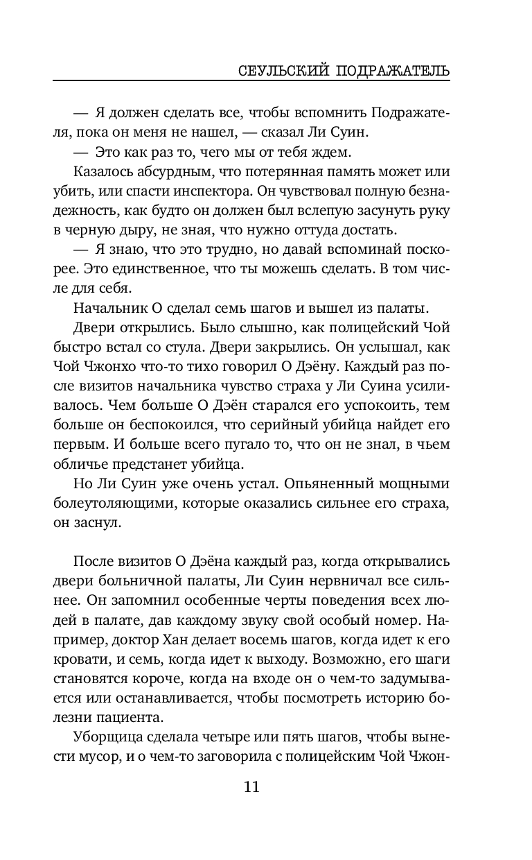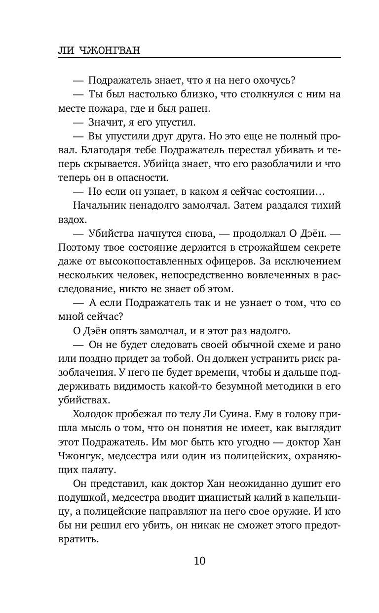 Весьма неплохой корейский триллер. В книге нет места излишней драме и никакого намёка на любовную линию. Подача простая, все кратко, чётко и по делу, без лирических отступлений. Впечатление словно читаешь пересказ дела, а не детективный роман. Какого-то сочувствия или симпатии к героям я не испытала, но мне было интересно следить за ходом расследования. От описания некоторых преступлений даже были мурашки по коже. Без кровавых подробностей, но жутко. И хотя сюжет несколько предсказуем, как впрочем и финал, автор всё же смог удивить и добавил весьма неожиданный поворот в самой середине, отчего история приобретает уже совсем совсем иной вид. Кто главный злодей догадаться не сложно. И хотя и сам сюжет триллера, и как написан, мне скорее понравился, все же чего-то не хватило. Может быть стоило бы добавить ещё пару-тройку неожиданных поворотов. Хорошо на один раз.