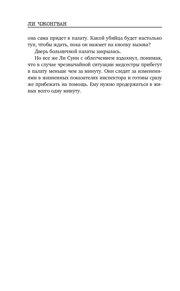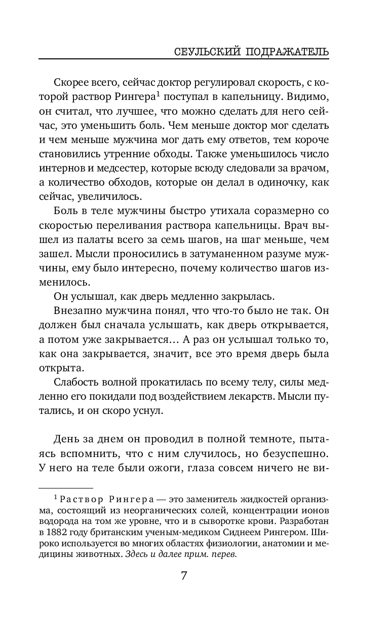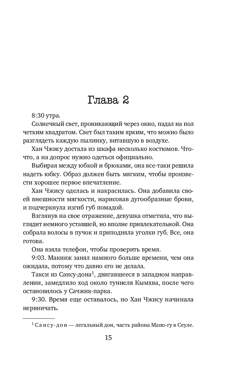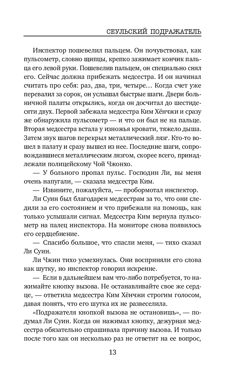 Весьма неплохой корейский триллер. В книге нет места излишней драме и никакого намёка на любовную линию. Подача простая, все кратко, чётко и по делу, без лирических отступлений. Впечатление словно читаешь пересказ дела, а не детективный роман. Какого-то сочувствия или симпатии к героям я не испытала, но мне было интересно следить за ходом расследования. От описания некоторых преступлений даже были мурашки по коже. Без кровавых подробностей, но жутко. И хотя сюжет несколько предсказуем, как впрочем и финал, автор всё же смог удивить и добавил весьма неожиданный поворот в самой середине, отчего история приобретает уже совсем совсем иной вид. Кто главный злодей догадаться не сложно. И хотя и сам сюжет триллера, и как написан, мне скорее понравился, все же чего-то не хватило. Может быть стоило бы добавить ещё пару-тройку неожиданных поворотов. Хорошо на один раз.