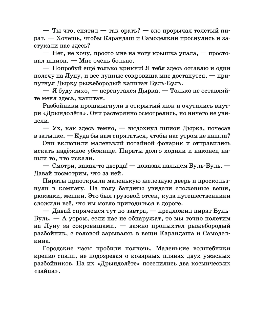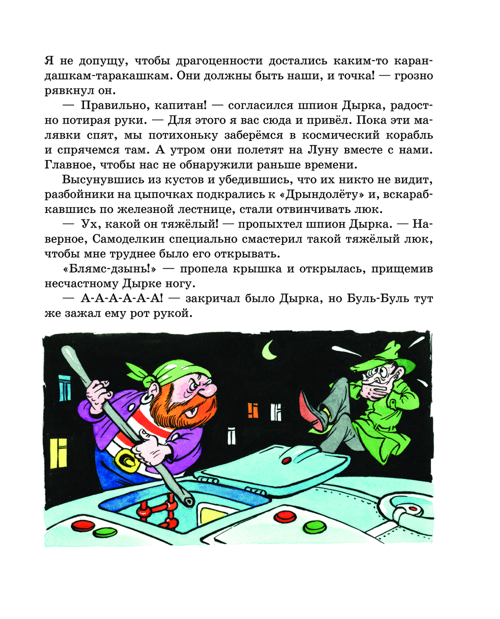 Дружная команда из Волшебной школы отправляется в космическое путешествие. Их манят загадки далёкой Луны. Железный мастер Самоделкин построил чудесный "Дрындолёт", которому не страшны метеоритные бури. Но не дремлют вредные разбойники: пират Буль-Буль и шпион Дырка. Они решили стать космическими пиратами и угнать чудо-корабль.