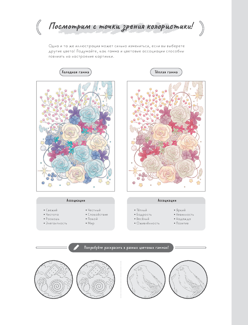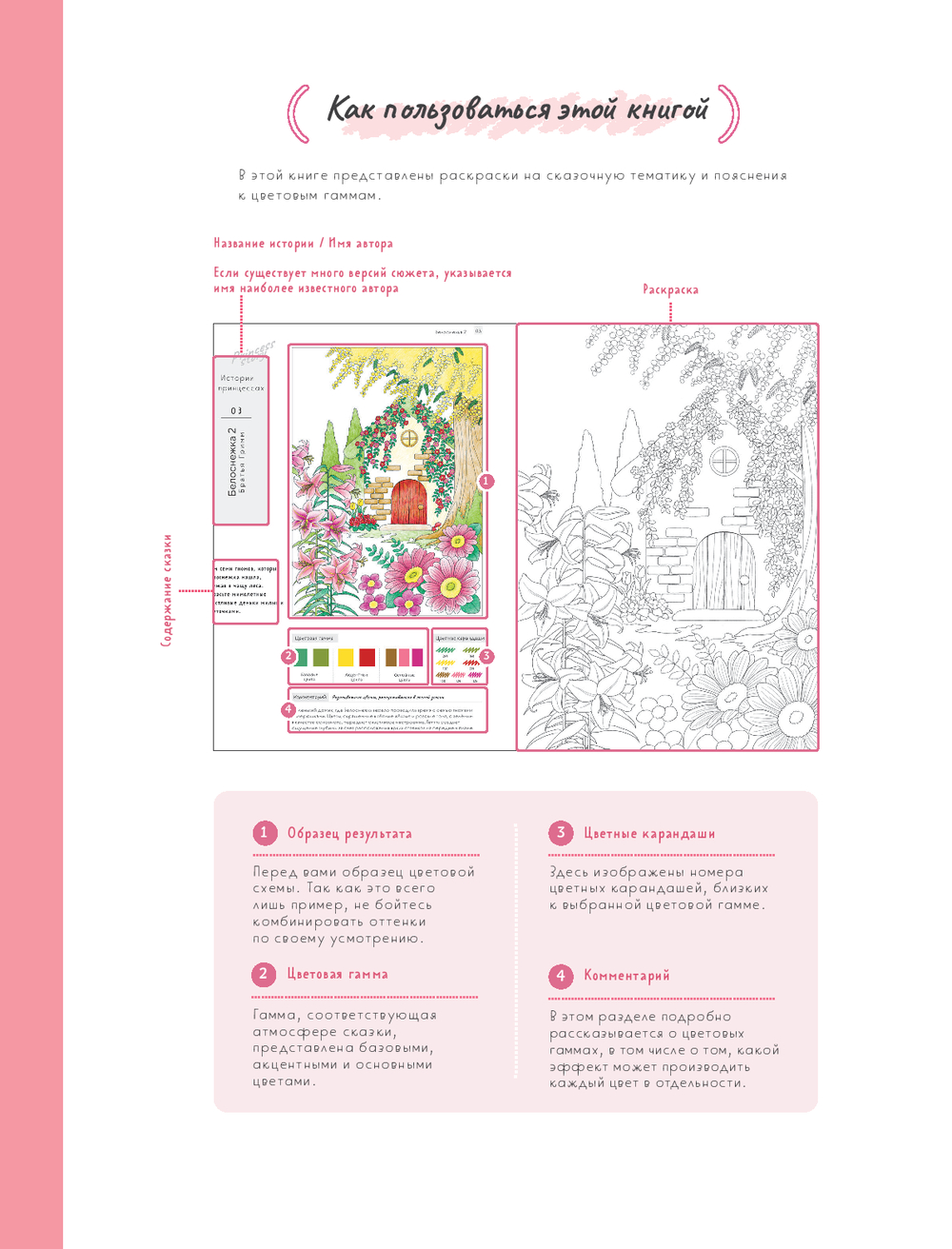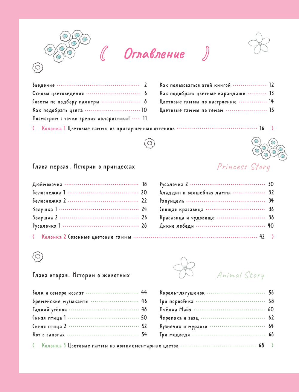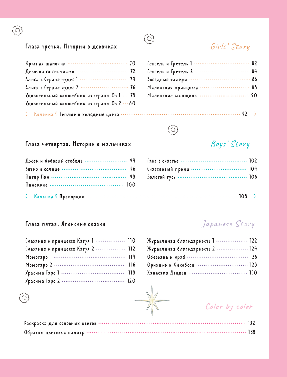 В книге-раскраске японская художница ingetar-e собрала полезные советы и материалы по основам цветовой гармонии и сочетаний, а также рекомендации при выборе оттенков и гаммы. К каждой иллюстрации идет цветной образец колористки, что поможет читателю лучше ориентироваться в выборе творческих решений и не бояться экспериментировать в процессе раскрашивания! Всем теоретическим материалам сопутствуют самые очаровательные сюжеты по мотивам известнейших сказок со всего мира – от Золушки до принцессы Кагуя.