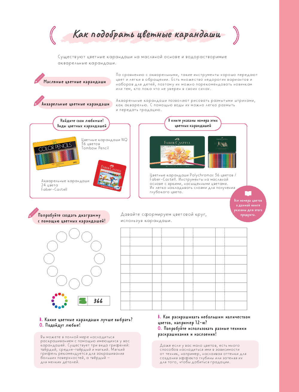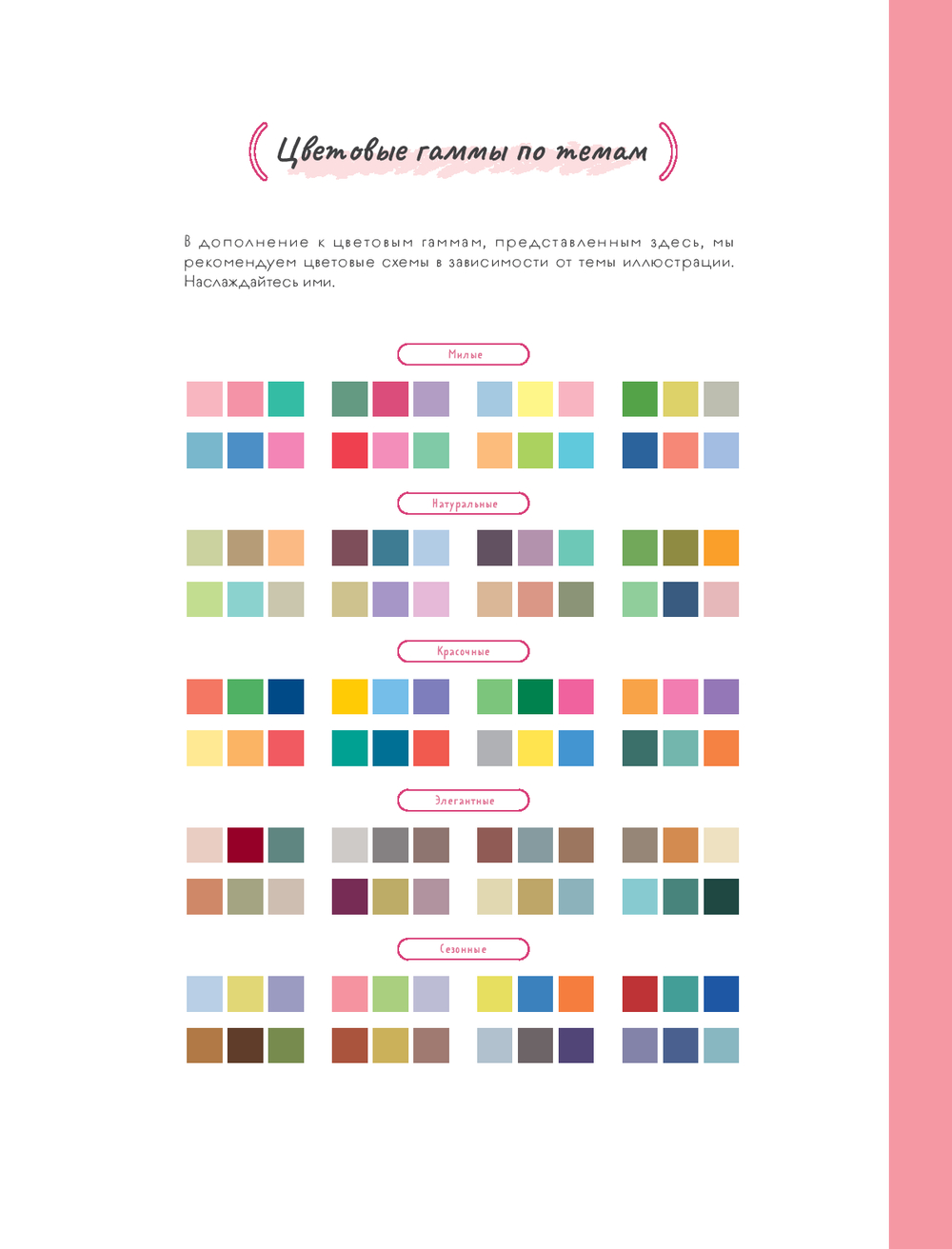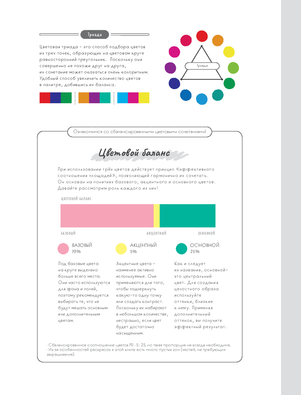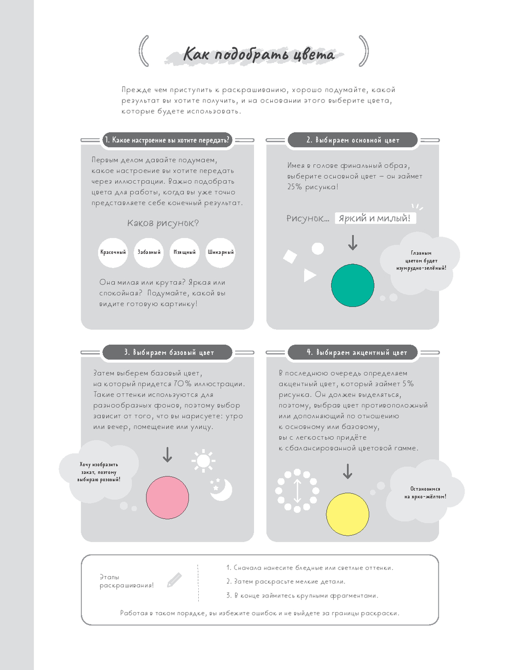 В книге-раскраске японская художница ingetar-e собрала полезные советы и материалы по основам цветовой гармонии и сочетаний, а также рекомендации при выборе оттенков и гаммы. К каждой иллюстрации идет цветной образец колористки, что поможет читателю лучше ориентироваться в выборе творческих решений и не бояться экспериментировать в процессе раскрашивания! Всем теоретическим материалам сопутствуют самые очаровательные сюжеты по мотивам известнейших сказок со всего мира – от Золушки до принцессы Кагуя.