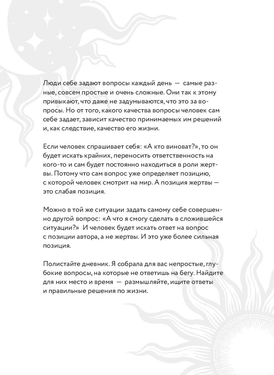 Этот дневник – ваш помощник, который ежедневно будет задавать важные вопросы и напоминать о том, что по-настоящему ценно в вашей жизни. Ответы вы можете записывать или зарисовывать, оформлять в списки и схемы, брать время для размышлений и возвращаться к сложным задачам снова и снова. Главное – отвечать открыто и честно, тогда вы многое узнаете о себе настоящем и расчистите свой путь к лучшей жизни.
