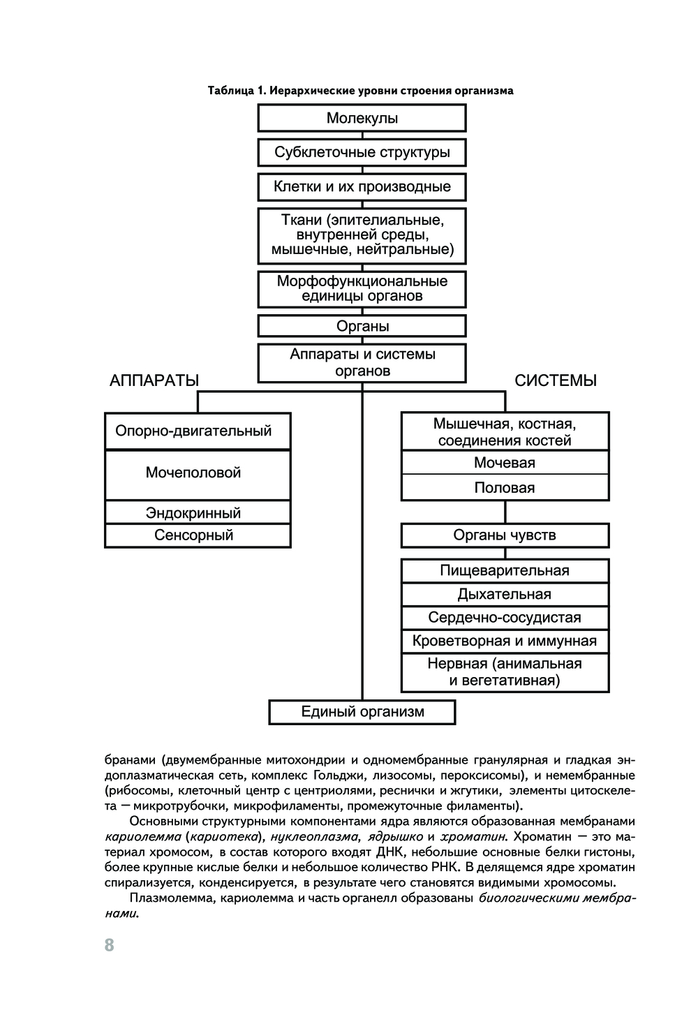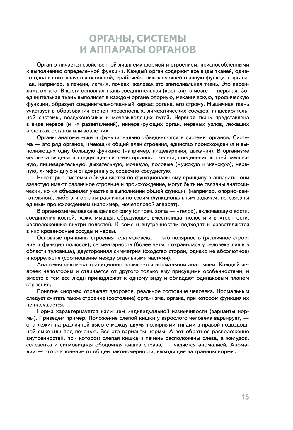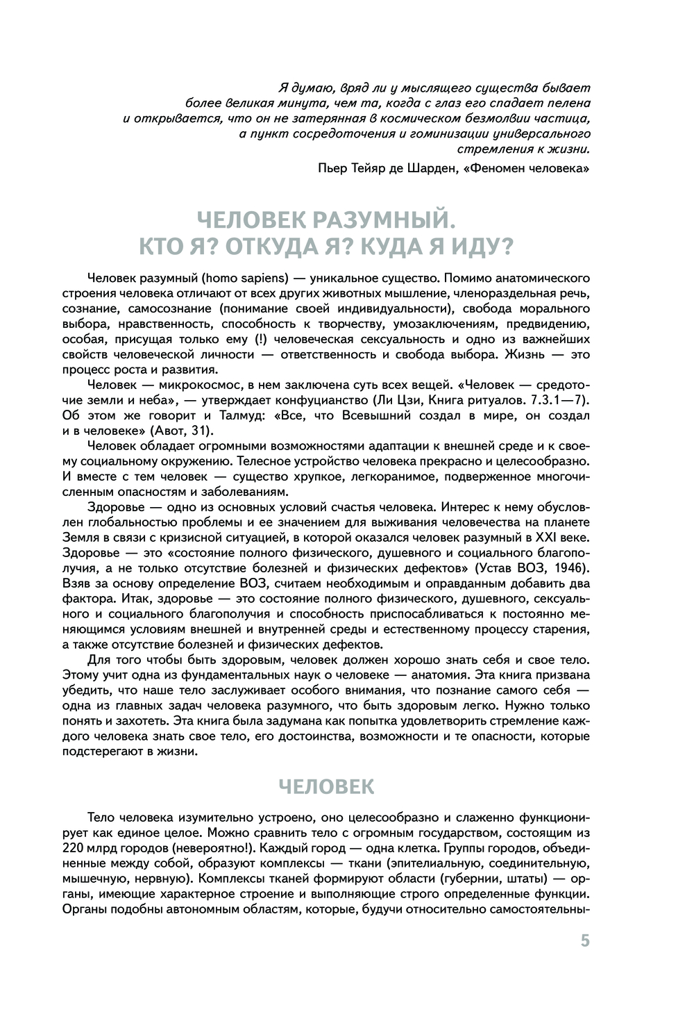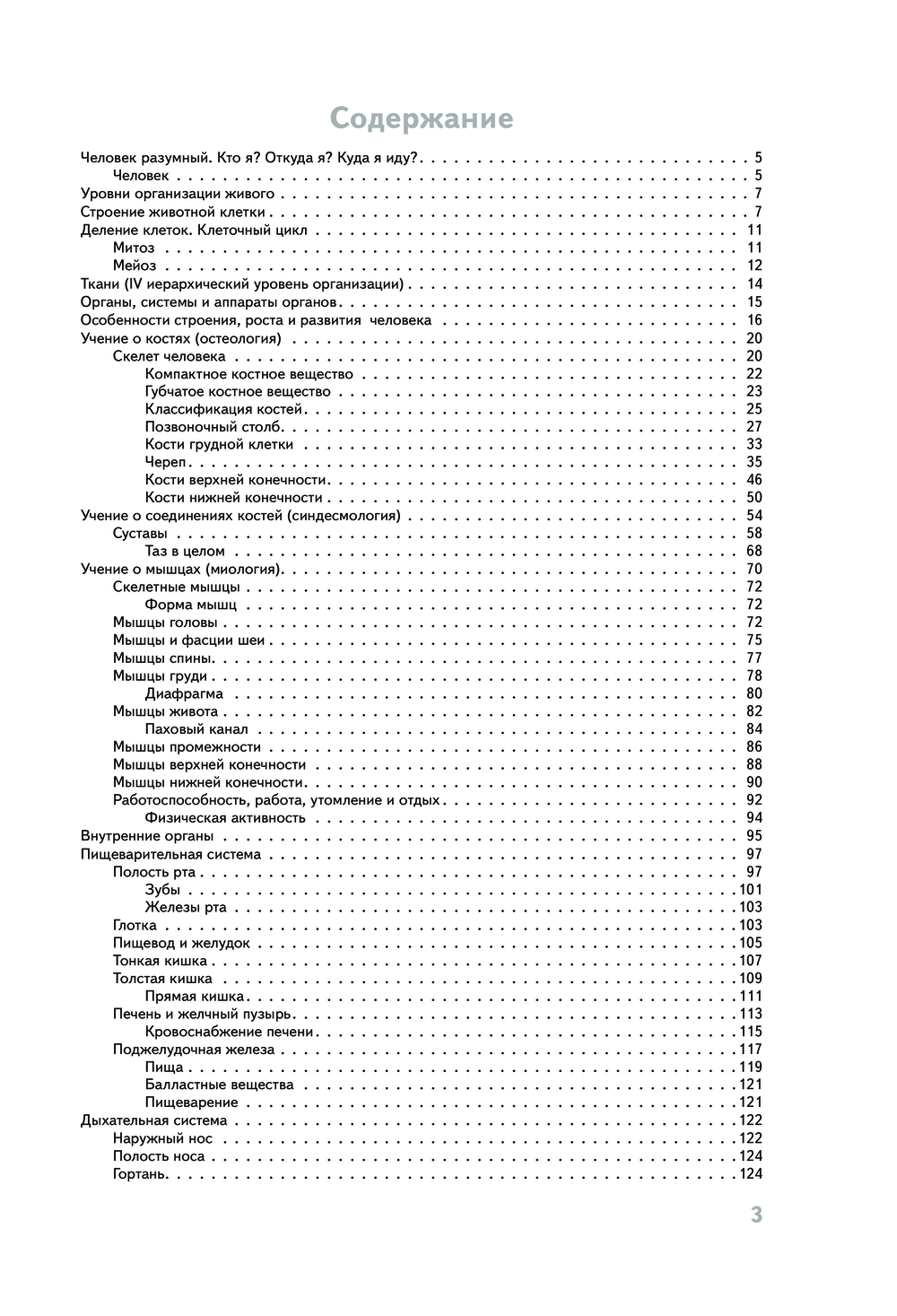 Подробное строение тела приведено в классической последовательности, начиная с живой клетки и опорно-двигательного аппарата и завершая органами чувств. Внутренние органы (пищеварительная, дыхательная системы, мочеполовой аппарат), сердечно-сосудистая система, органы кроветворения и иммунная система, эндокринные железы, нервная система – всё наглядно представлено с учетом результатов новых научных исследований.