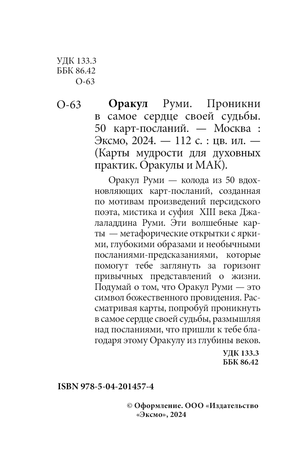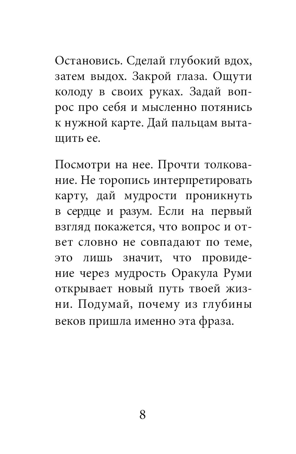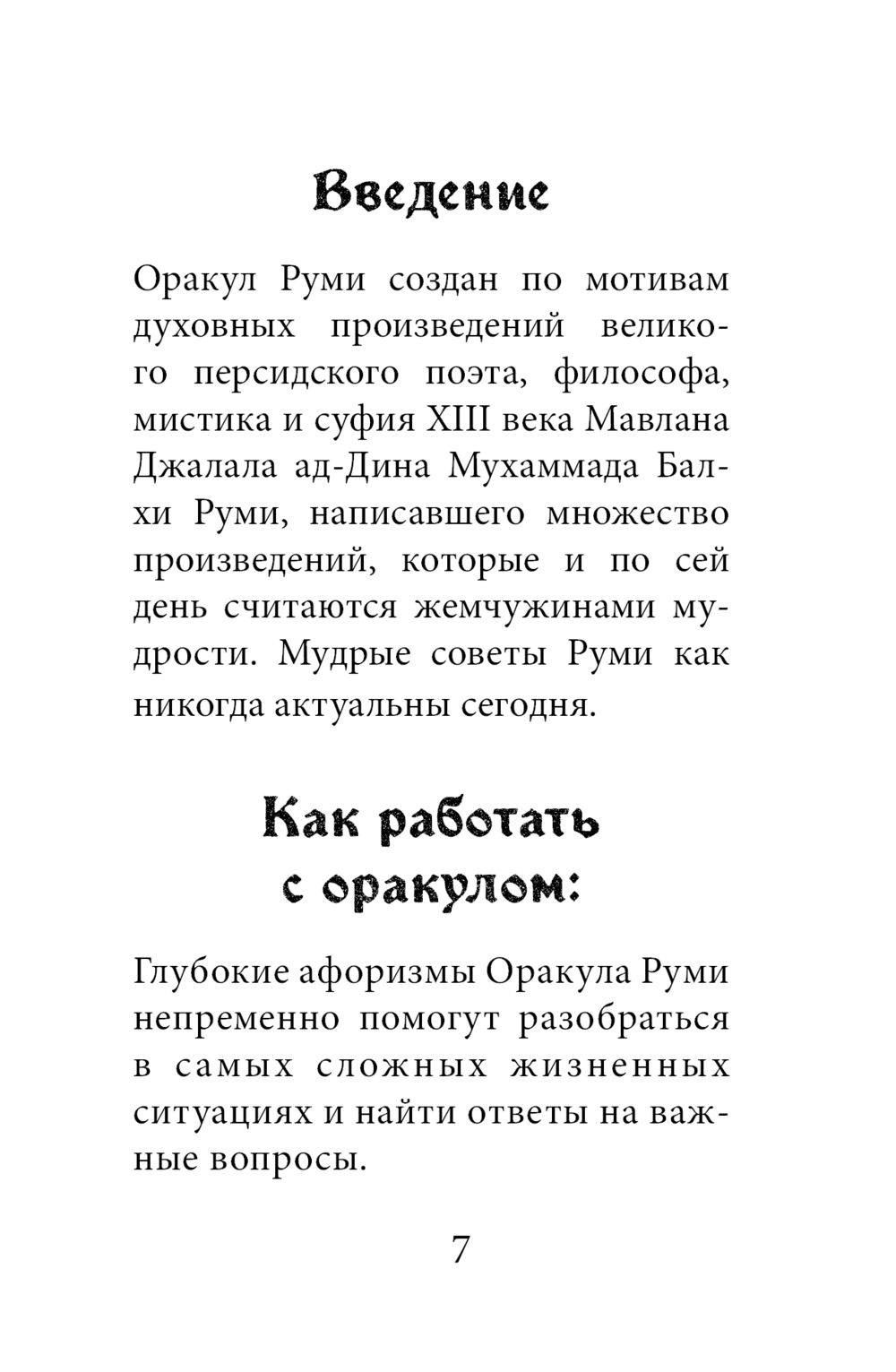 Оракул Руми – колода из 50 вдохновляющих карт-посланий, созданная по мотивам произведений древнего персидского поэта, мистика и суфия ХIII века Джалаладдина Руми. Эти волшебные карты – ни что иное, как метафорические открытки, с яркими, глубокими образами и необычными посланиями-предсказаниями, которые помогут тебе заглянуть за горизонт привычных представлений о жизни, Подумай о том, что Оракул Руми – это символ божественного провидения. Рассматривая карты, попробуй проникнуть в самое сердце своей судьбы, размышляя над посланиями, что пришли к тебе благодаря этому Оракулу из глубины веков.