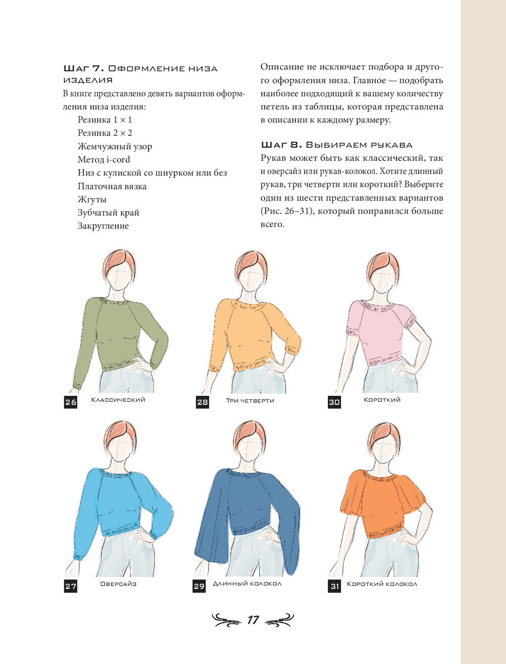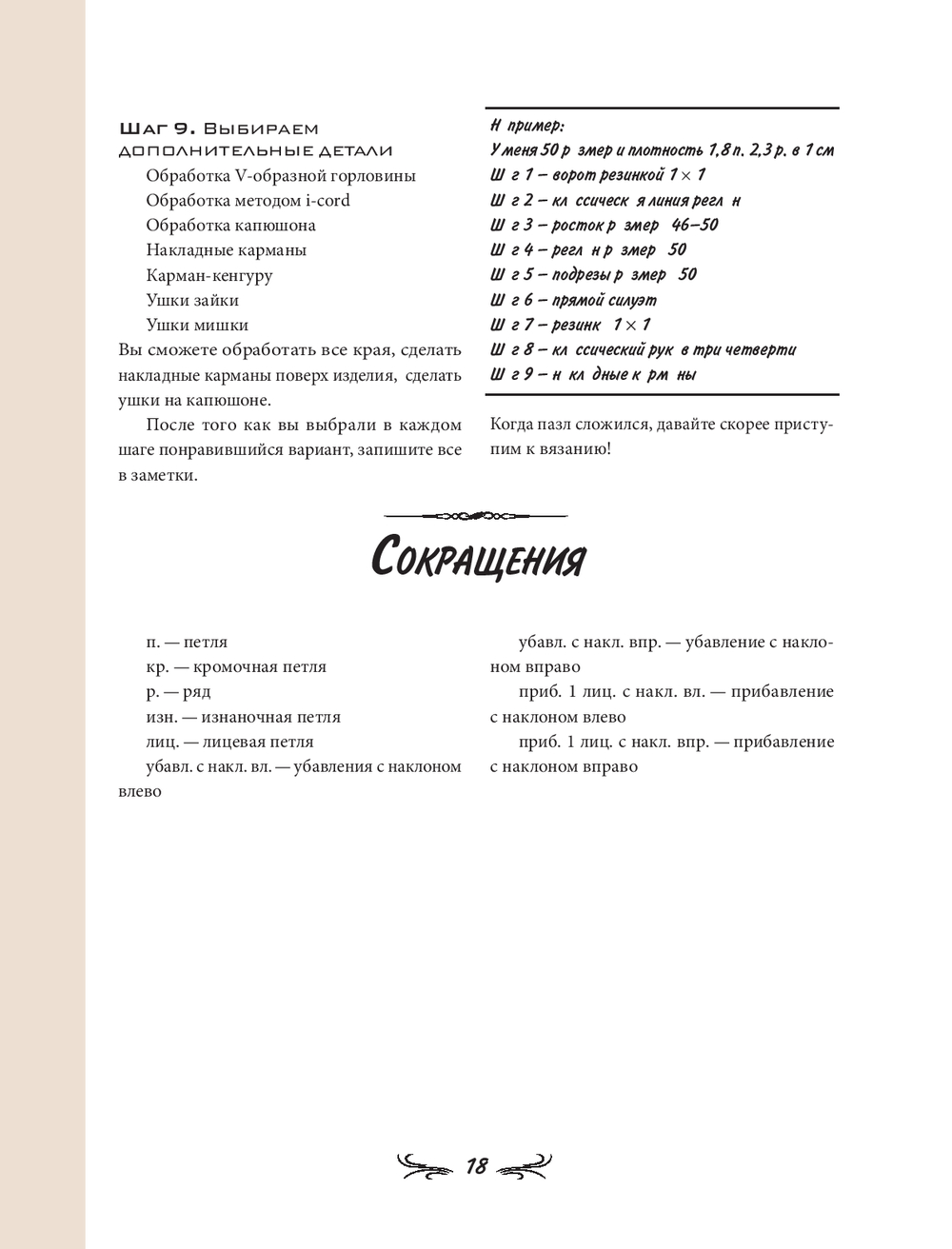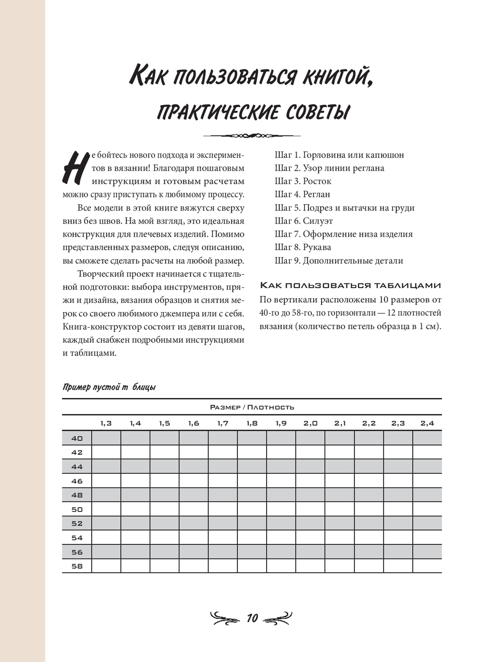 Подставляйте свои параметры и плотность в таблицу, и всего за 9 шагов вы свяжете свой идеальный джемпер, свитер, свитшот, пуловер, худи, тунику или укороченный свитер. Легкая подача материала, пошаговые инструкции и видео-подсказки, – вязальщицы с опытом или без, смогут вязать под чутким сопровождением автора!