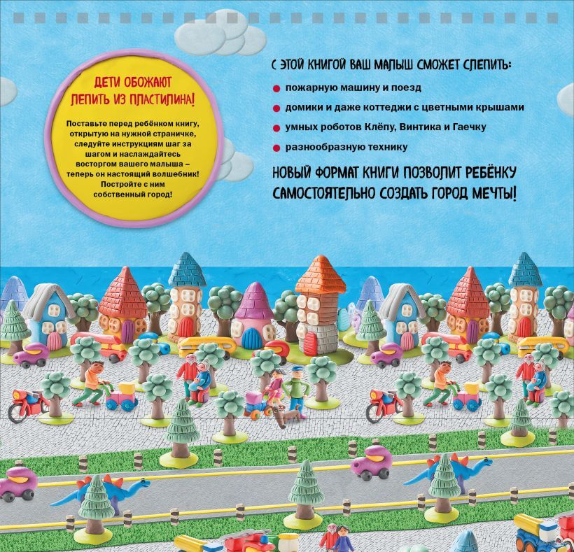 Хотел бы ваш малыш самостоятельно слепить из пластилина самый настоящий город? С разноцветными быстрыми машинками, едущими по шоссе, красивыми уютными домиками, стоящими в тени деревьев, и невероятными чудными роботами? Тогда новый формат книги-бестселлера точно для вас! Поставьте книгу перед ребенком вертикально: странички не будут переворачиваться сами по себе, а малыш не запутается в инструкциях. Процесс лепки из пластилина станет еще более легким и удобным!