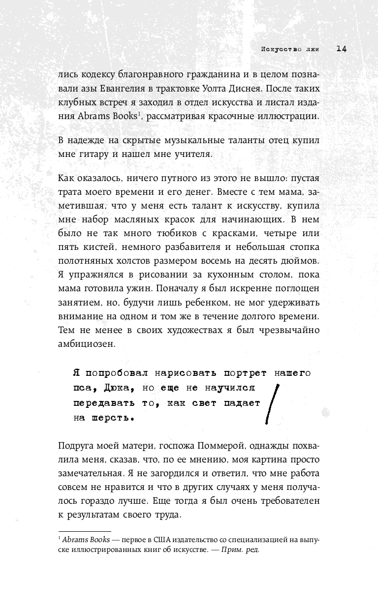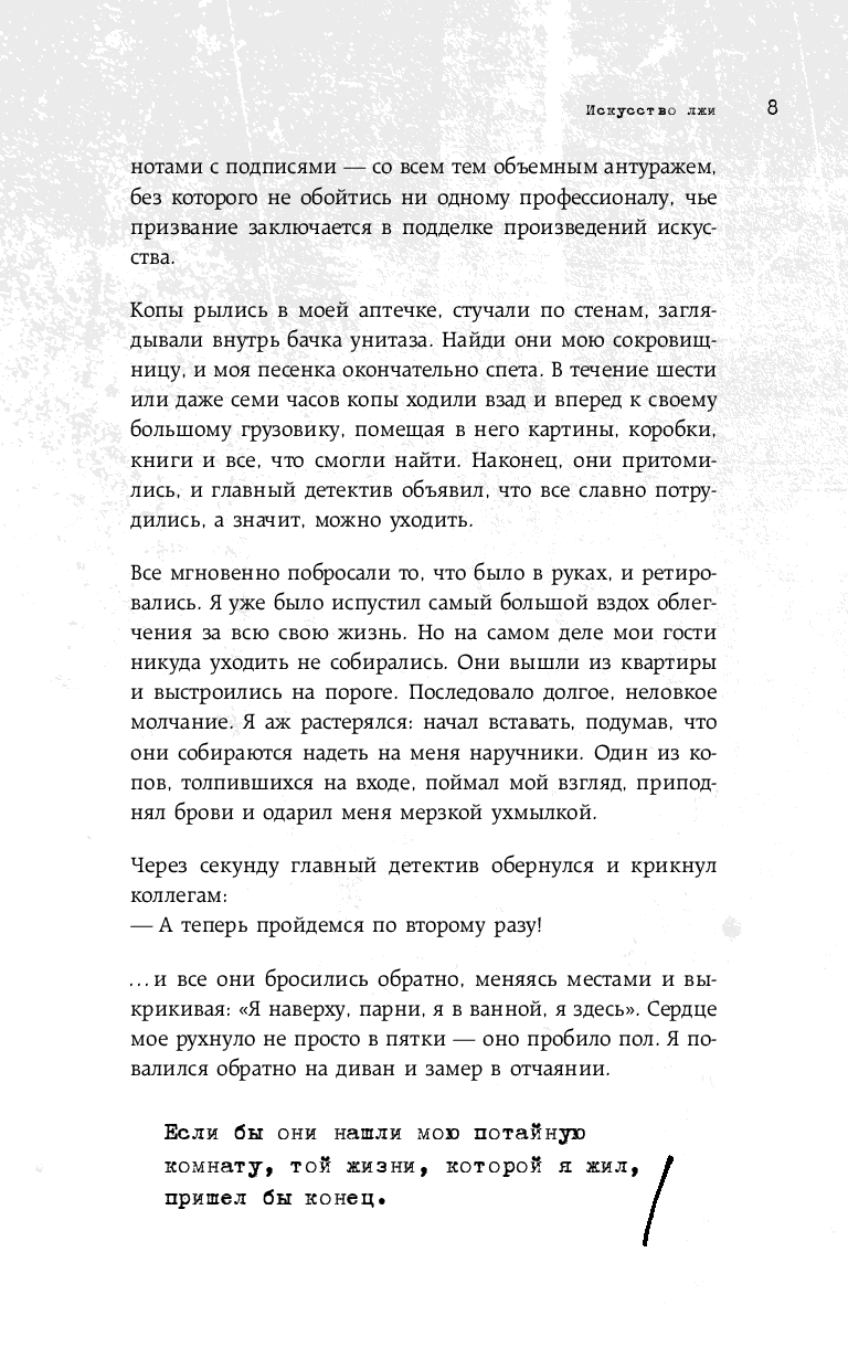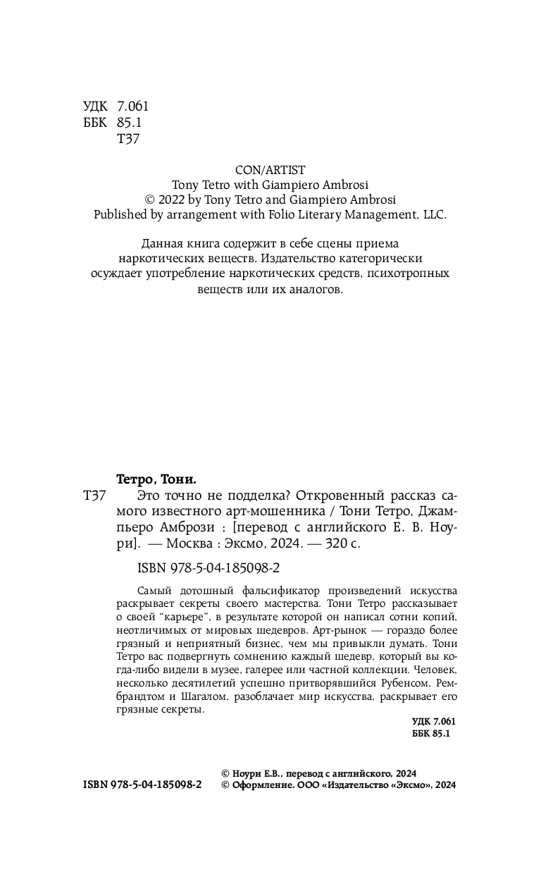 Самый дотошный фальсификатор произведений искусства раскрывает секреты своего мастерства. Тони Тетро рассказывает о своей "карьере", в результате которой он написал сотни копий, неотличимых от мировых шедевров. Арт-рынок – гораздо более грязный и неприятный бизнес, чем мы привыкли думать. Тони Тетро вас подвергнуть сомнению каждый шедевр, который вы когда-либо видели в музее, галерее или частной коллекции. Человек, несколько десятилетий успешно притворявшийся Рубенсом, Рембрандтом и Шагалом, разоблачает мир искусства, раскрывает его грязные секреты.