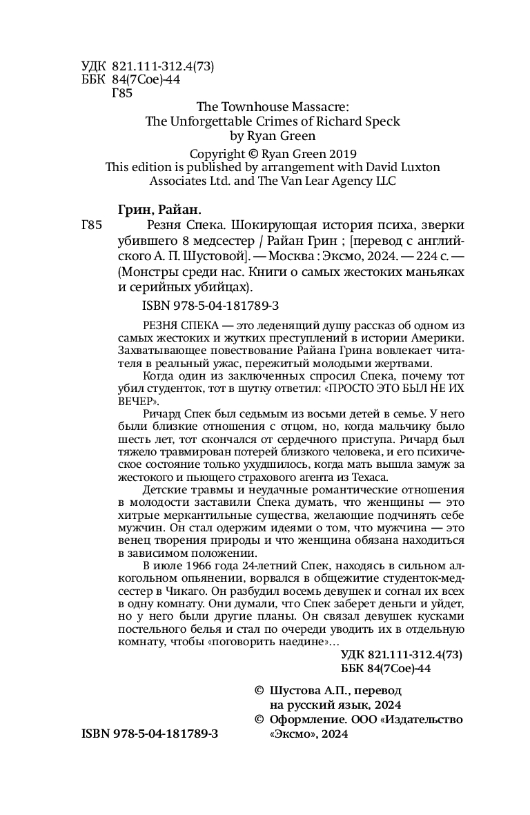 Леденящий душу рассказ об одном из самых жестоких и жутких преступлений в истории Америки. Захватывающее повествование Райана Грина вовлекает читателя в реальный ужас, пережитый молодыми жертвами.