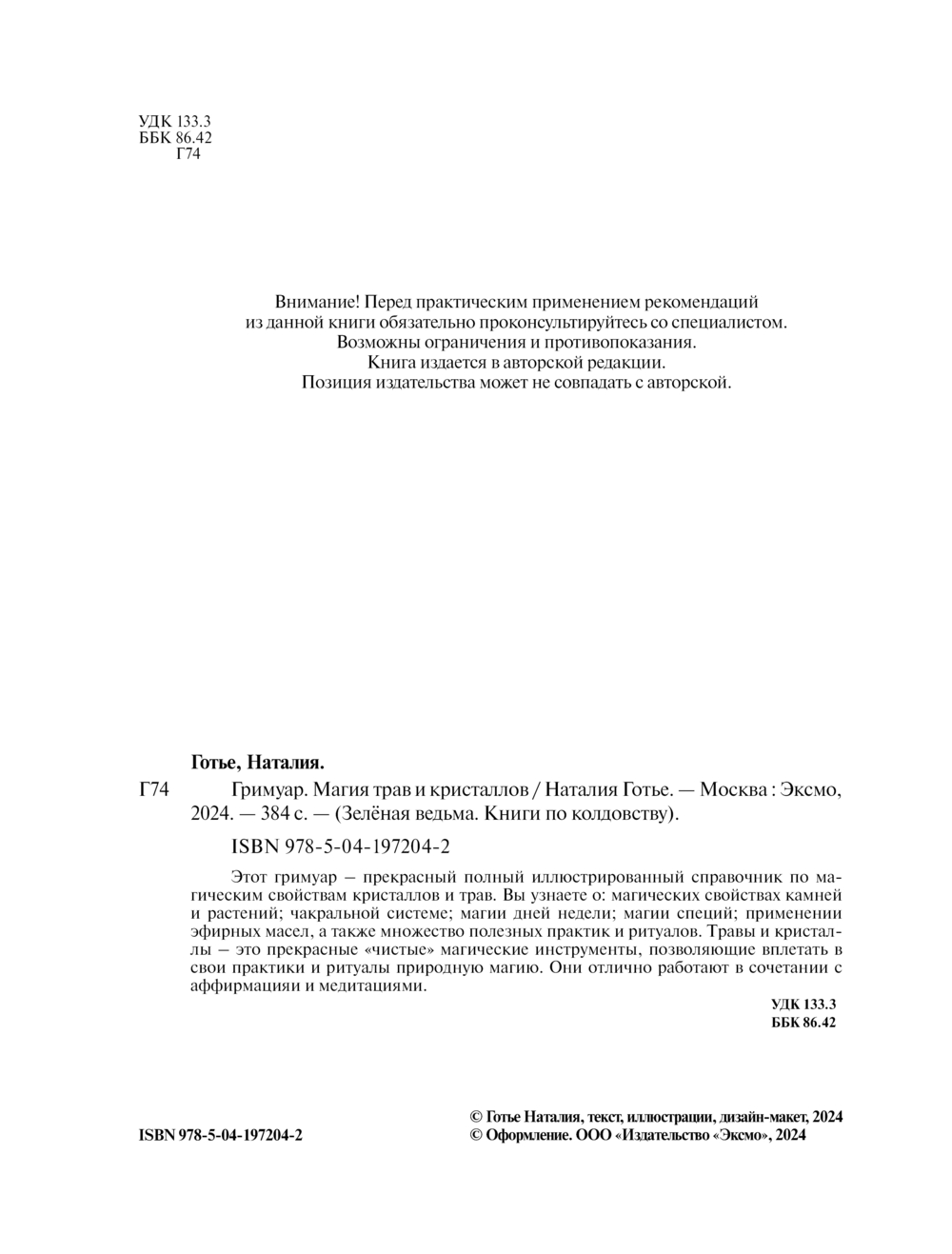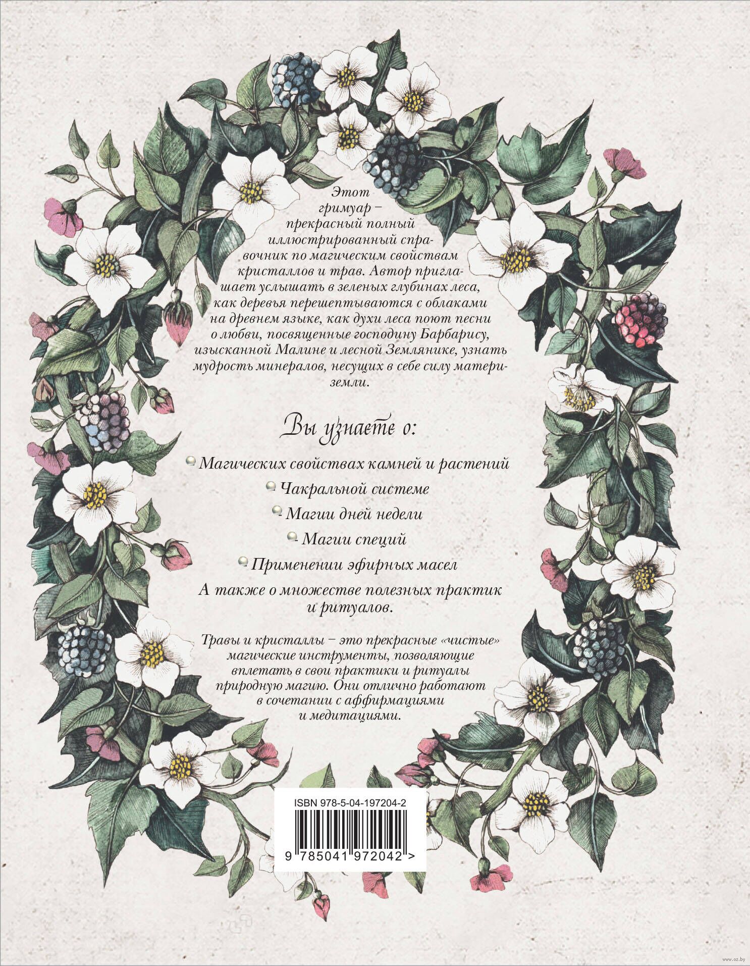 Этот гримуар – прекрасный полный иллюстрированный справочник по магическим свойствам кристаллов и трав. Вы узнаете о: магических свойствах камней и растений; чакральной системе; магии дней недели; магии специй; применении эфирных масел, а также множество полезных практик и ритуалов. Травы и кристаллы – это прекрасные "чистые" магические инструменты, позволяющие вплетать в свои практики и ритуалы природную магию. Они отлично работают в сочетании с аффирмацияи и медитациями.