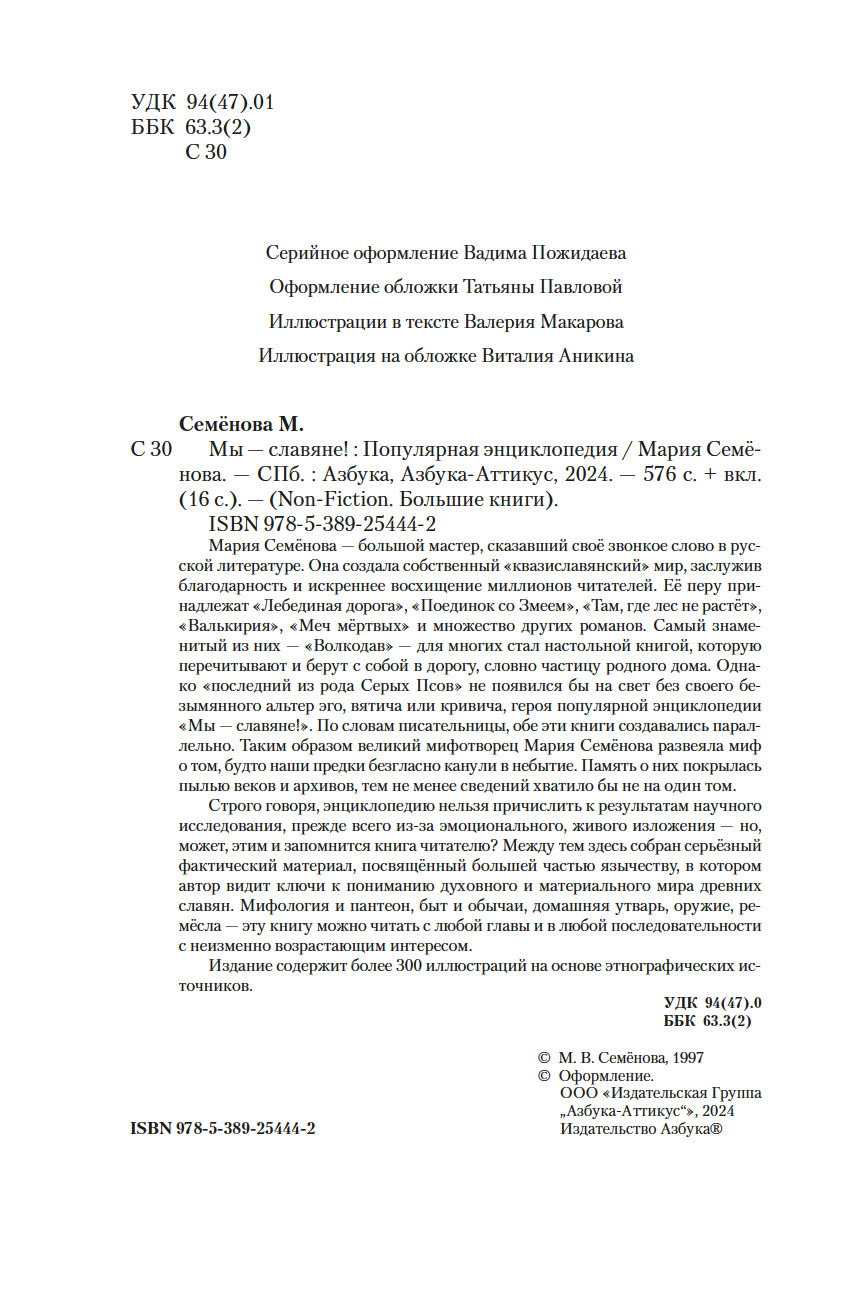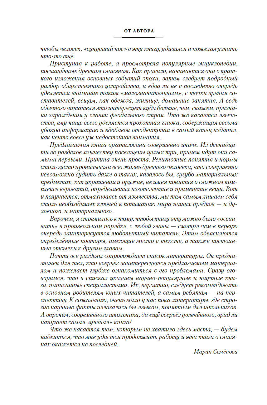 Мария Семёнова – большой мастер, сказавший свое звонкое слово в русской литературе. Она создала собственный "квазиславянский" мир, заслужив благодарность и искреннее восхищение миллионов читателей. Ее перу принадлежат "Лебединая дорога", "Поединок со Змеем", "Там, где лес не растет", "Валькирия", "Меч мертвых" и множество других романов. Самый знаменитый из них – "Волкодав" – для многих стал настольной книгой, которую перечитывают и берут с собой в дорогу, словно частицу родного дома. Однако "последний из рода Серых Псов" не появился бы на свет без своего безымянного альтер эго, вятича или кривича, героя популярной энциклопедии "Мы – славяне!". По словам писательницы, обе эти книги создавались параллельно. Таким образом великий мифотворец Мария Семёнова развеяла миф о том, будто наши предки безгласно канули в небытие. Память о них покрылась пылью веков и архивов, тем не менее сведений хватило бы не на один том.