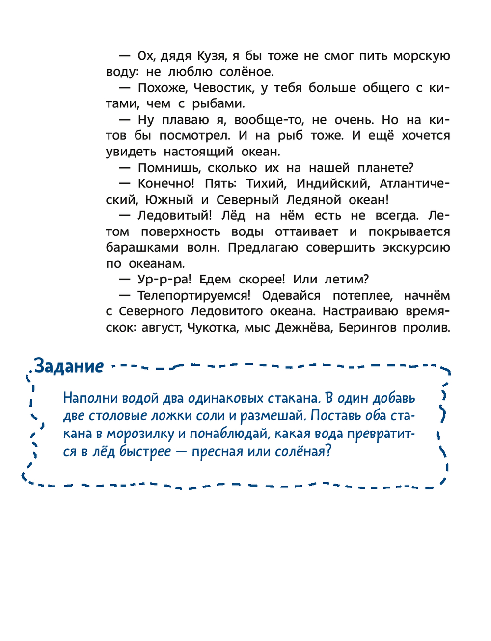 В новой энциклопедии Чевостик и дядя Кузя найдут ответы на эти и многие другие вопросы и отправятся в путешествие по морям и океанам Земли. Они побывают во всех климатических зонах и увидят всё разнообразие морского мира. Удивительные животные, растения, которые трудно себе представить, таинственные обитатели океанических глубин, морские гиганты, которые кажутся ожившими персонажами легенд, ждут наших героев.