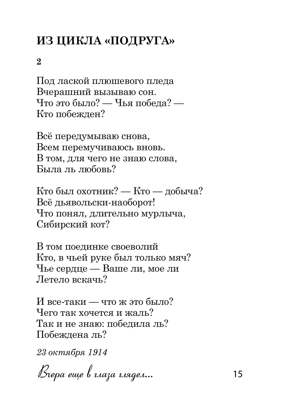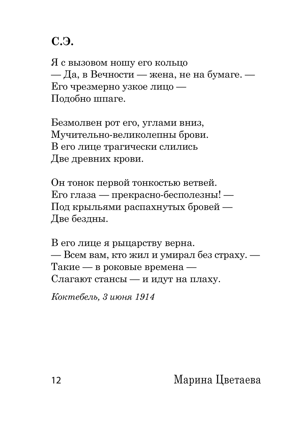 Настоящий сборник составили стихотворения Марины Цветаевой, в основном написанные в эмиграции. Во второй и третий разделы вошли преимущественно произведения из последнего прижизненного сборника 1940 года, который ей не удалось напечатать. А в первом читатель найдёт стихи, давно ставшие известными песнями: "Мне нравится, что Вы больны не мной", "Под лаской плюшевого пледа", "Вчера еще в глаза глядел" и другие. Наверное, никто из поэтов Серебряного века так пронзительно и откровенно, с такой эмоциональной точностью, как М. Цветаева, не написал о себе, о жизни, о творчестве и о любви. Ее поэтические строки восхищают виртуозностью создания, слог завораживает, образы потрясают воплощением.