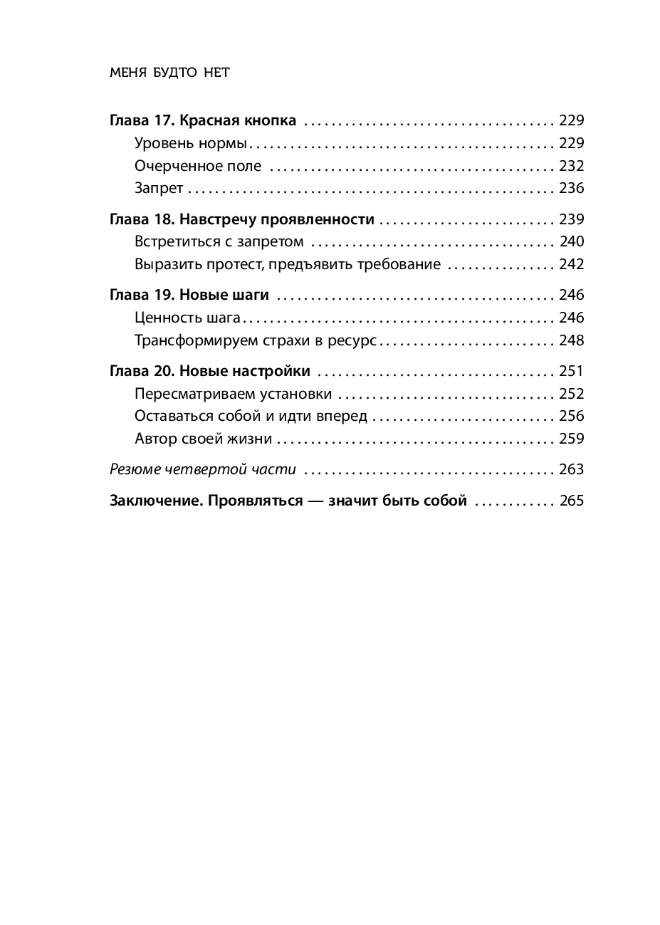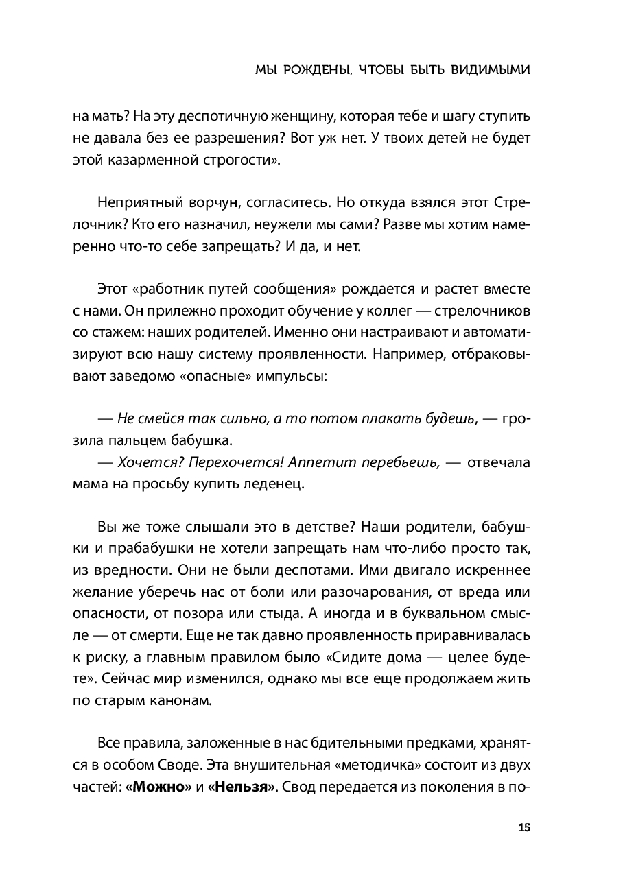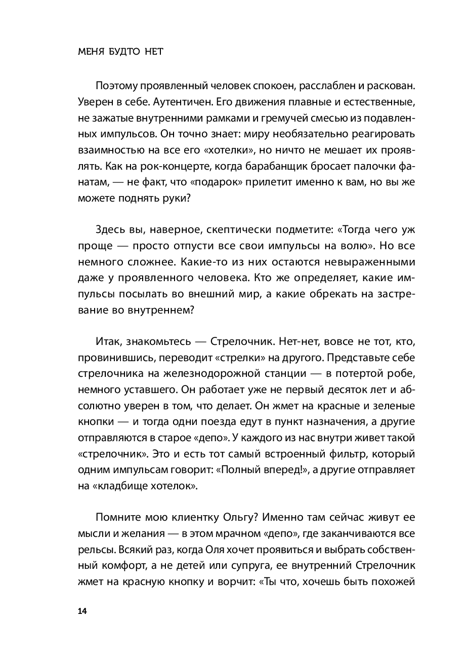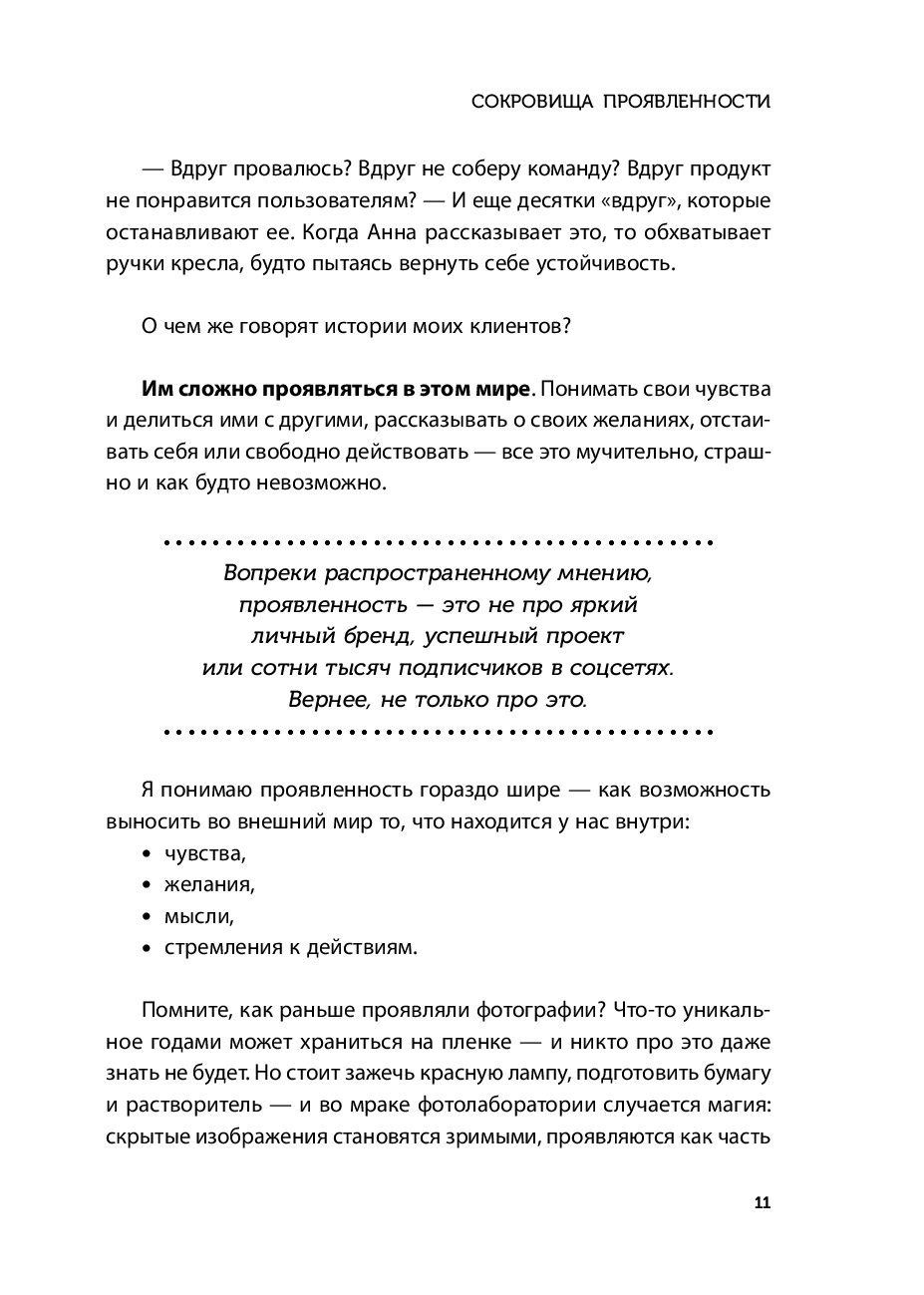 Проявлять в мир свои чувства, желания и идеи абсолютно естественно. Однако, теряя этот ценный навык, мы начинаем жить из "надо", откладывая самих себя на потом, и ощущаем, что нас в жизни будто и нет. Автор этой терапевтичной книги, Ирина Тева Кумар, интегративный психолог, преподаватель Московского института психоанализа, разработала мягкую и безопасную методику работы по возвращению проявленности.