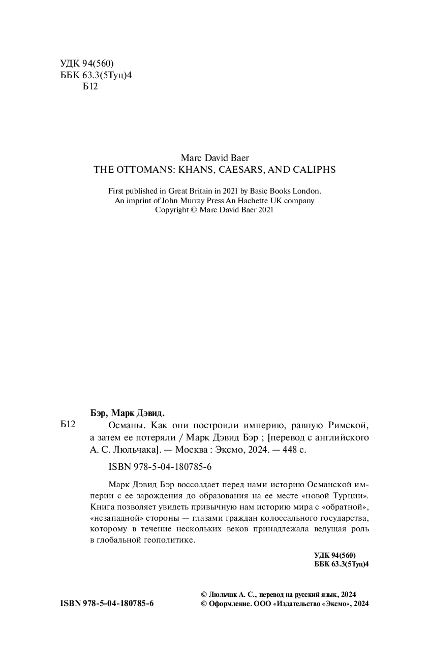 Марк Дэвид Бэр воссоздает перед нами историю Османской империи с ее зарождения до образования на ее месте "новой Турции". Книга позволяет увидеть привычную нам историю мира с "обратной", "незападной" стороны – глазами граждан колоссального государства, которому в течение нескольких веков принадлежала ведущая роль в глобальной геополитике.