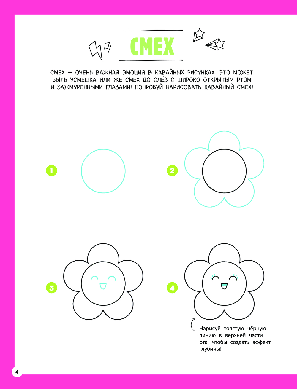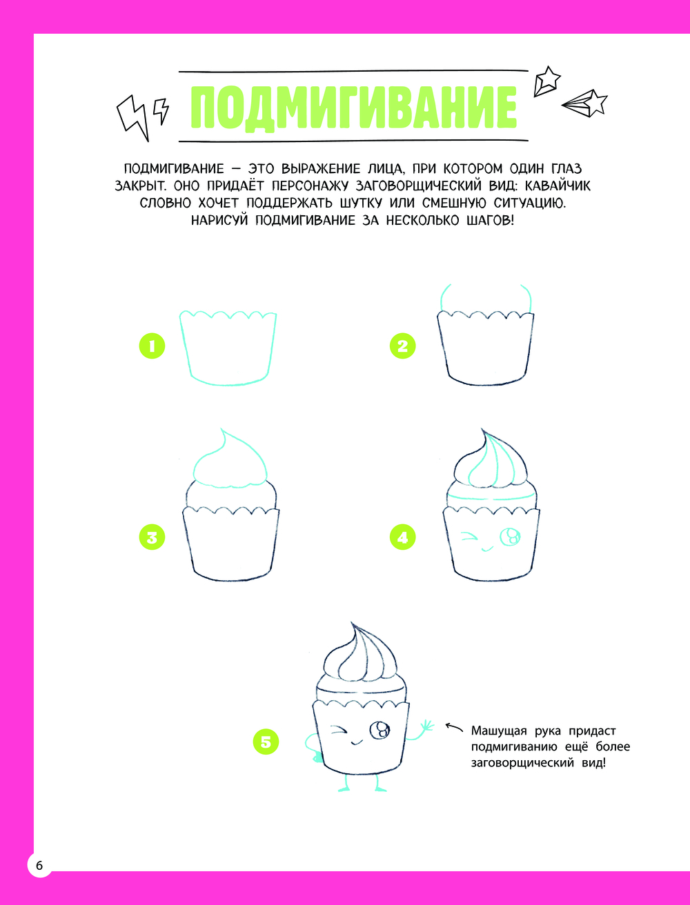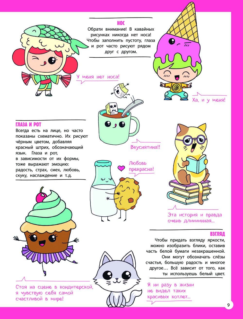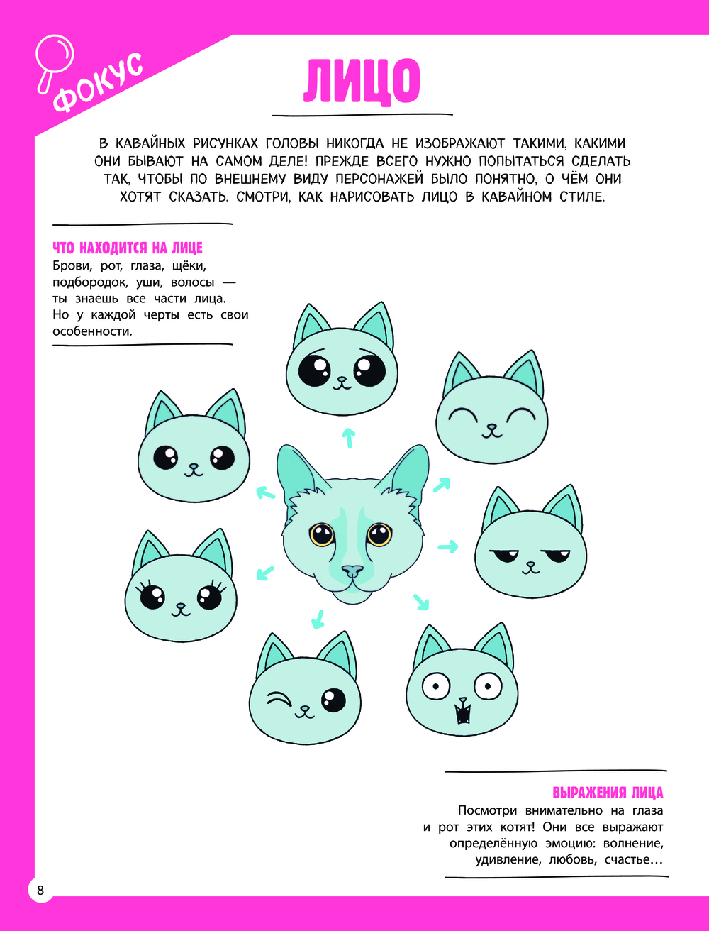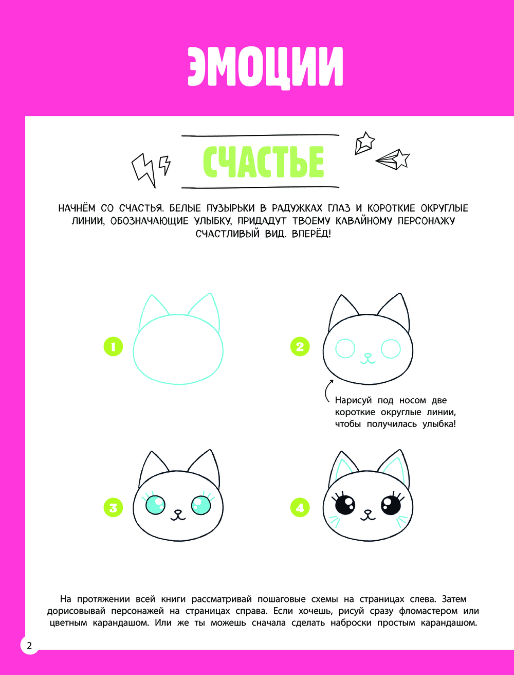 Более 30 пошаговых схем, начинающихся с самых простых элементов: ты можешь отталкиваться от уже нарисованных фигур. Примеры рисунков и советы, которые помогут тебе понять особенности стиля kawaii. Закончив уроки в книге, ты можешь повторить рисунки там, где тебе хочется!