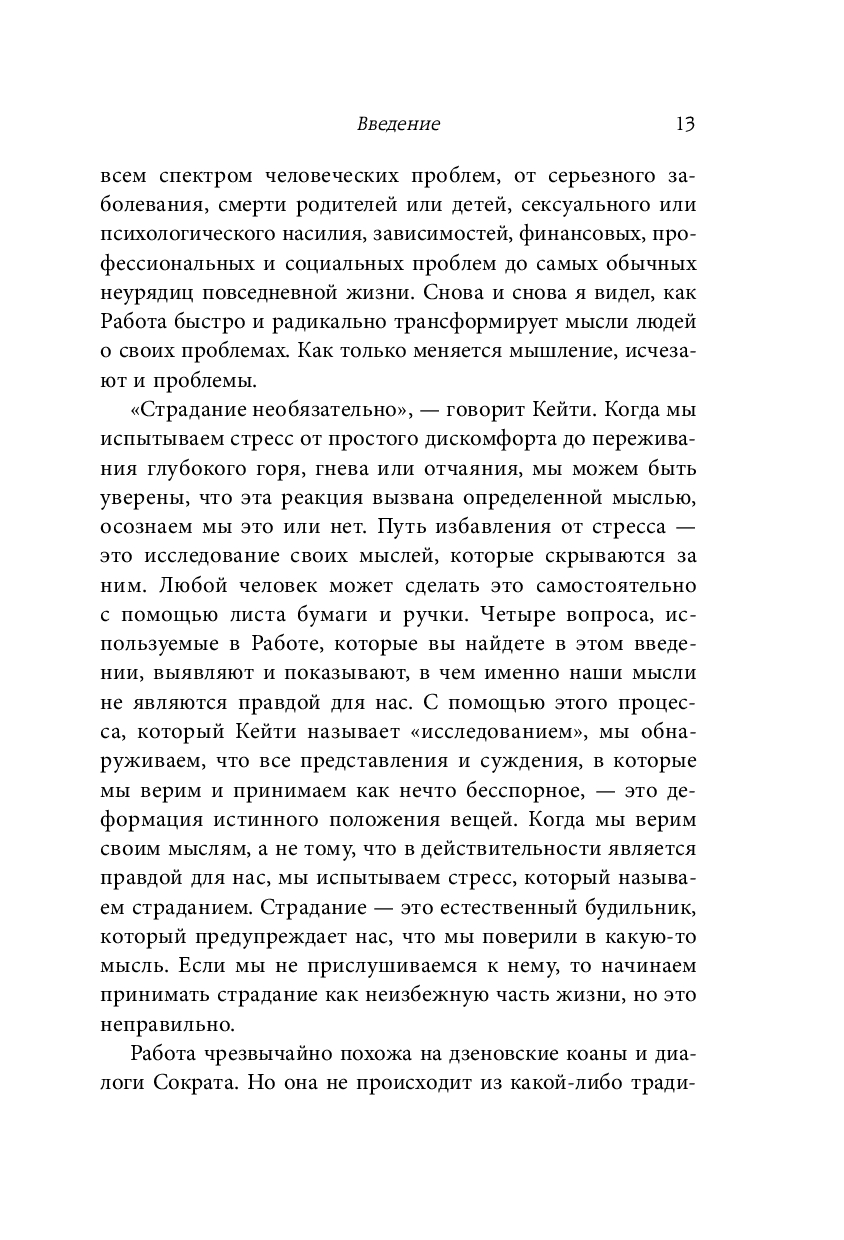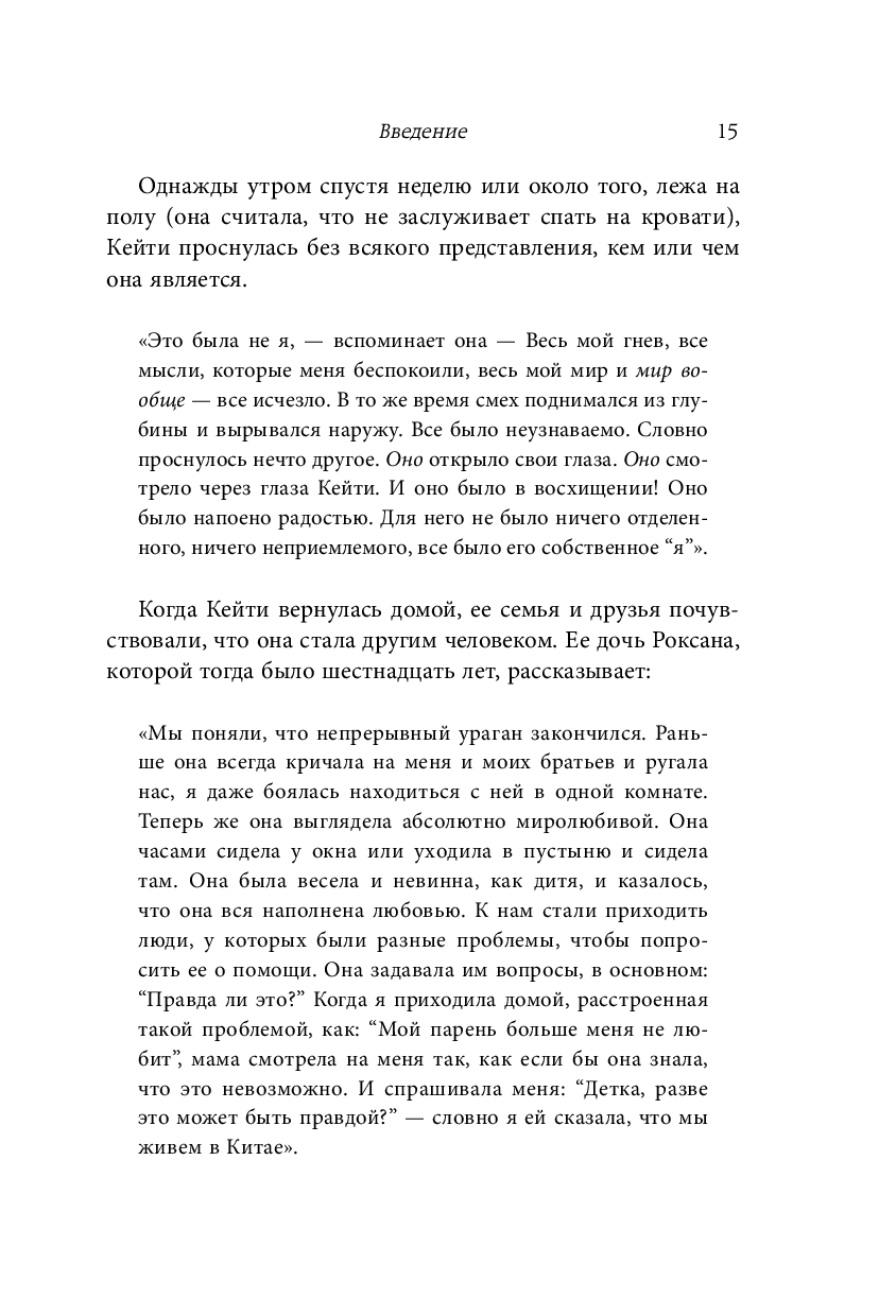 "Любить то, что есть" покажет вам шаг за шагом, на ясных и ярких примерах, как именно использовать этот РЕВОЛЮЦИОННЫЙ МЕТОД для себя. Вы увидите, как люди работают с Кэйти над широким спектром повседневных трудностей: от жены, готовой бросить мужа, потому что он хочет больше секса, до рабочего, парализованного страхом терроризма. Многие люди через 4 простых вопроса и переворот открыли для себя способность решать любые проблемы. Они говорят, что через РАБОТУ испытывают чувство прочного мира и находят ясность и энергию, чтобы действовать, даже в ситуациях, которые ранее казались невозможными.